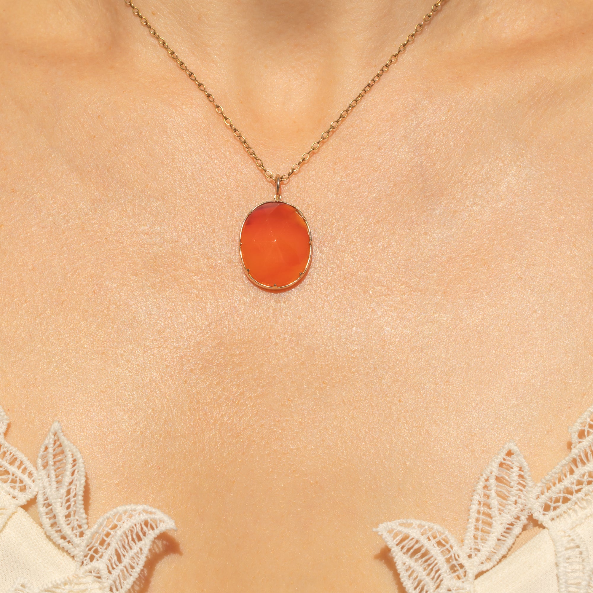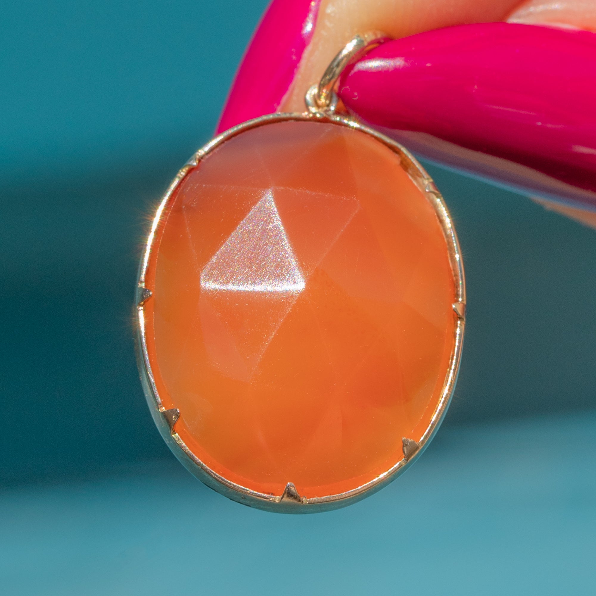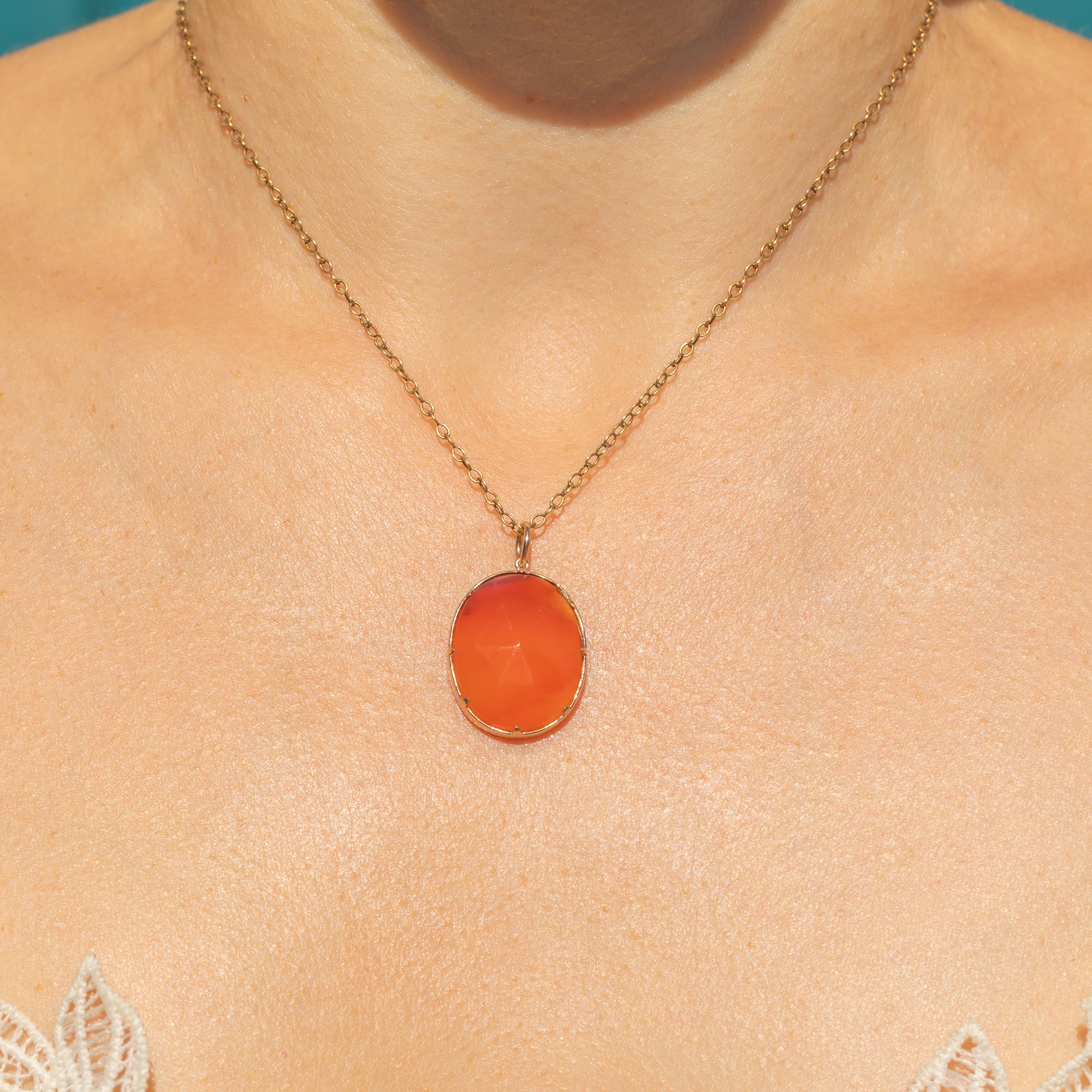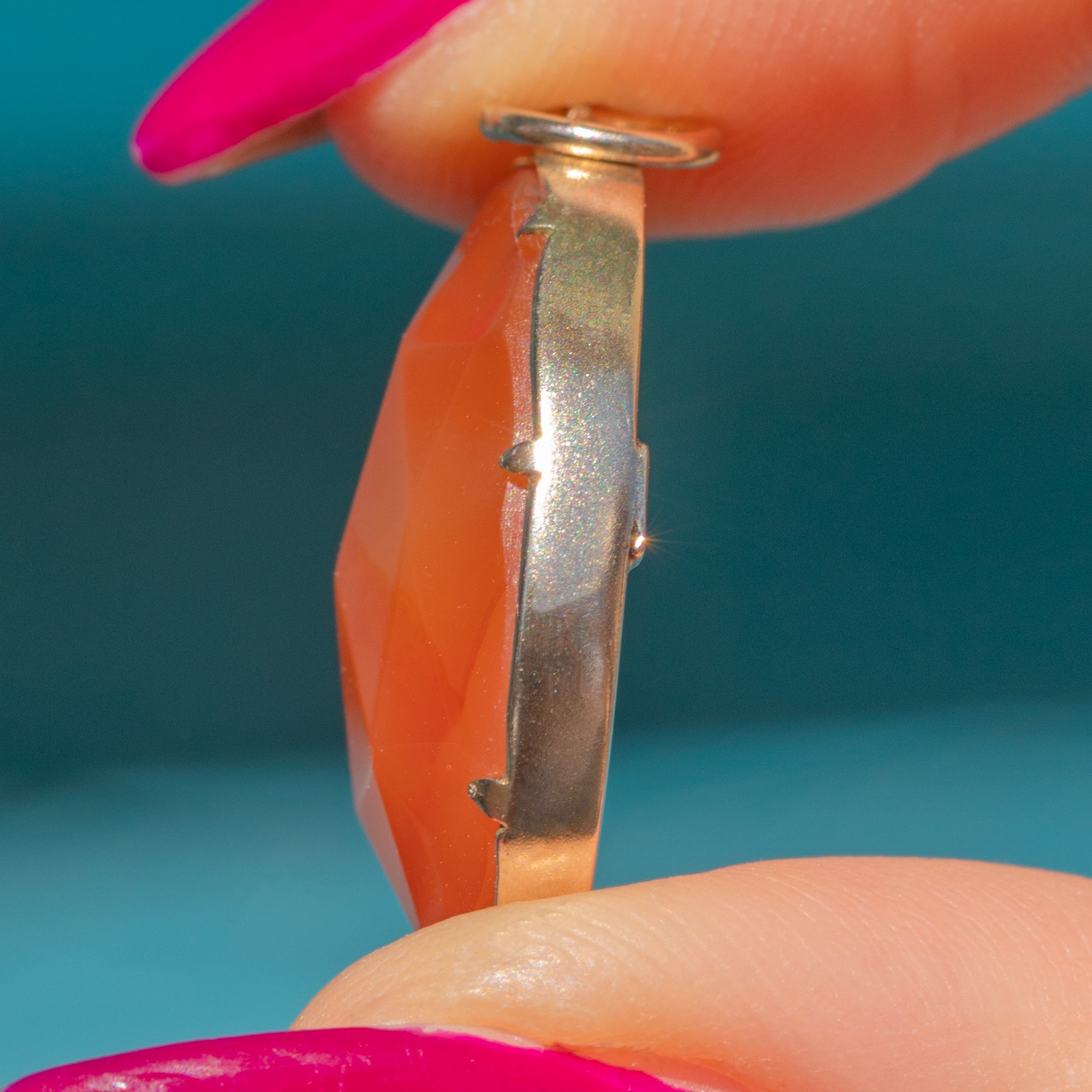 This antique 9ct Gold pendant suspends a spectacular faceted, saturated Carnelian gemstone, embodying its sunset nickname with its fiery tones for which it is so revered.