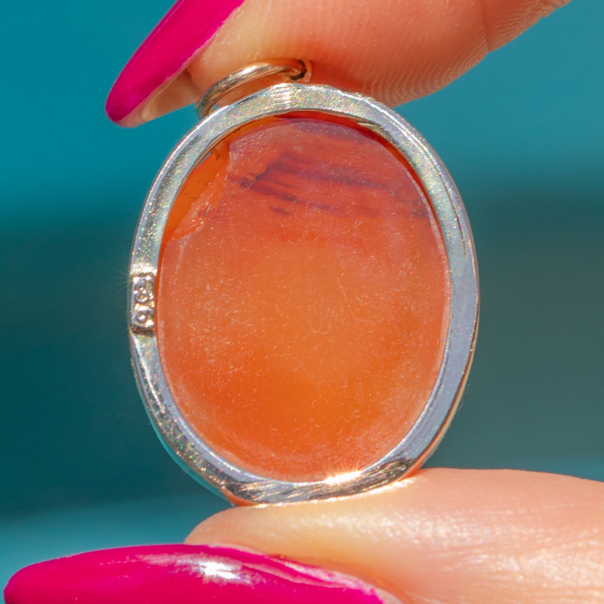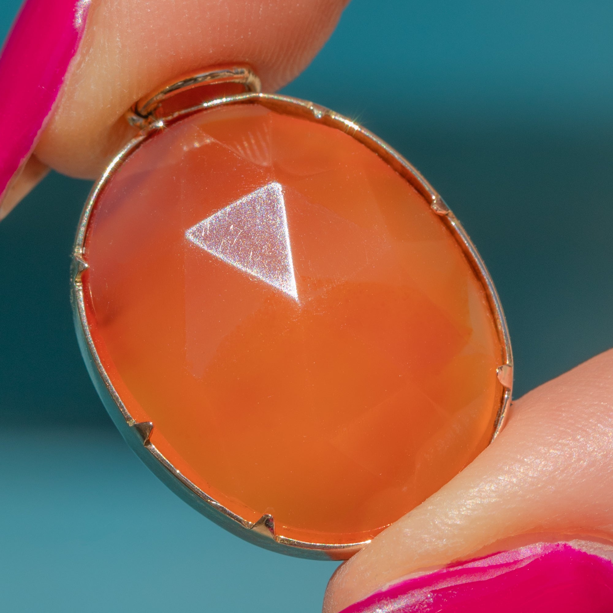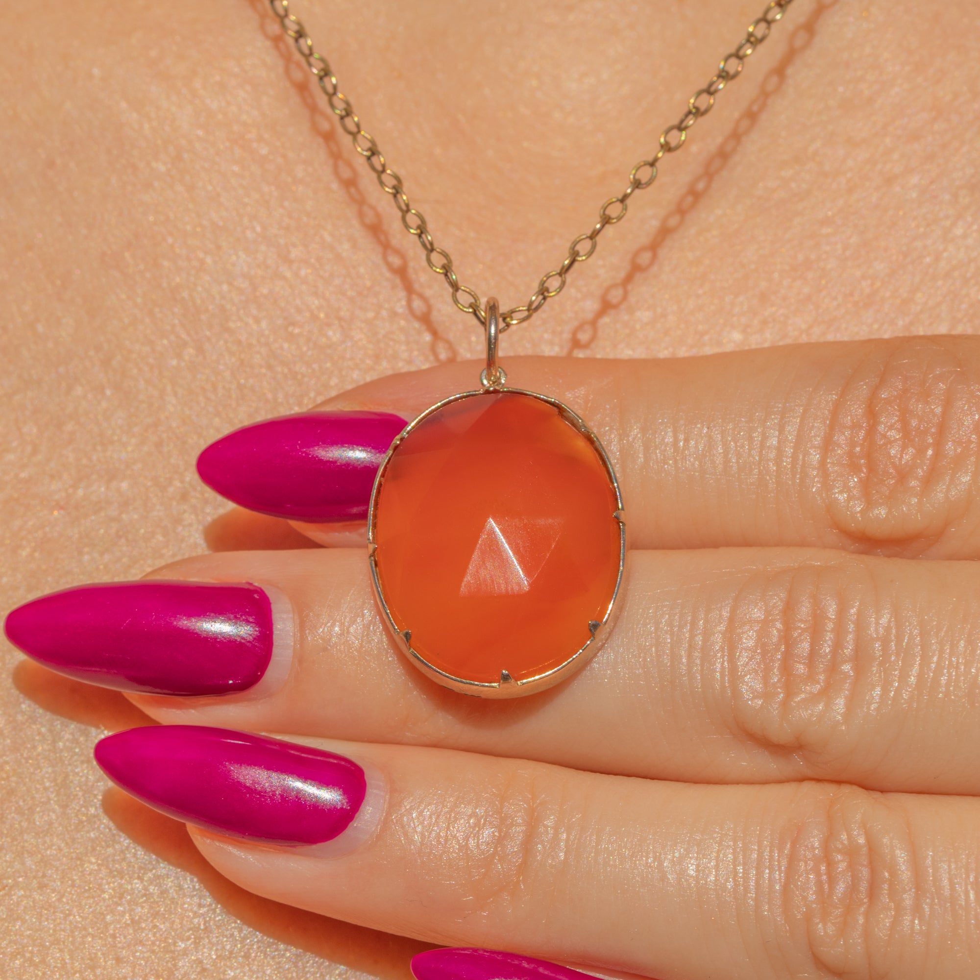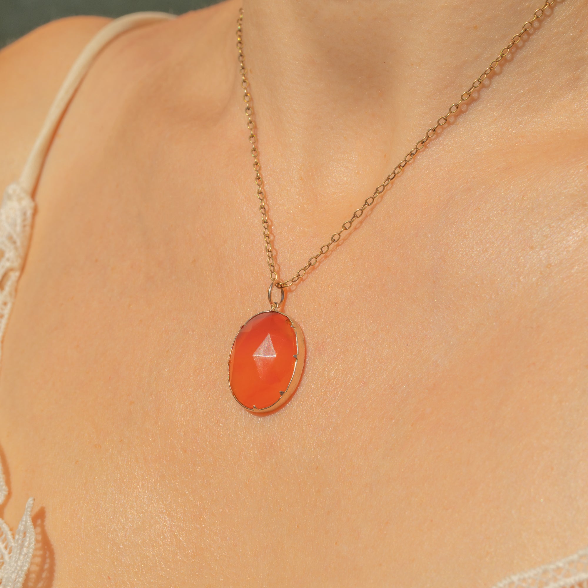 This antique 9ct Gold pendant suspends a spectacular faceted, saturated Carnelian gemstone, embodying its sunset nickname with its fiery tones for which it is so revered.
