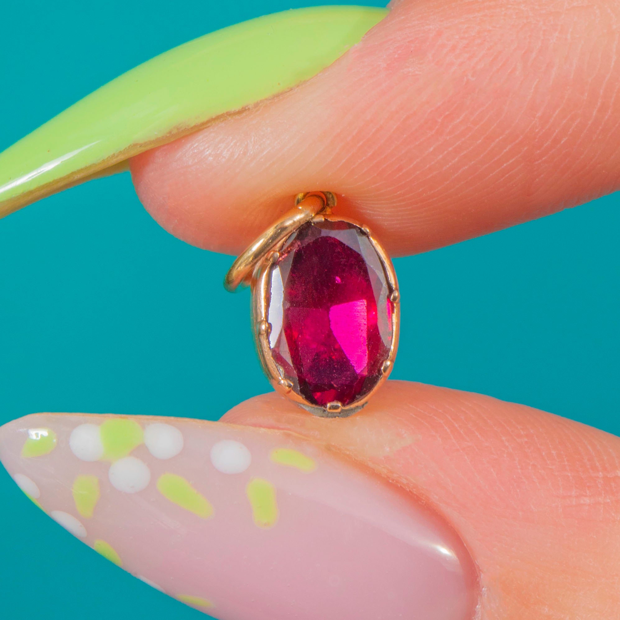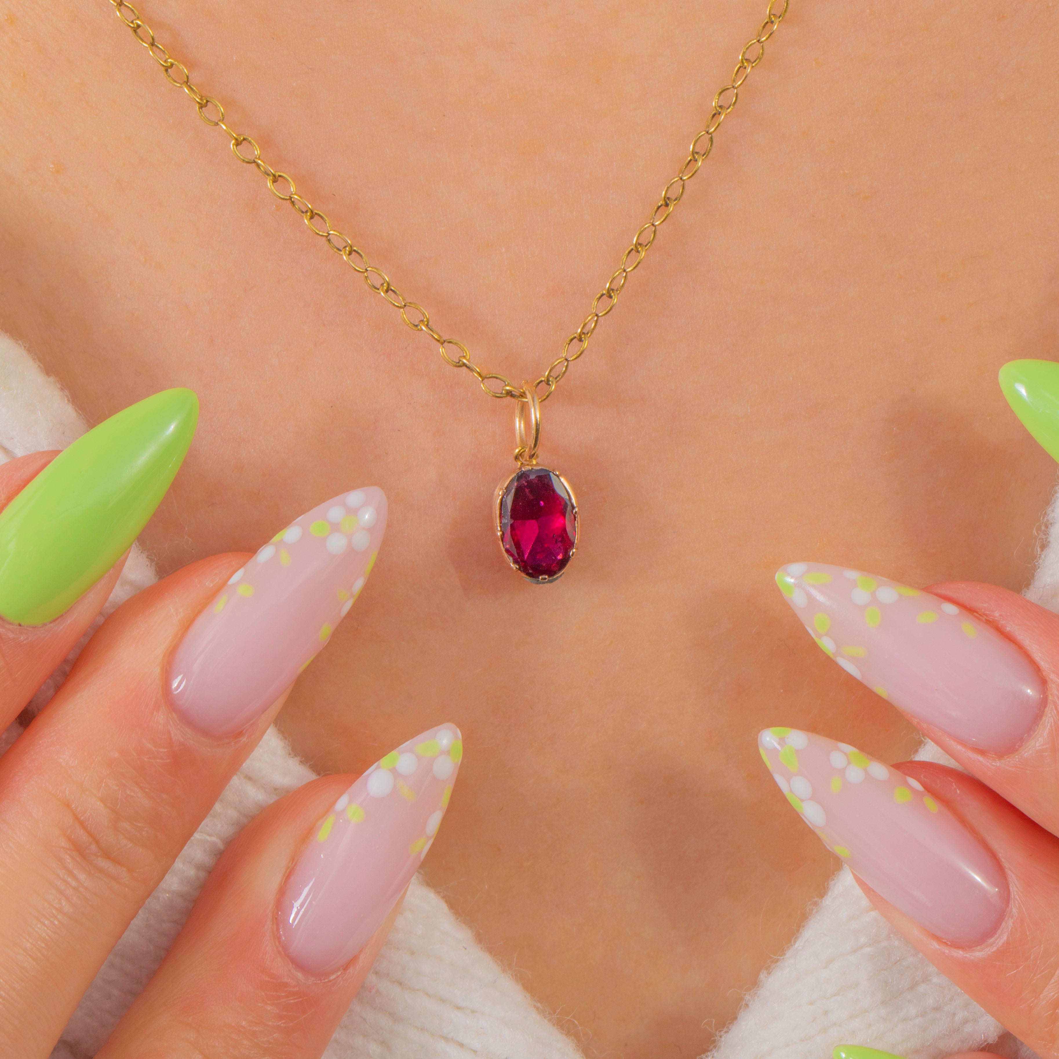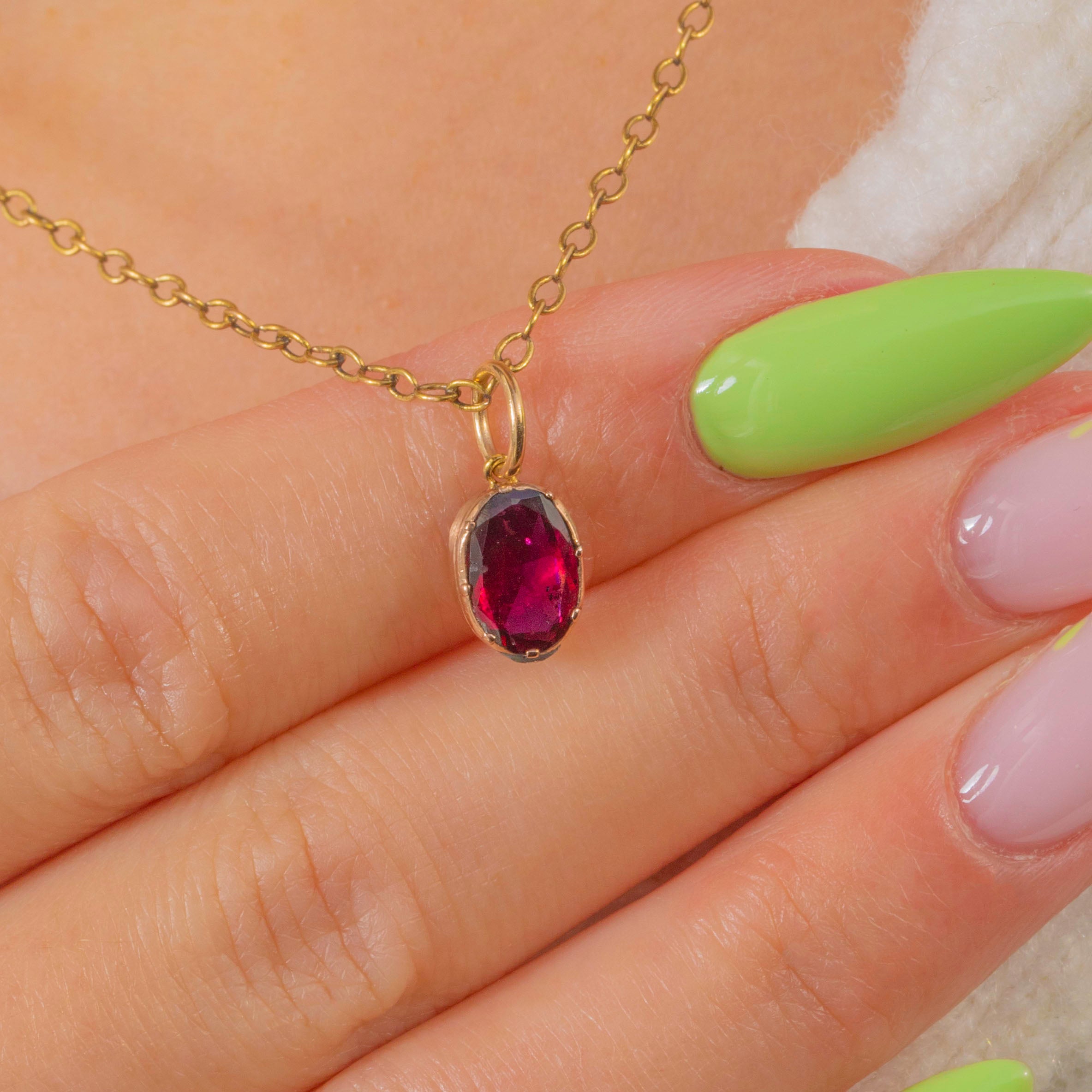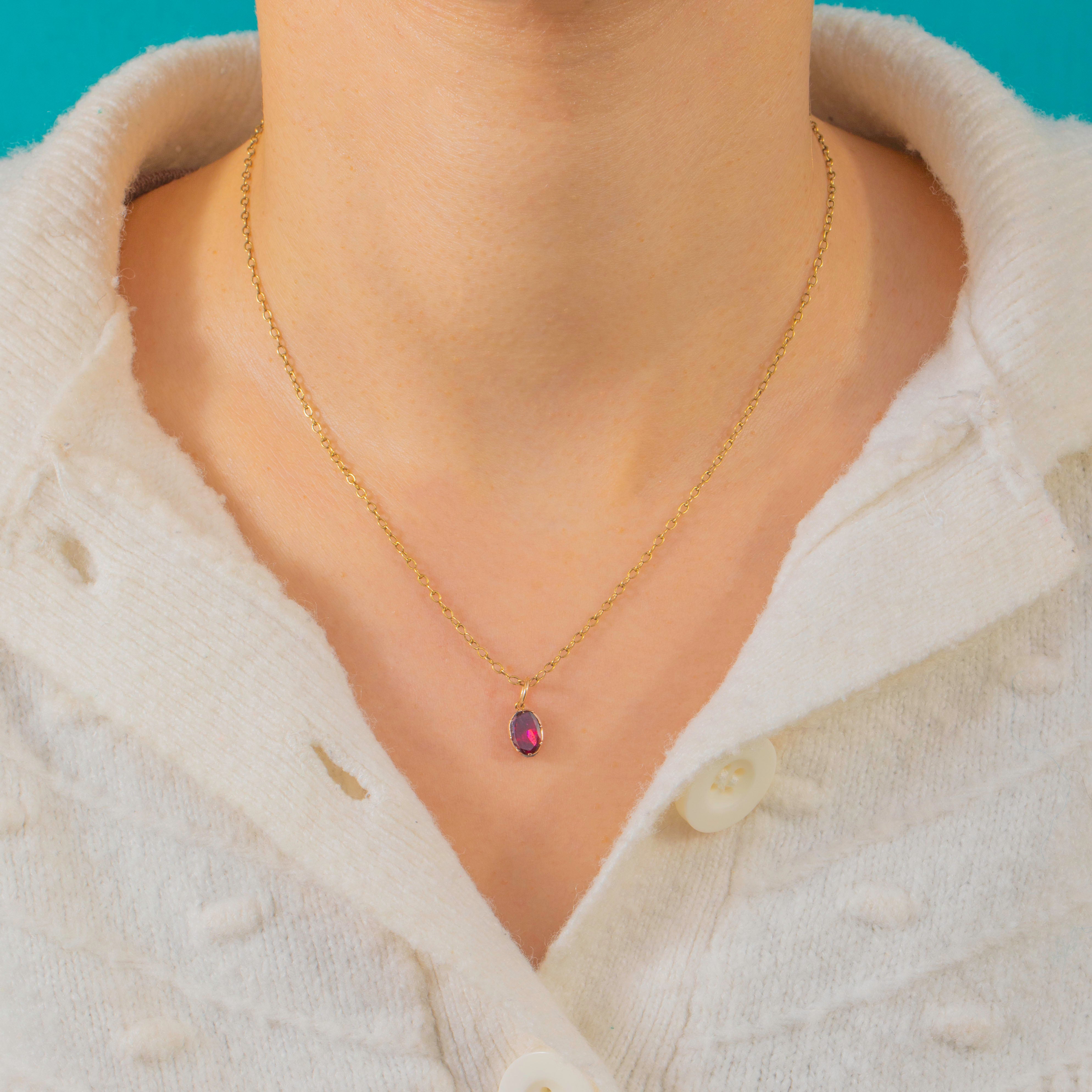 小ぶりでありながら非常にエレガントなこのGeorgianチャームは、約0.75カラットの豊かな色合いを持つフラットカットのガーネットを中心に据えています。オーバルシェイプのストーンは深いクラレットレッドに輝き、洗練された9ctゴールドのコレットに優美にセットされています。その滑らかなシルエットは、時代を超えたシンプルさと贅沢な仕上がりを演出します。
