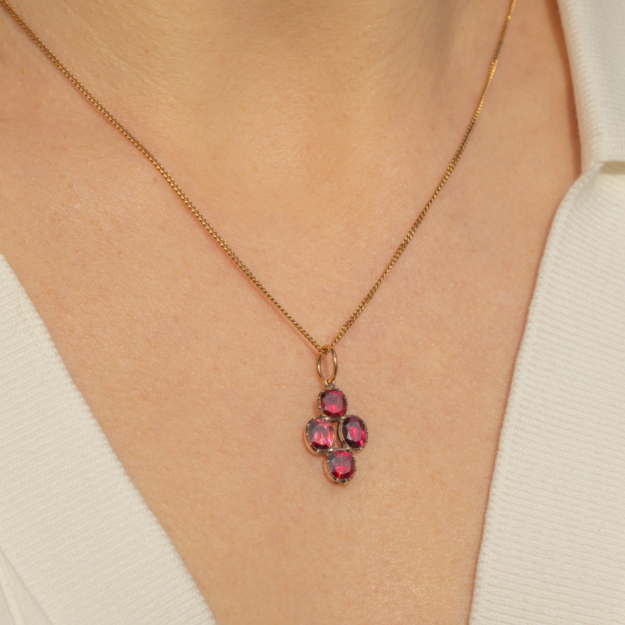Each Garnet is displayed within rosy 9ct Gold piecrust settings with a smooth button-back that rests comfortably against the skin. A classic example of Georgian style and craftsmanship, this antique Garnet pendant will bring intrigue to your collection!