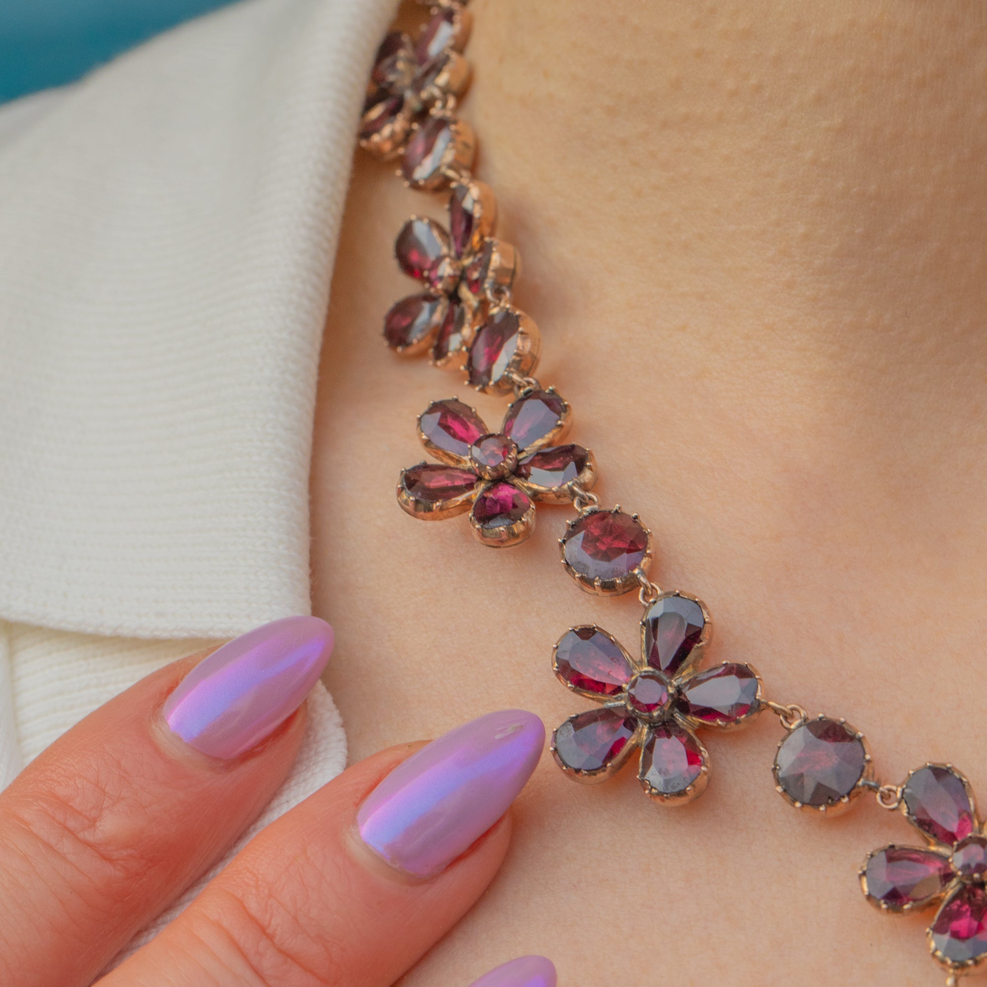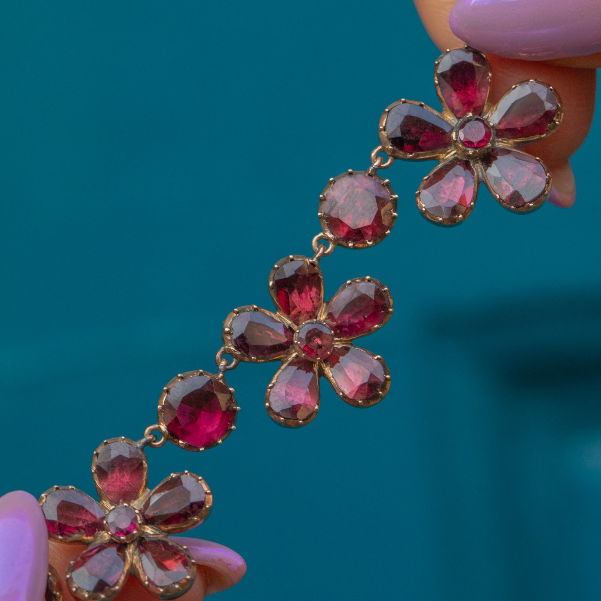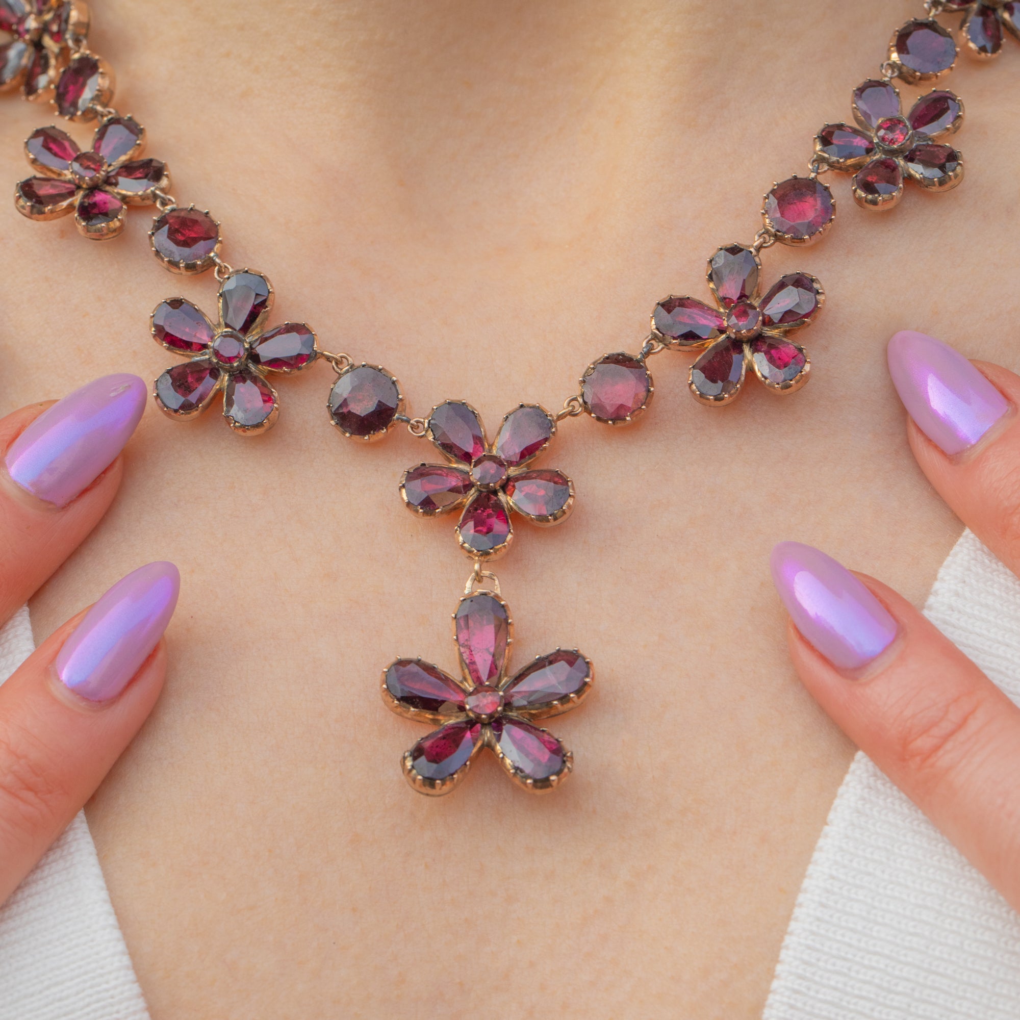 This Georgian 9ct Gold flat-cut Garnet pansy necklace is an exquisite piece! A stellar example of Georgian craftsmanship and is sure to be a stand-out piece in any collection.