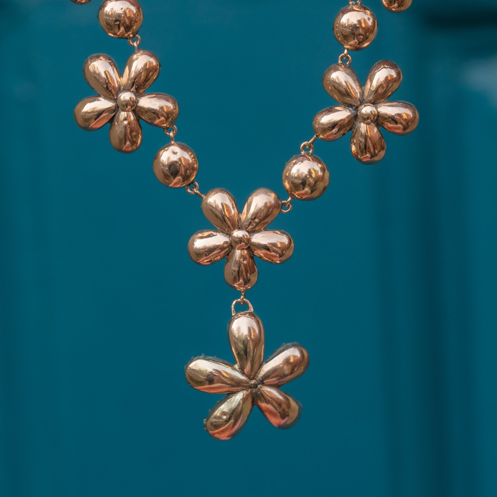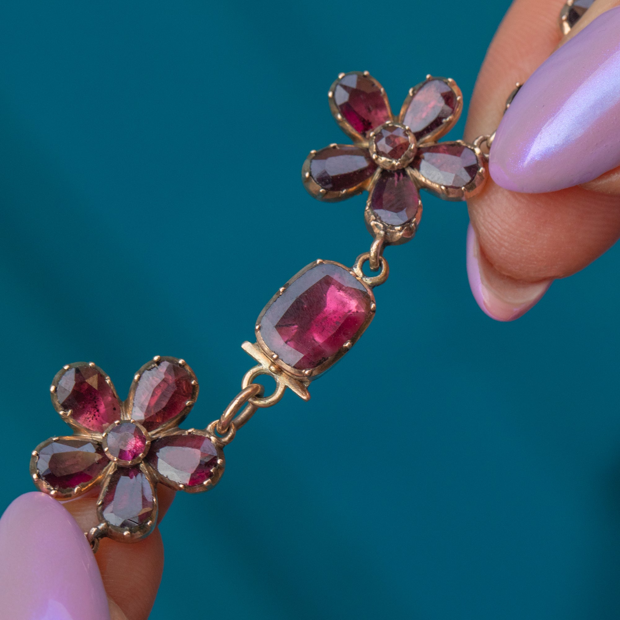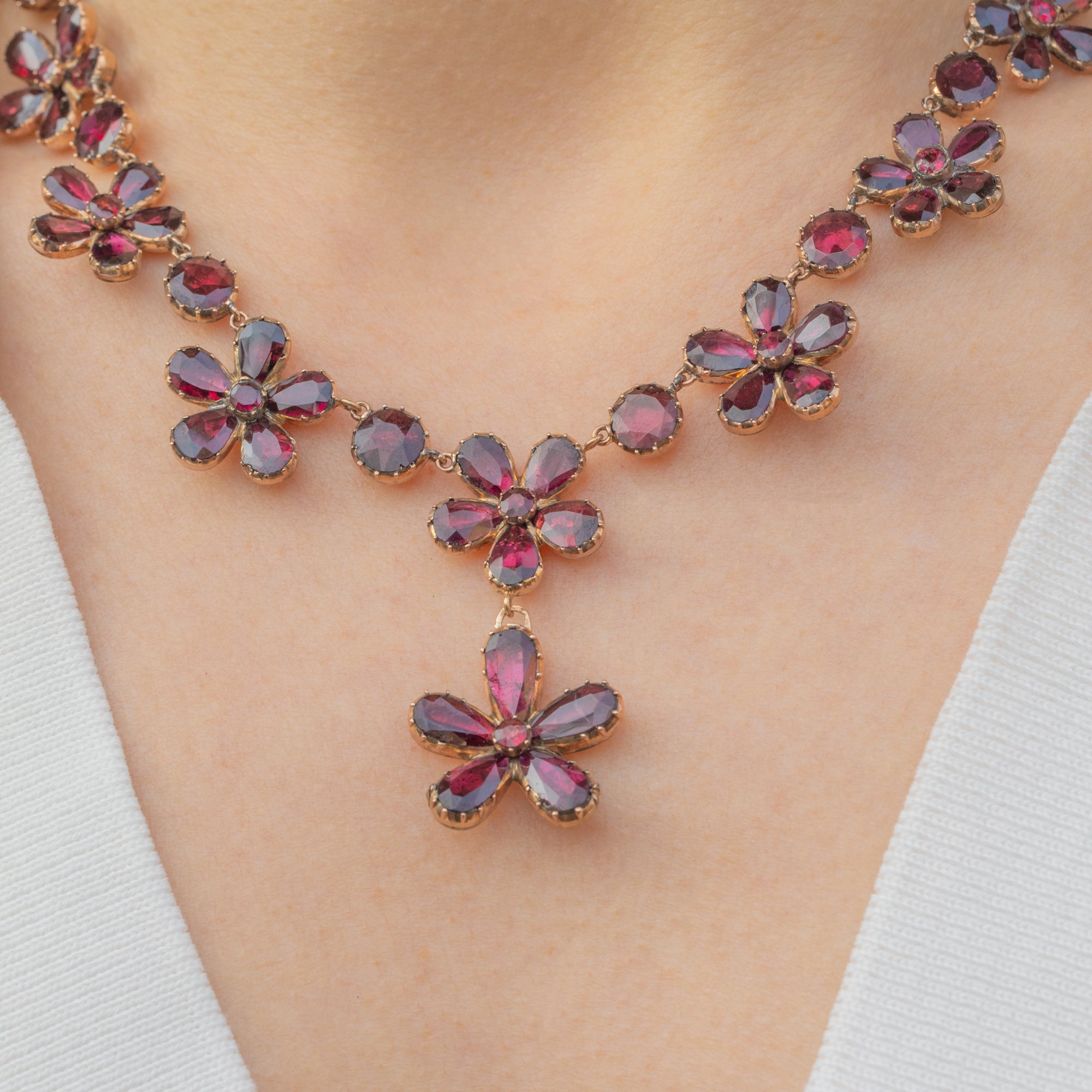 This Georgian 9ct Gold flat-cut Garnet pansy necklace is an exquisite piece! A stellar example of Georgian craftsmanship and is sure to be a stand-out piece in any collection.