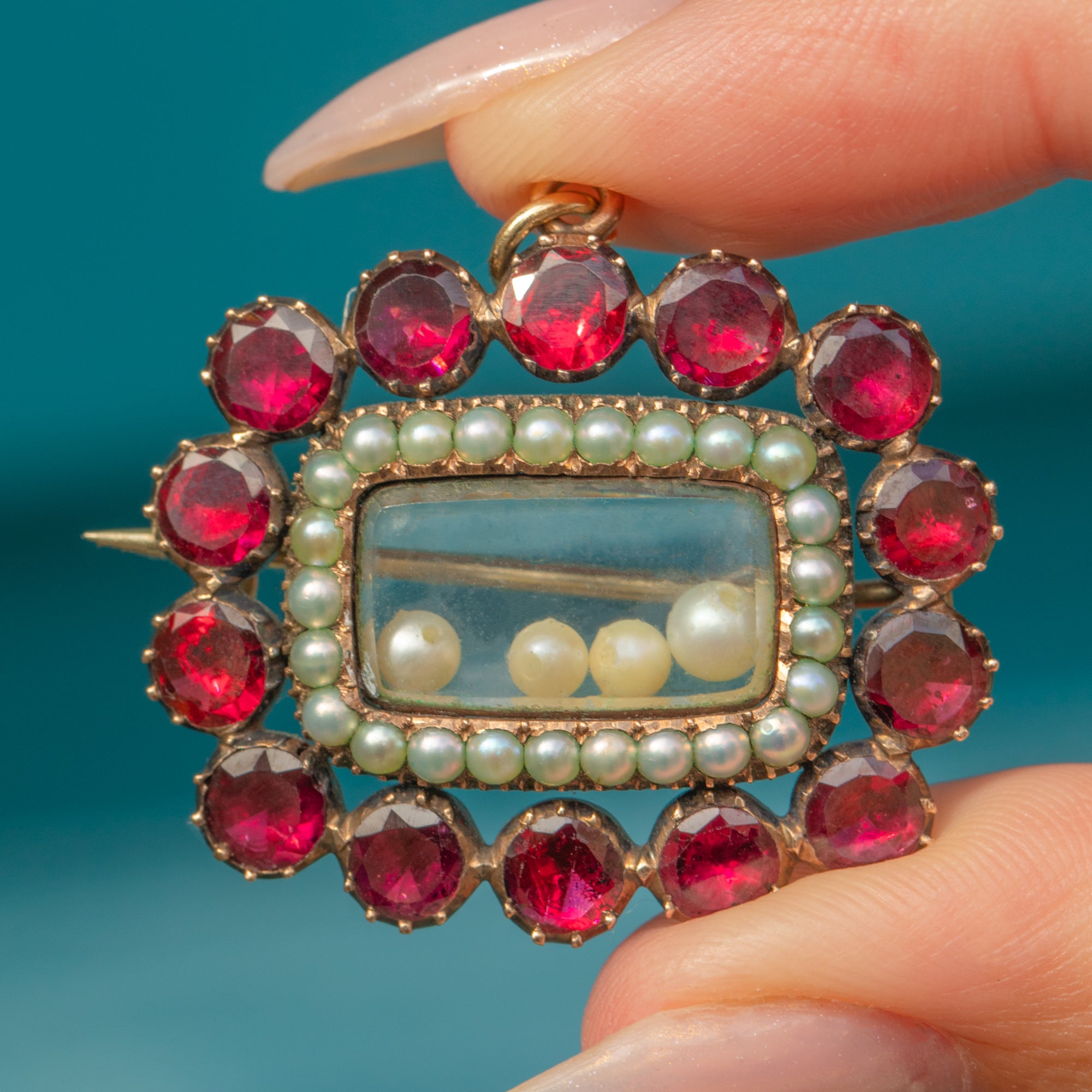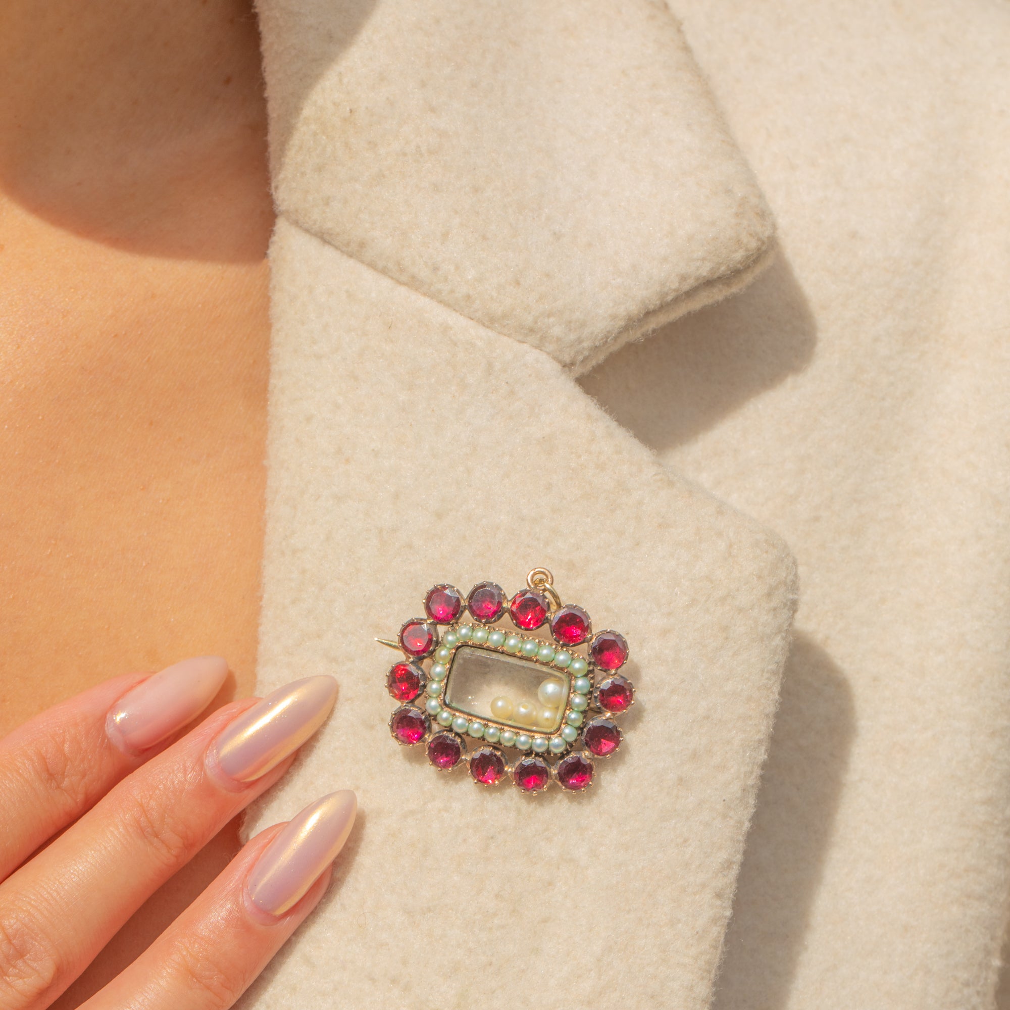 A magnificent Georgian locket-back pendant set with glowing flat-cut Garnets and a delicate border of Natural Pearls. The Garnets, foiled in the traditional Georgian manner, radiate rich cranberry and crimson hues, sparkling with life and depth. At the centre lies a glass-fronted locket compartment, containing tiny drilled Pearls, a touching memento of the past.