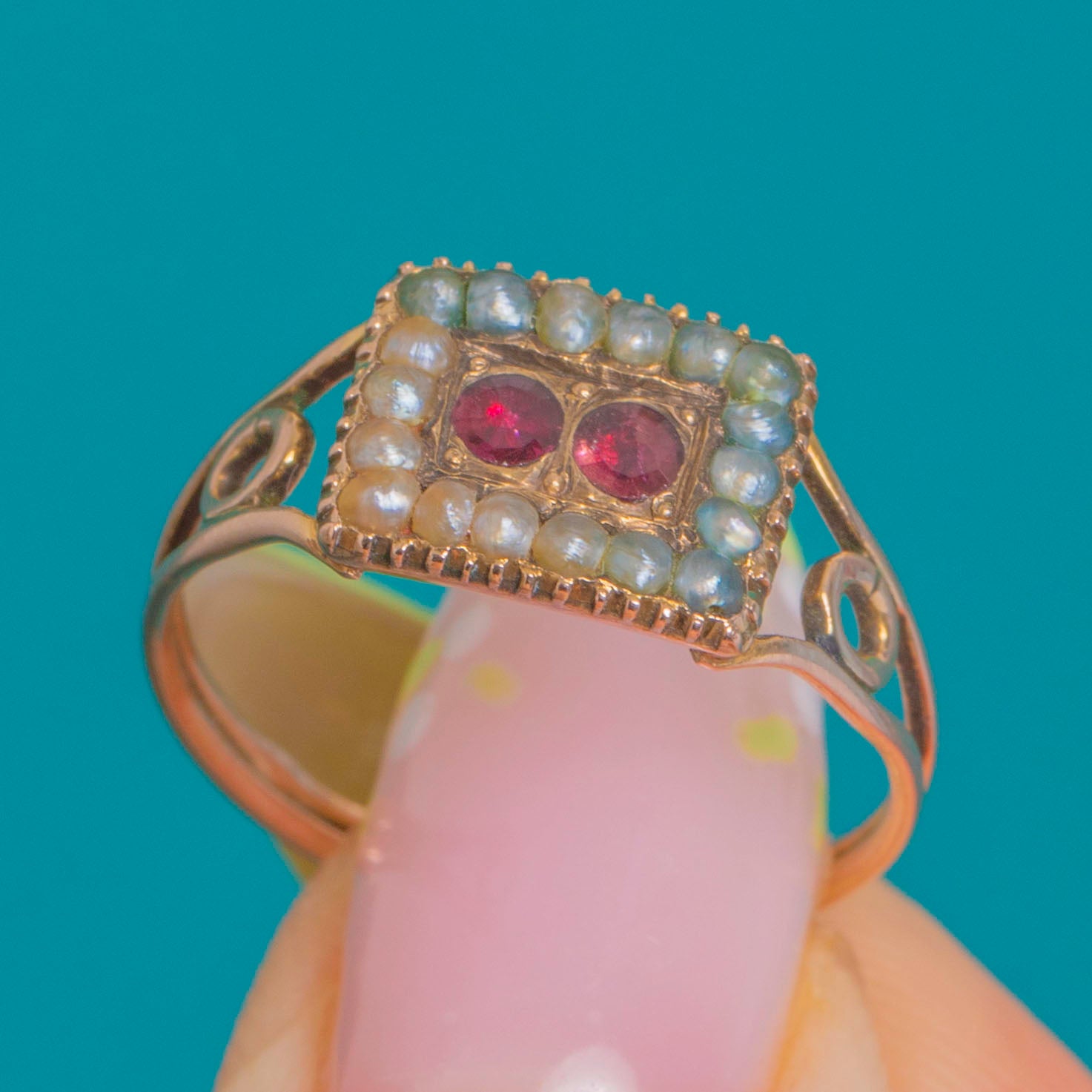 洗練されたGeorgian期のモーニングリング。9ctゴールド製の繊細な長方形プレートデザインで、中央にはフラットカットのガーネット2石が配され、周囲をシードパールの繊細なハローが彩ります。精緻なビーディングがほのかな質感を添え、透かし細工の植物モチーフをあしらったショルダーが、シルエットに優雅な軽やかさをもたらします。