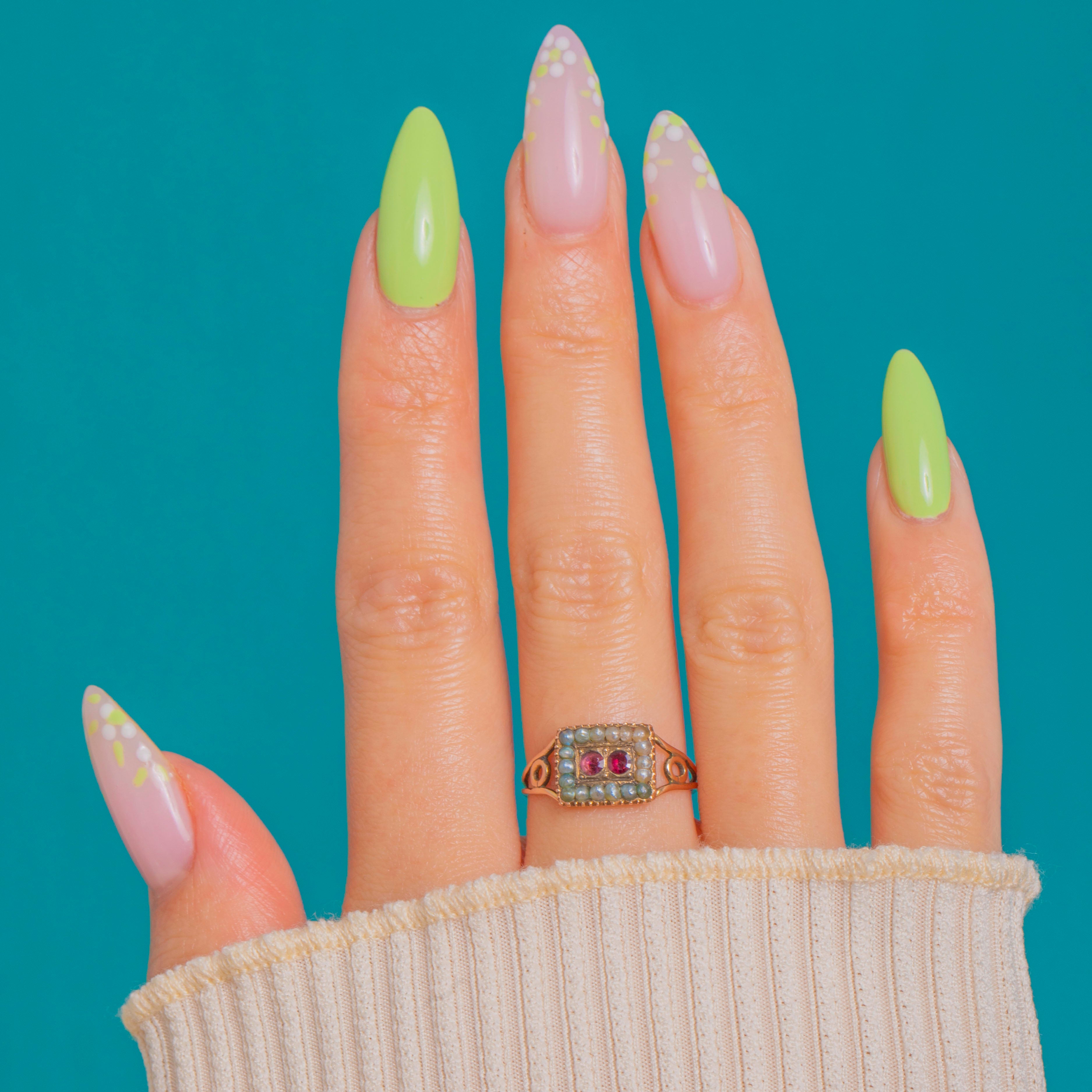 深紅のガーネットとクリーミーなシードパールの柔らかな光沢が、時代を超えたGeorgianの美しい配色を生み出しています。クローズドバックセッティングと丁寧な手仕上げにより、その魅力が一層引き立ちます。エレガントで控えめな佇まいは、19世紀初頭の職人技を感じさせる、心に残る追憶のジュエリーです。