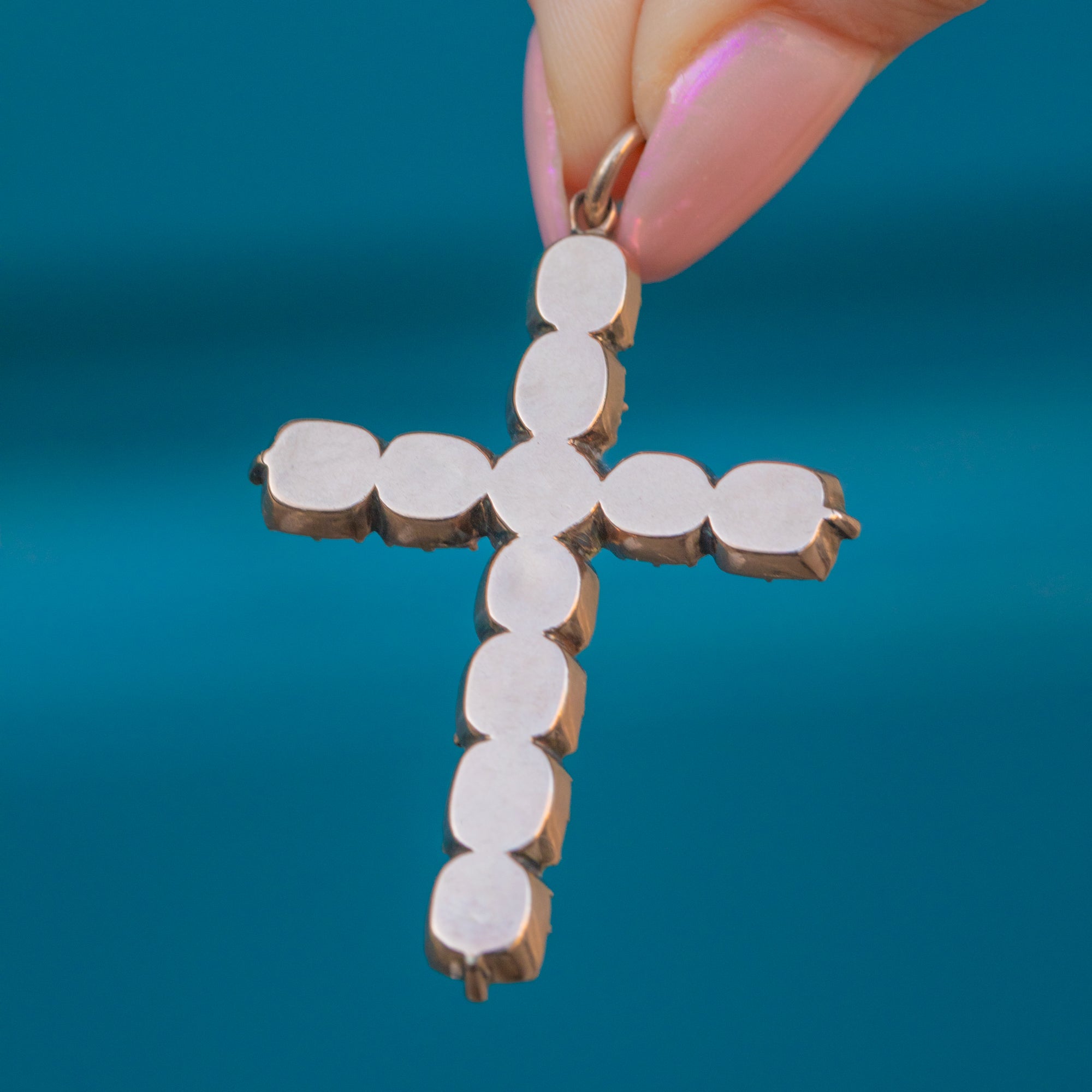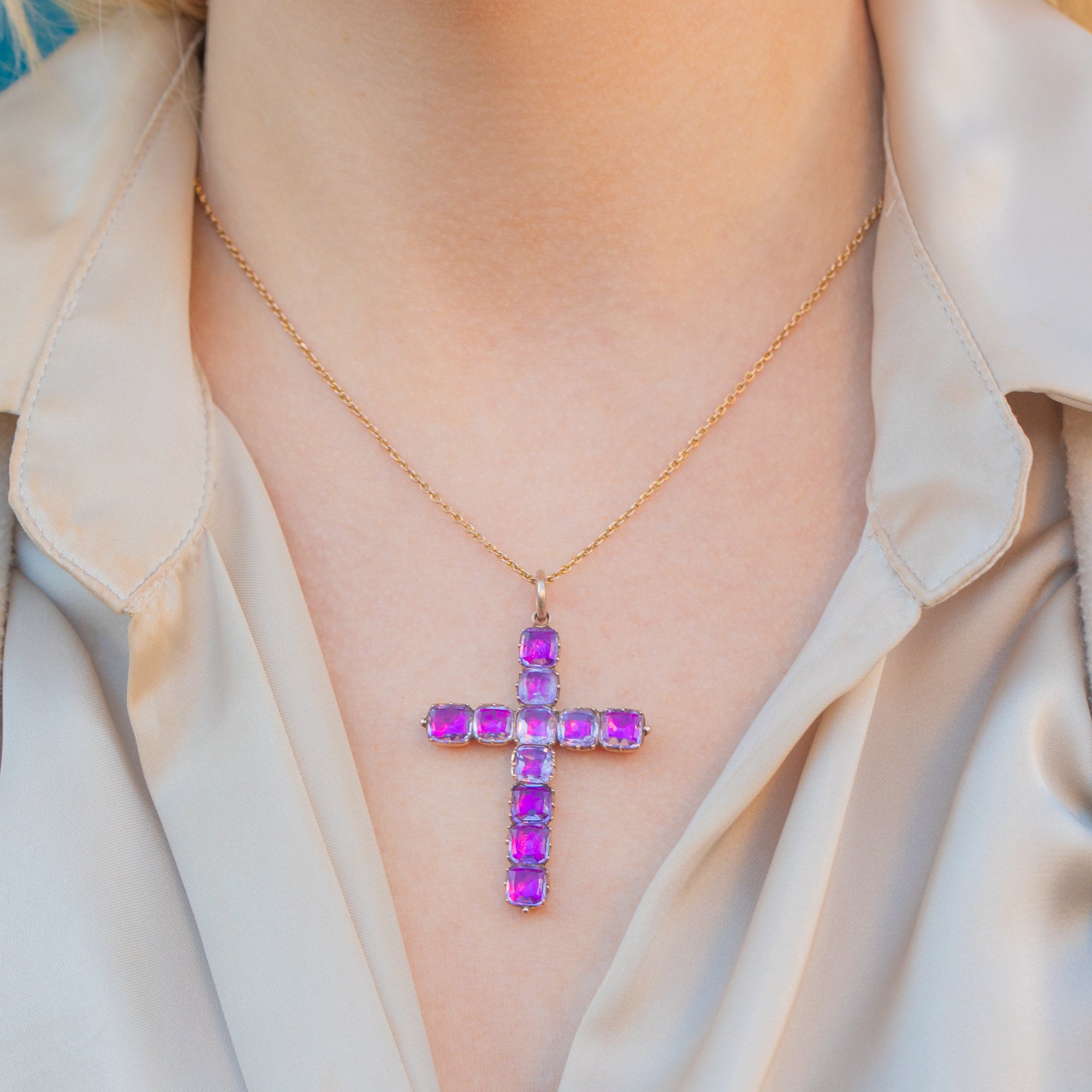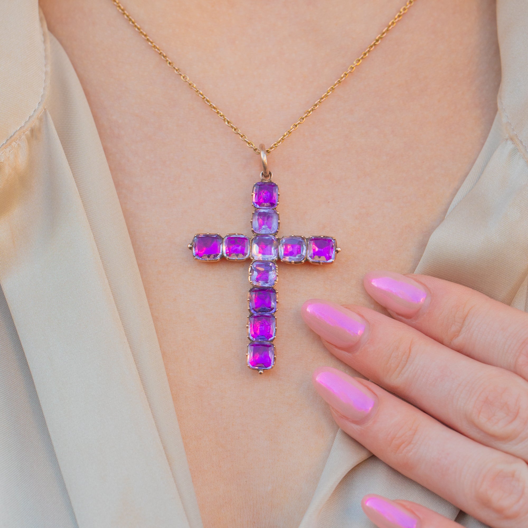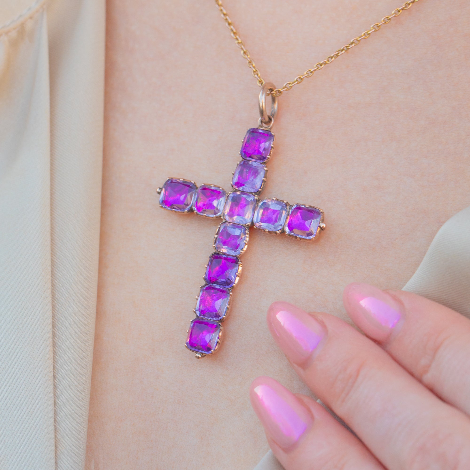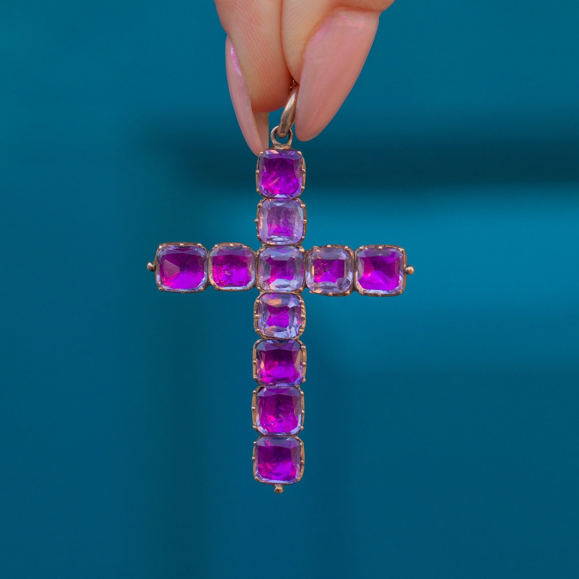 Rich in splendour, this Georgian 9ct Gold foiled Amethyst cross pendant is truly captivating! The piece boasts an elegant display of juicy natural Amethysts, foiled to give off a hot pink hue.
