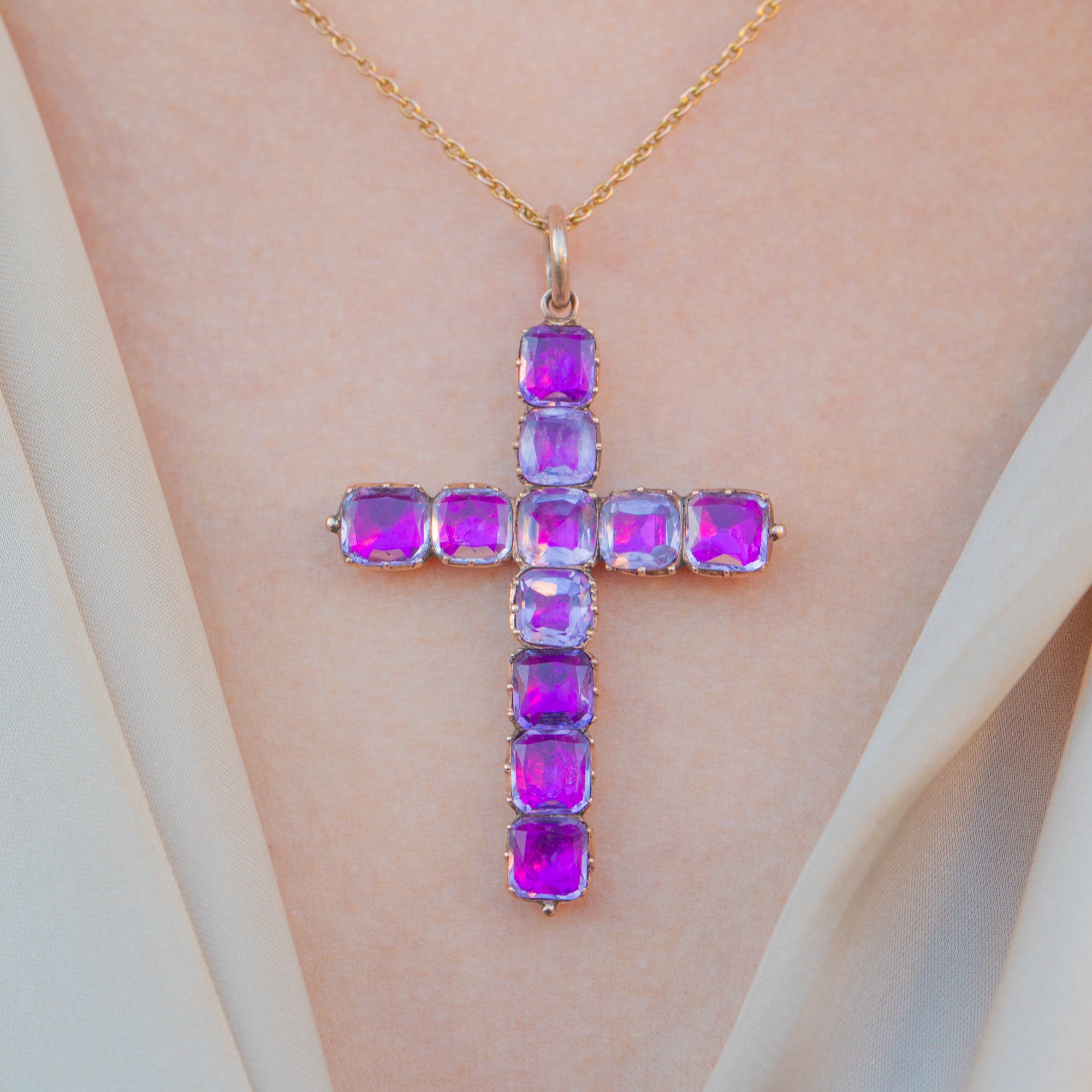 VERY GOOD. This Georgian 9ct Gold foiled Amethyst cross pendant is in wonderful antique condition, looking absolutely phenomenal considering she's over two centuries old! The Amthystrs are all present and securely set, with their foiling remaining intact. There are a few dings on the back, but these are not visible when the pendant is worn and do not affect the integrity of the piece. A superb piece of Georgian jewellery ready to be worn with pride by the woman whose neck she adorns.