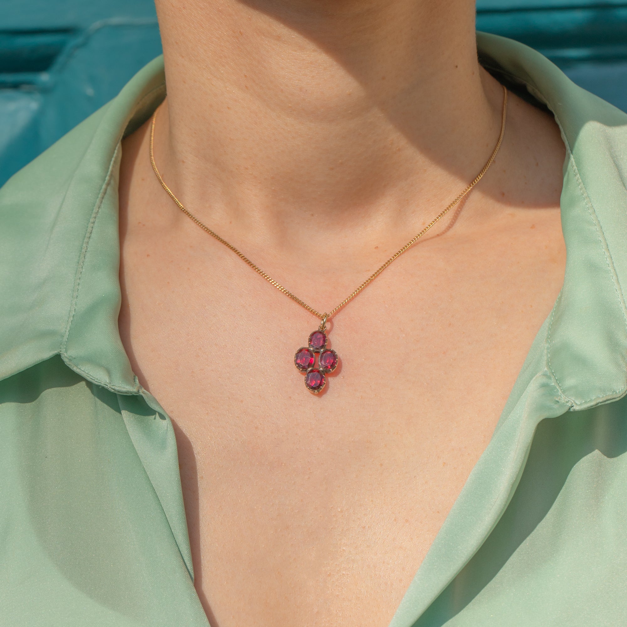 VERY GOOD. This exquisite Georgian 9ct Gold Garnet charm is in very good condition. Each Garnet is expertly faceted and securely set. The Garnets do have some minor surface wear to note, but given their age, they're in fab condition. The back of the pendant is smooth so can be worn comfortably!