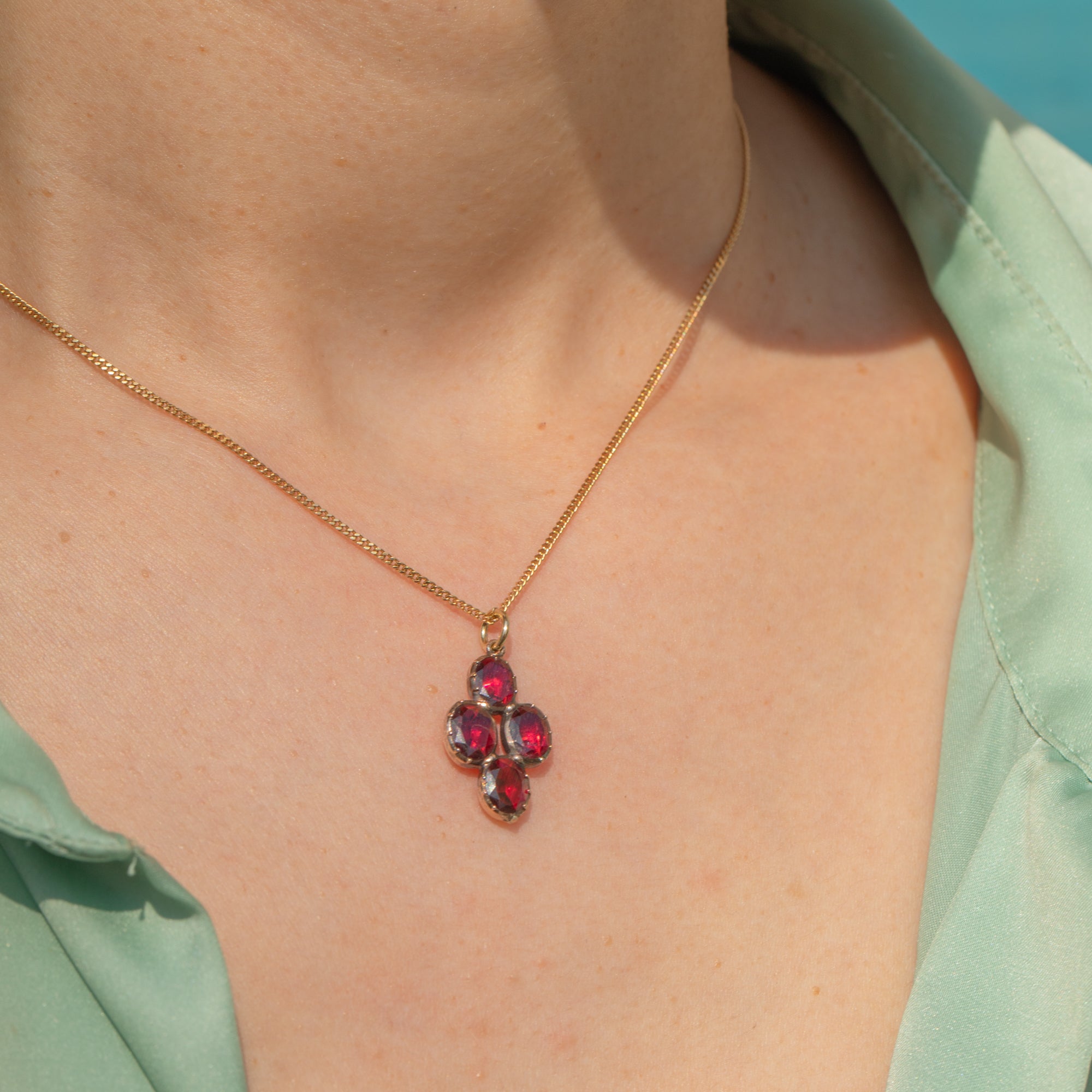 This exquisite Georgian 9ct Gold Garnet charm is a true delight! Showcasing four beautifully flat-cut Garnets arranged in a quartet formation, she shimmers with deep, crimson hues—reminiscent of a cluster of ripe, irresistible berries.