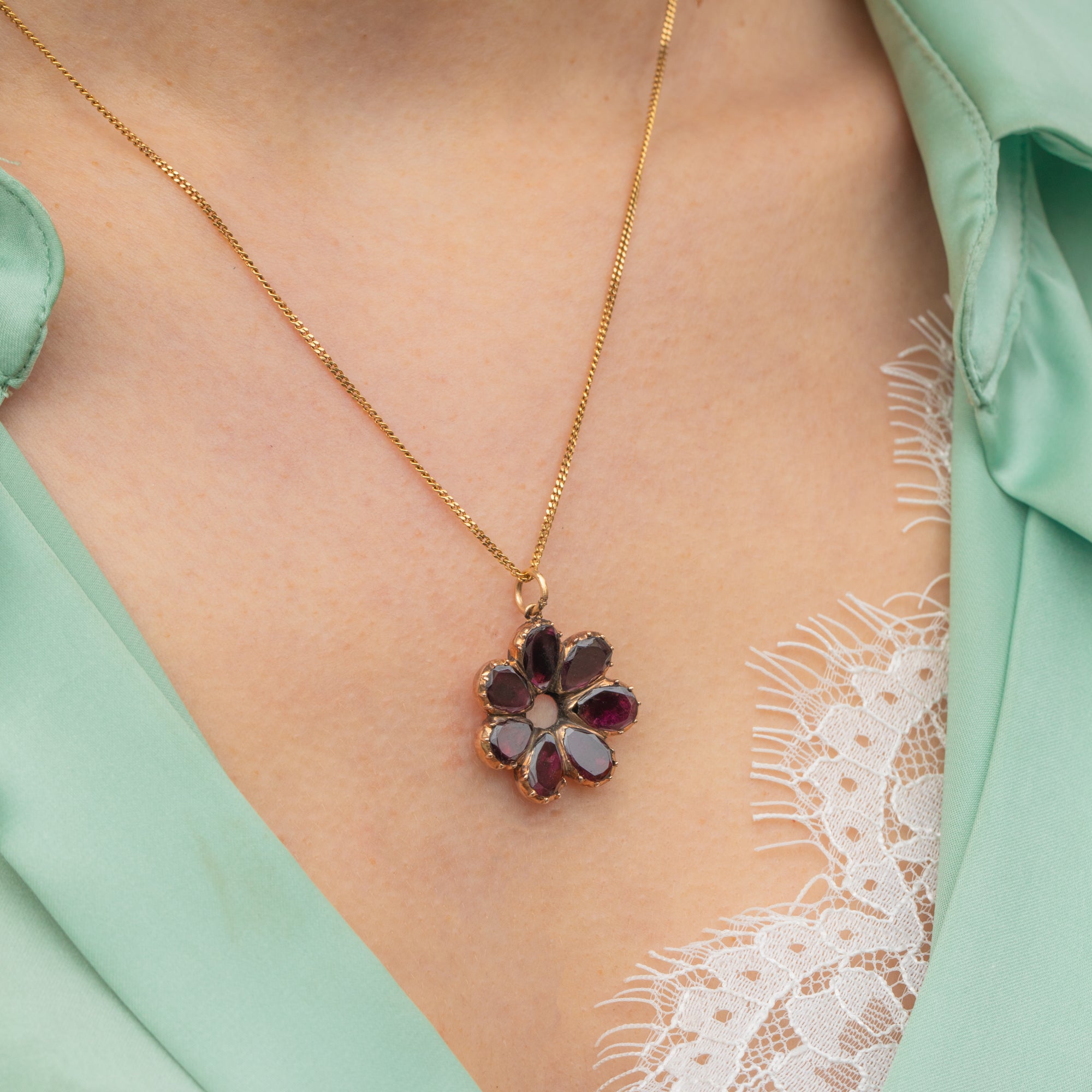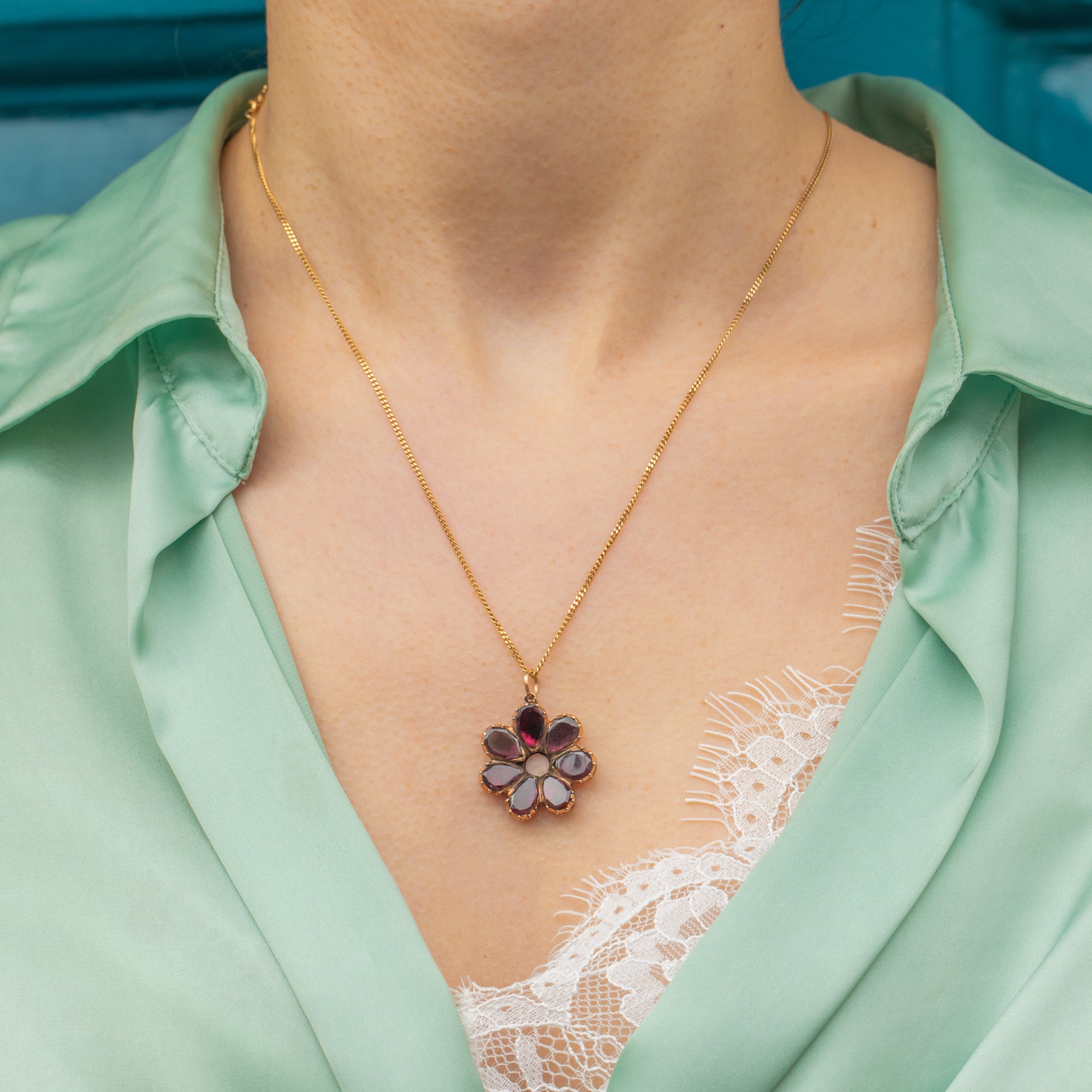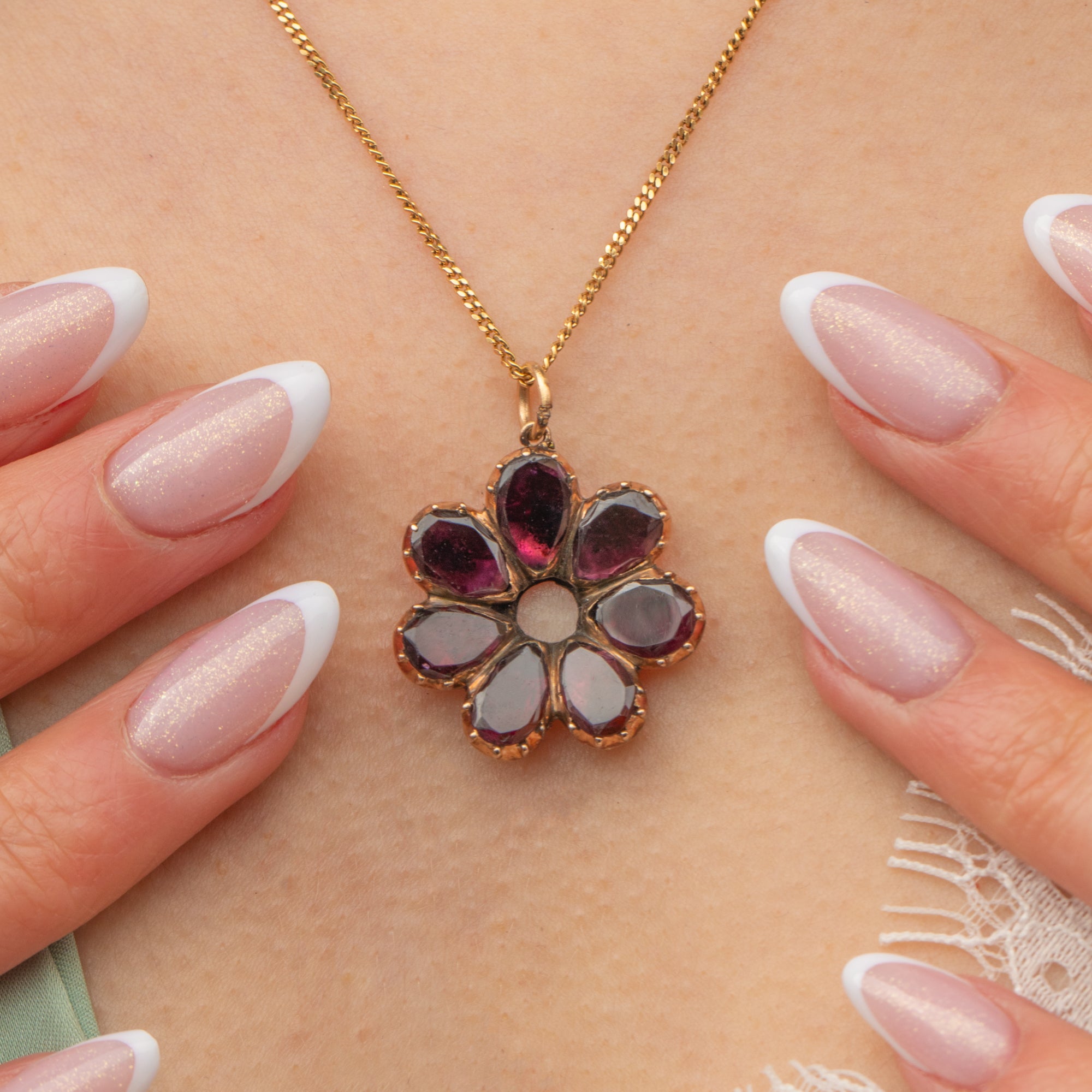 GOOD-VERY GOOD: This Georgian 9ct Gold Garnet Flower Pendant is in good antique condition. There are a few surface marks to the gemstones, however this is only noticeable under close inspection. All the stones are securely set into their 9ct Gold settings, with practically no wear to the settings. There is some wear on the back of the pendant, a distinct ding to the Gold near the top by the jump ring, and some discolouration to the Gold. However, as this is at the back of the pendant, it is not visible during wear. Pop her on a chain and you'll adore wearing her for years to come!