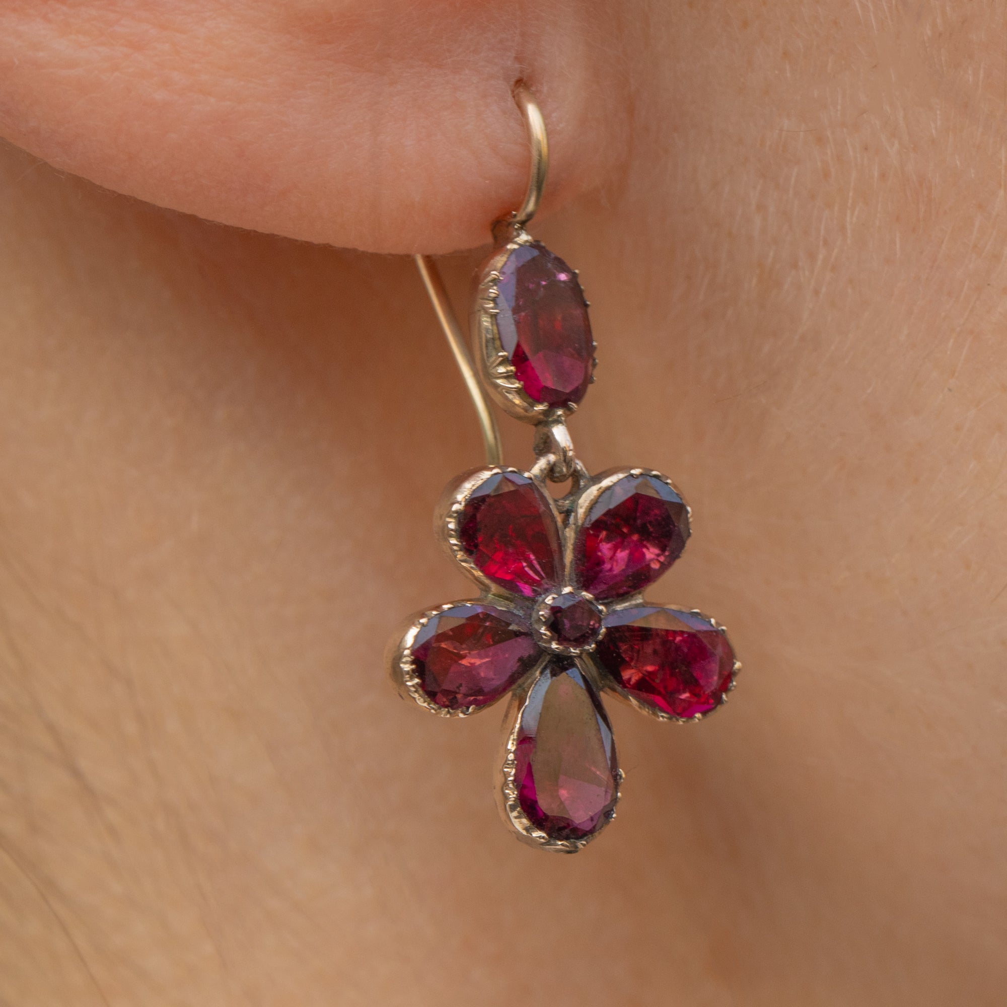 These pansy drop earrings have a lovely feminine antique charm, enhanced by the gentle movement they provide as they suspend from your lobes. Versatile and dainty, these Georgian Garnet earrings are a must-have!