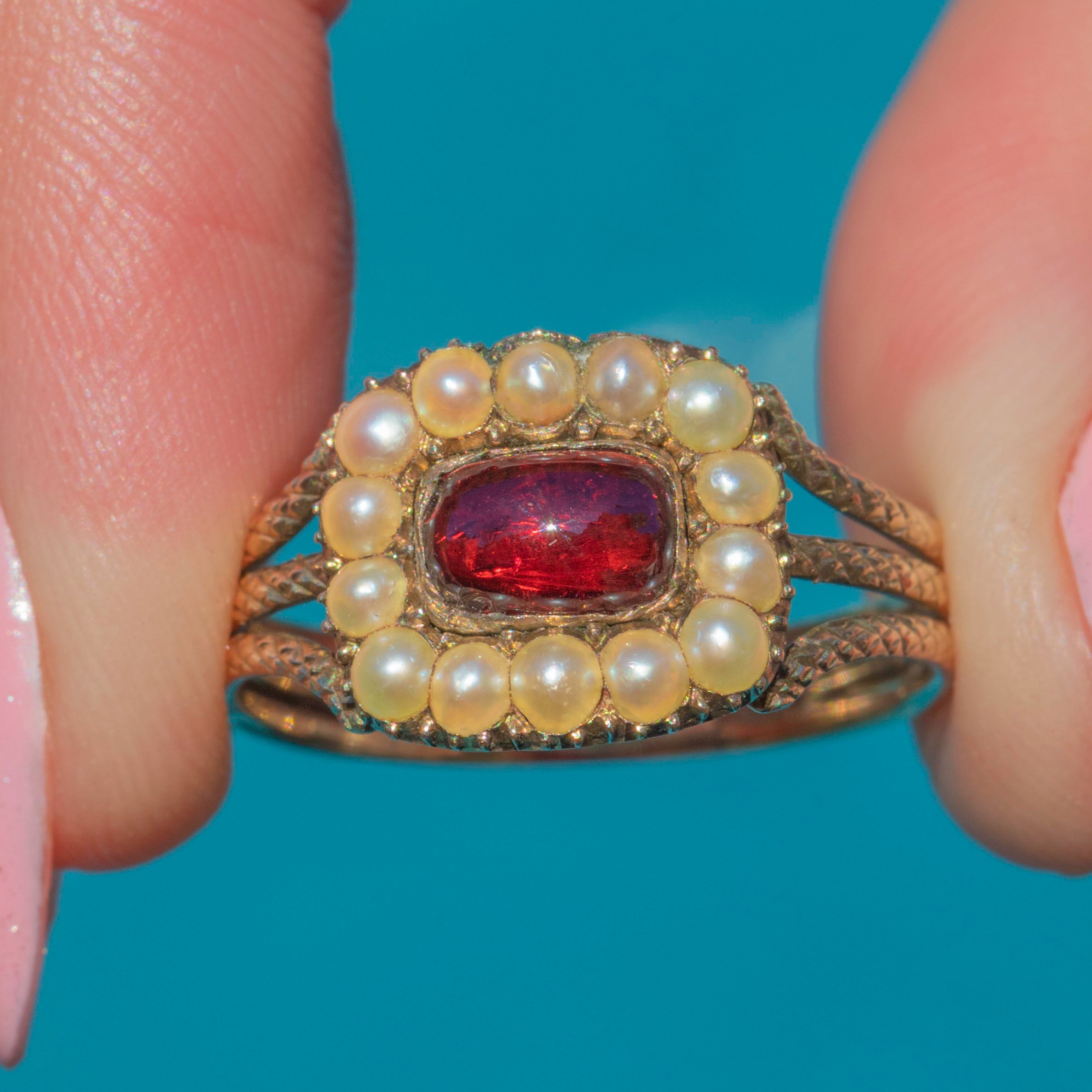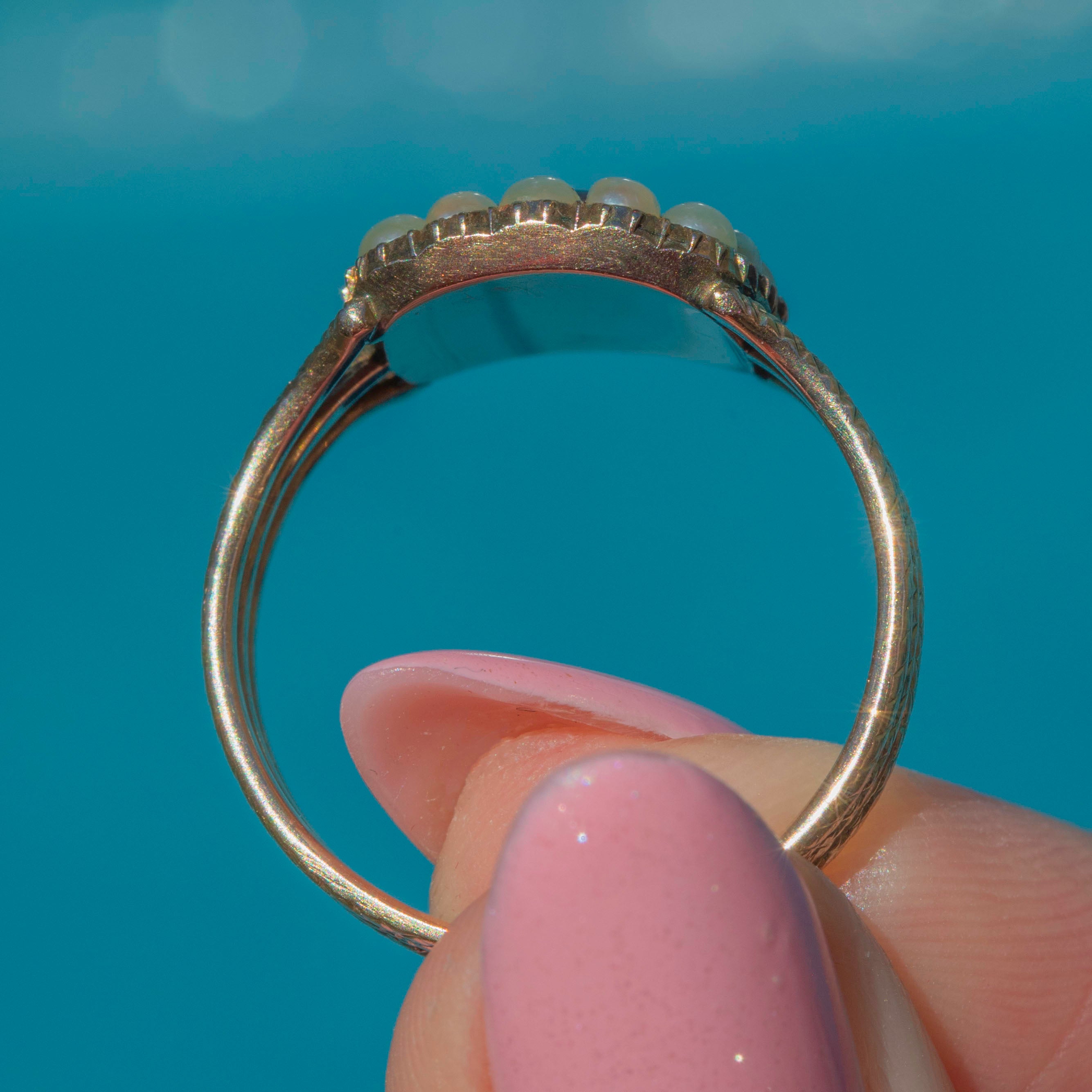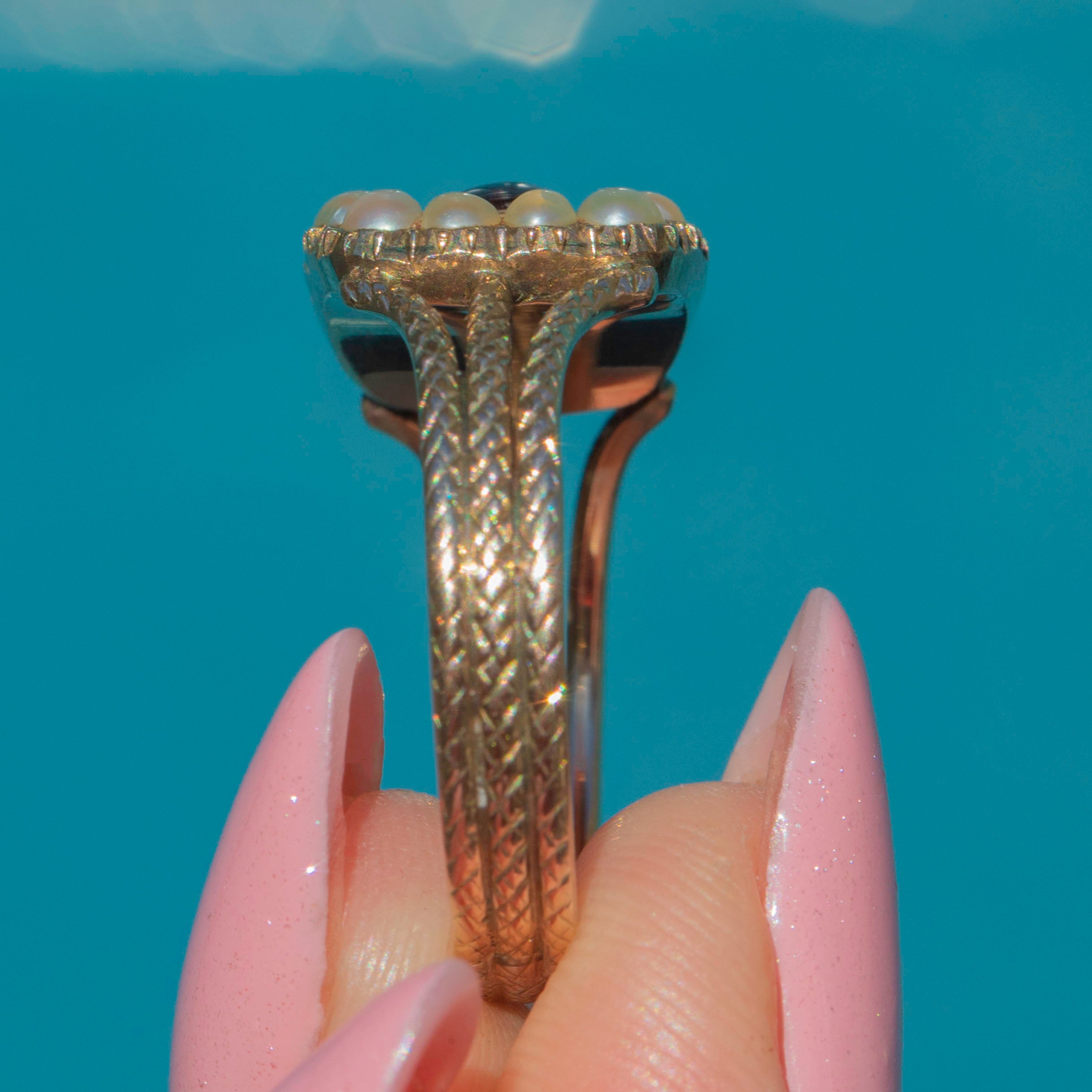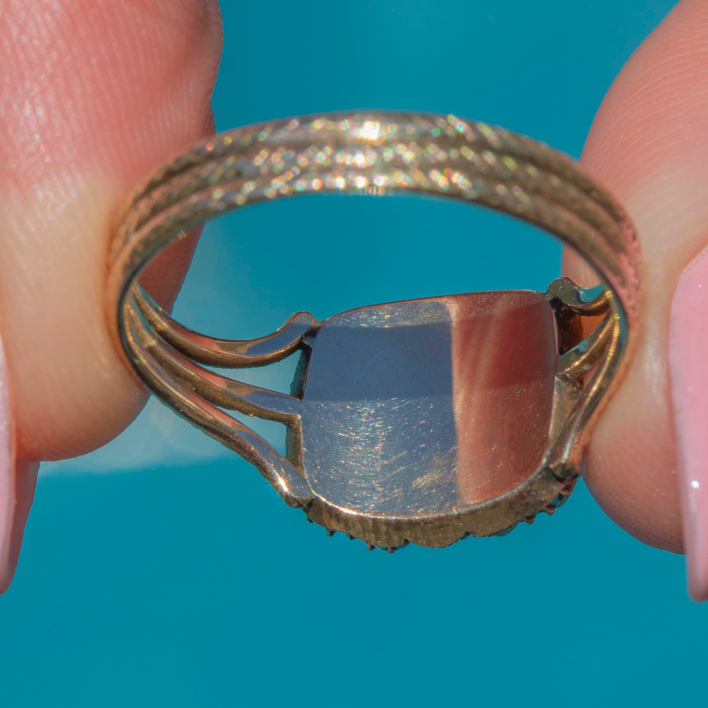 The solid 9ct Gold band features serpentine-esque texture adding a unique flare to the ring. With so much beauty to behold, you won't ever tire of admiring this 200-year-old jewel!