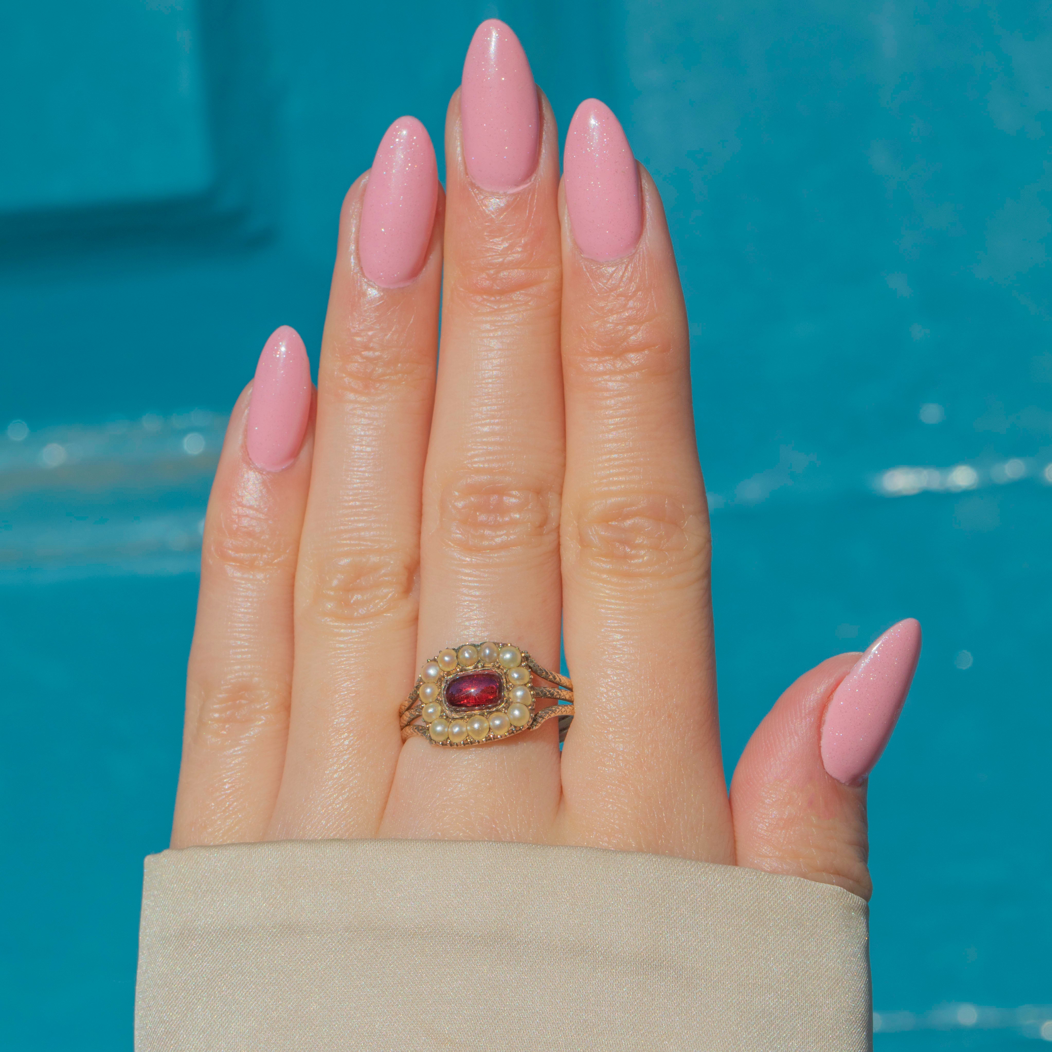 This Georgian 9ct Gold Garnet Pearl cluster ring is bursting with antique charm. A cranberry-hued 0.43ct Garnet cabochon sits centre stage and is framed by a halo of shimmering Pearls. Boasting a solid Georgian 9ct Gold shank, she effortlessly glides onto the hand.
