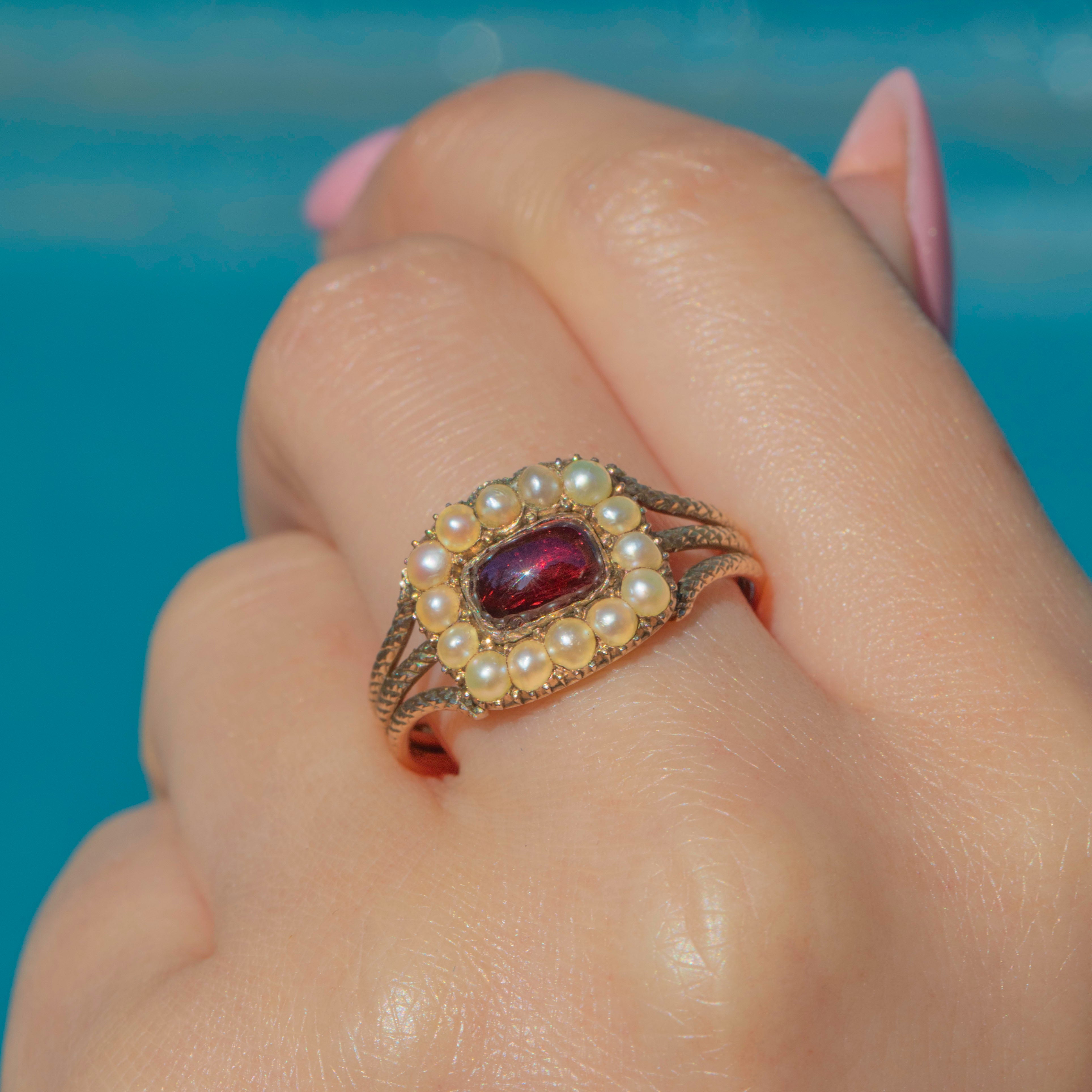 VERY GOOD-EXCELLENT: This Georgian 9ct Gold Garnet Pearl cluster ring is in wonderful antique condition. All of the Pearls are original to the piece and are snug their settings. The Garnet is secure also, with only very mild wear to her surface including a tiny scuff on the front, which is only visible under the inspection of a jeweller's loupe. The engraved detailing on the band is in excellent condition with only some mild wear on her back. With so much wear potential, she will quickly become the most coveted piece in your collection!