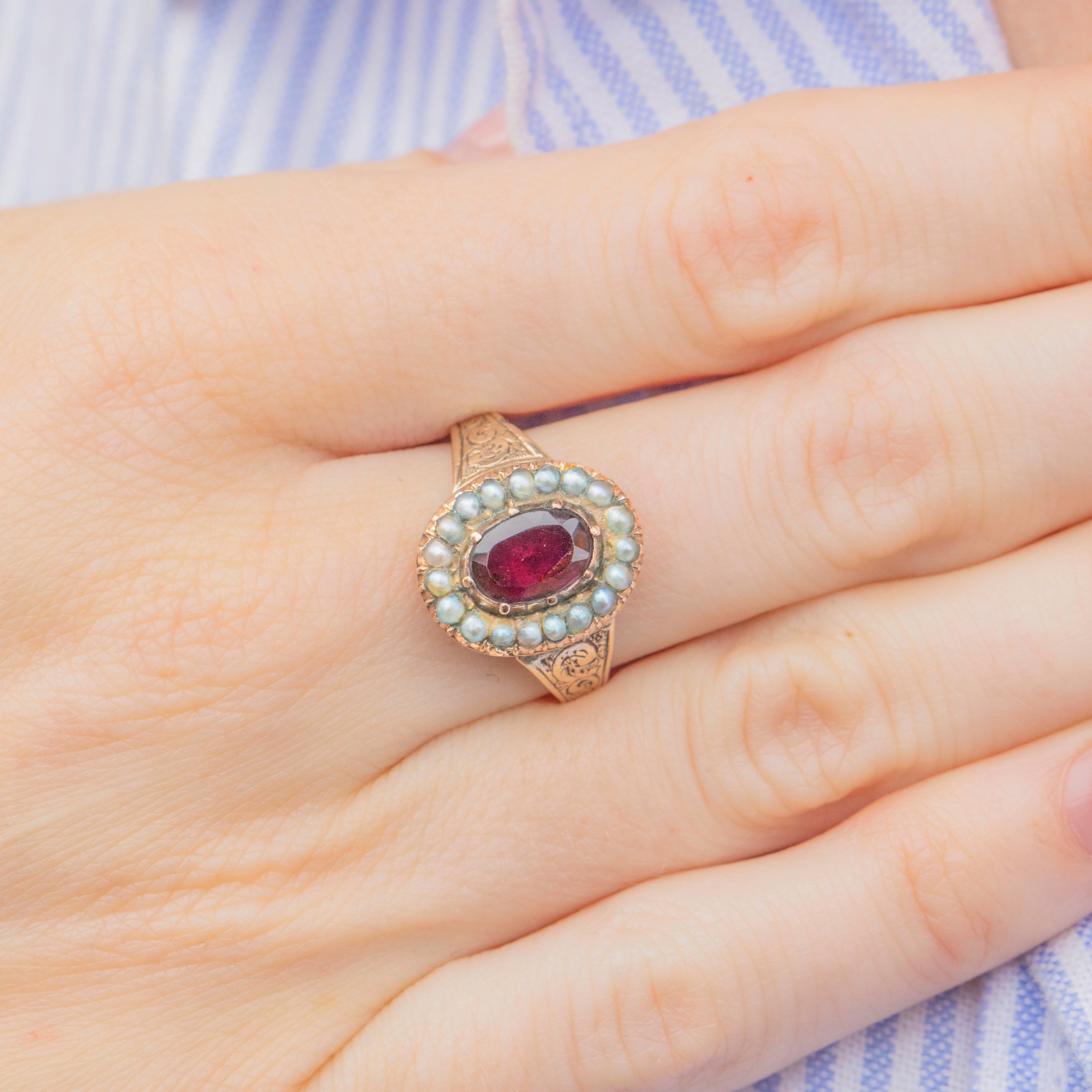 Georgian 9ct Gold Garnet Pearl Cluster Ring, Engraved Shoulders