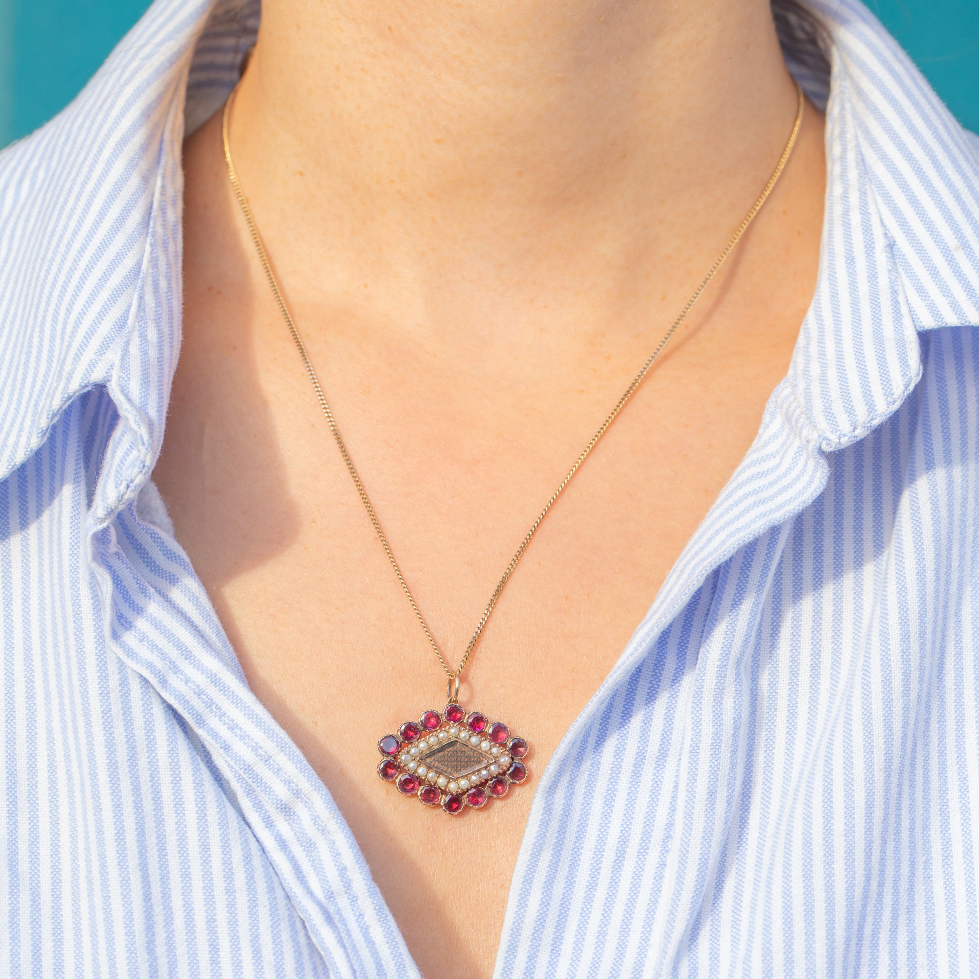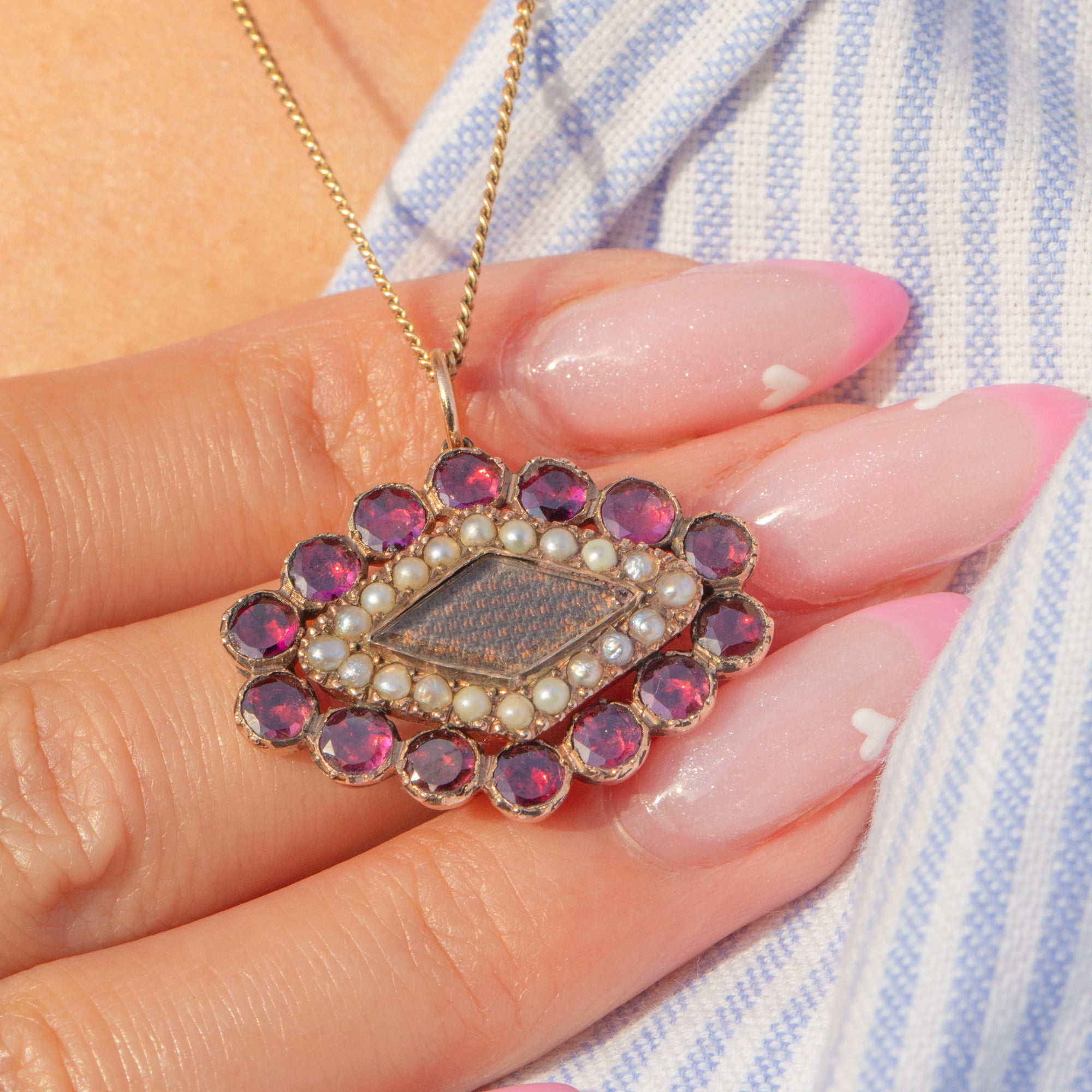 This exquisite Georgian lozenge-shaped charm, c.1800, is crafted in 9ct Gold and set with rich flat-cut Garnets framed by delicate Seed Pearls. Beneath the glass panel lies a beautifully preserved woven hair memento, a touching reminder of the Georgian era’s sentimental jewellery traditions.