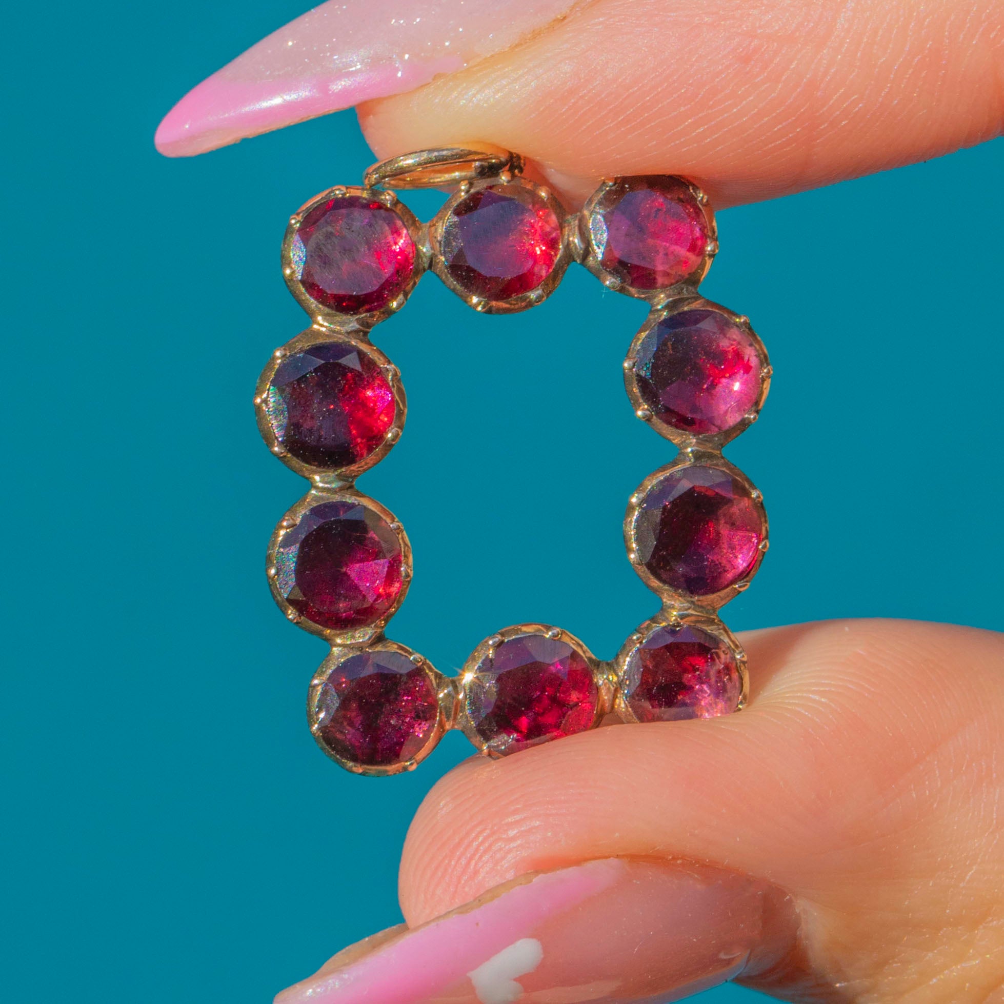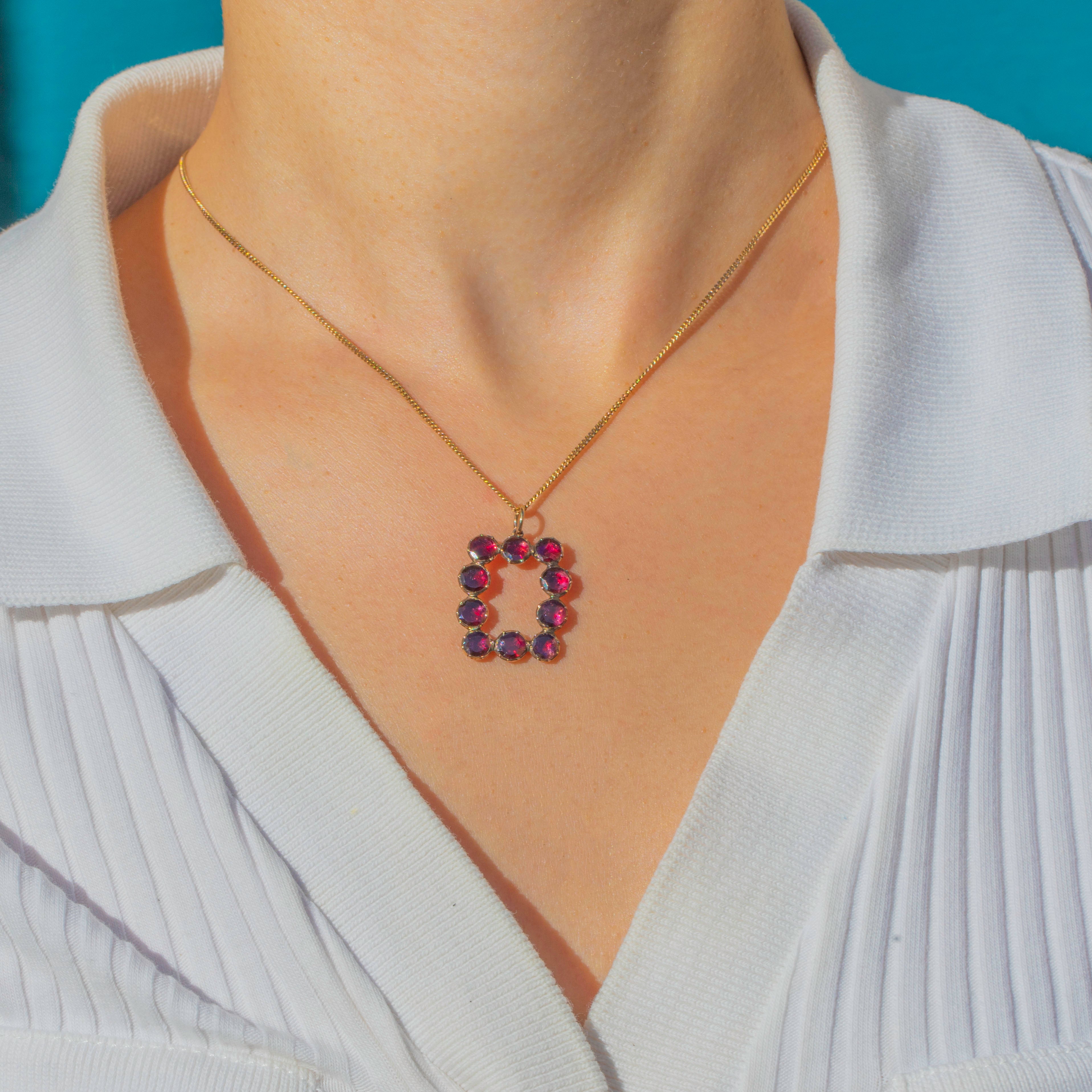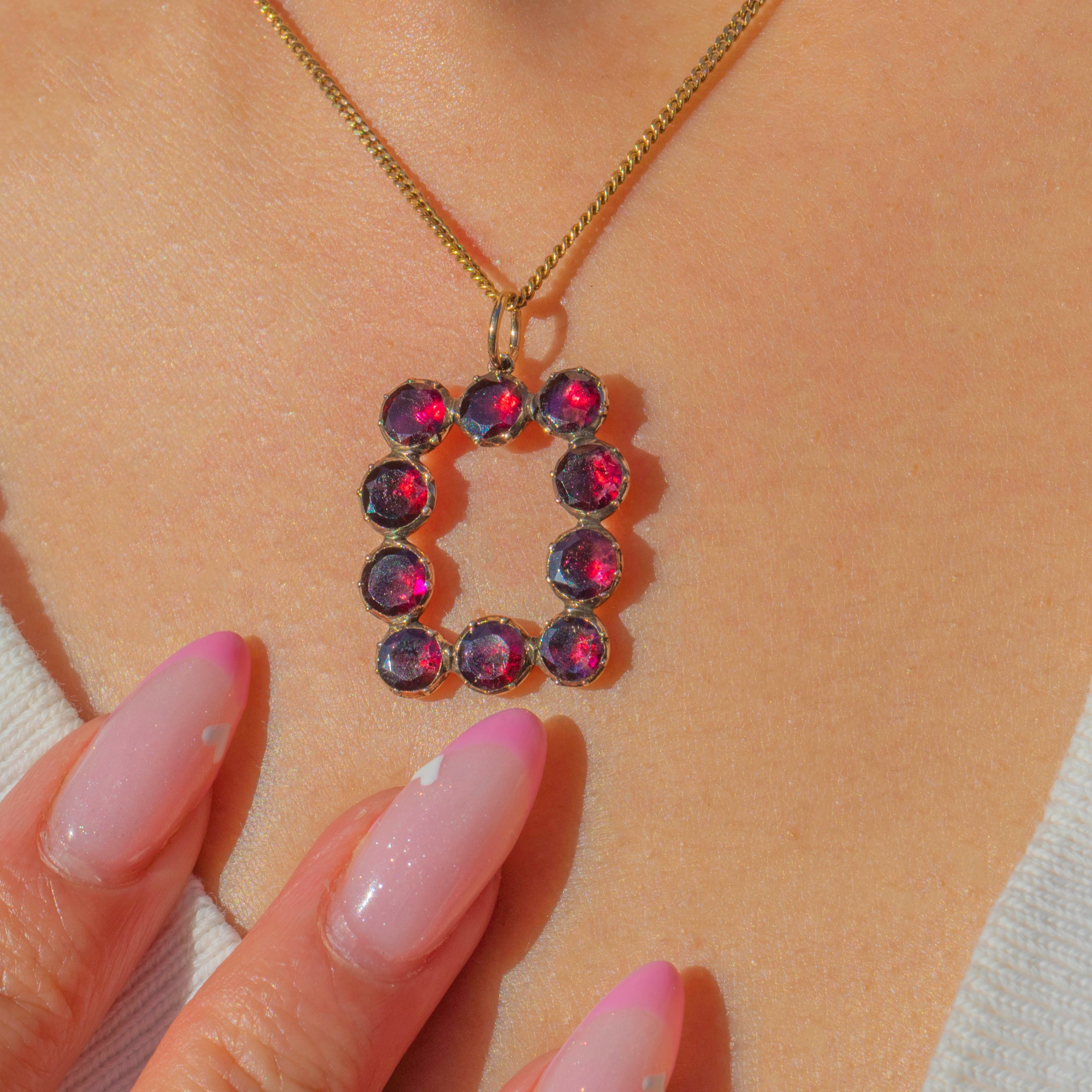 A beautiful Georgian pendant crafted in 9ct Gold and set with richly hued flat-cut Garnets. Arranged in an elegant rectangular configuration, the glowing crimson stones are enhanced by their foiled backings.