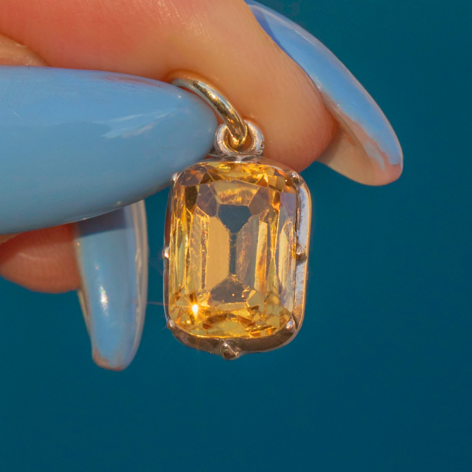VERY GOOD. This Georgian 9ct Gold Golden Topaz charm is in very good condition. The natural Topaz is securely set in an open back setting, allowing light to enhance its rich, yellow hue. Any imperfections are subtle and won’t be noticeable when worn. This Georgian charm is the perfect piece to add a unique flare to your antique jewellery collection!