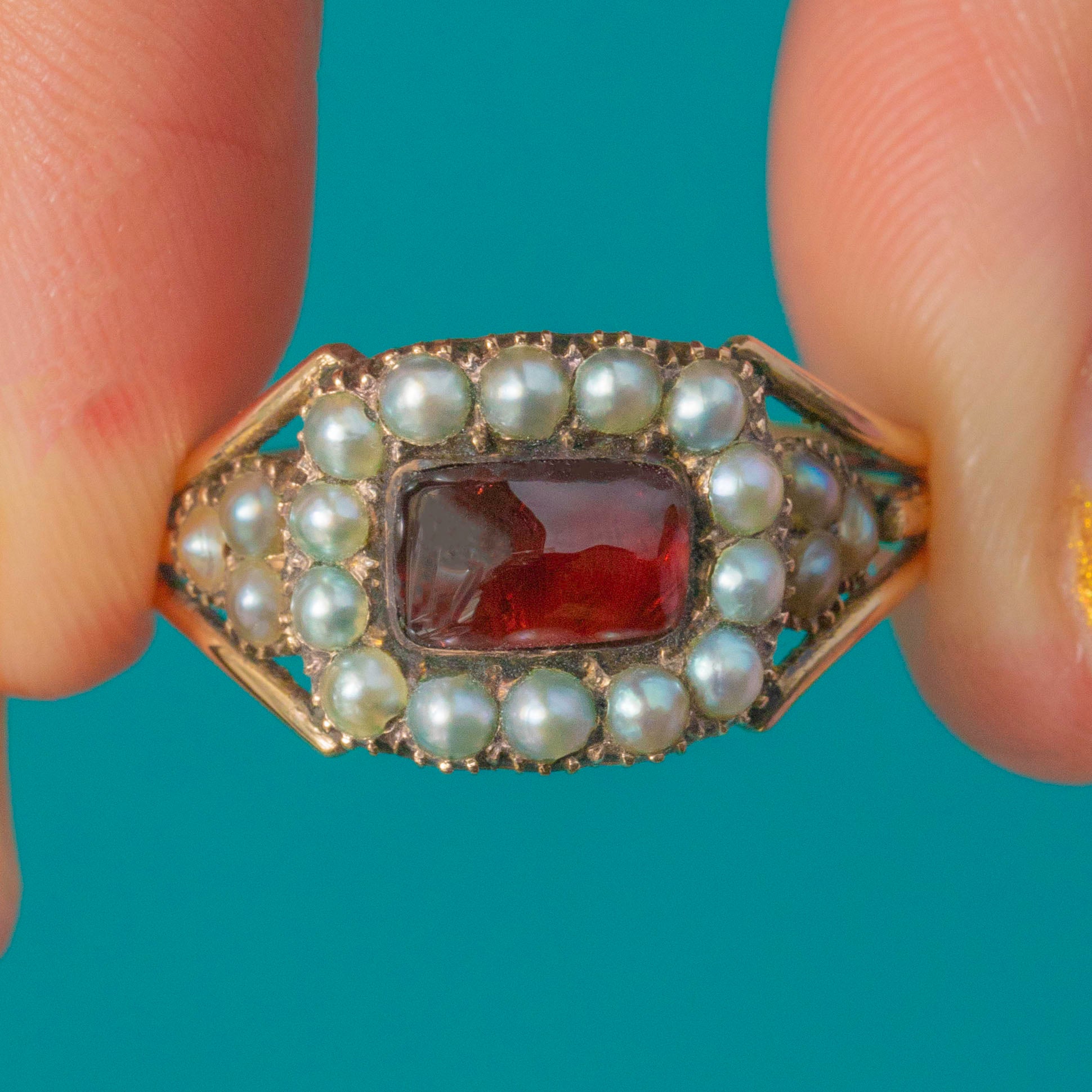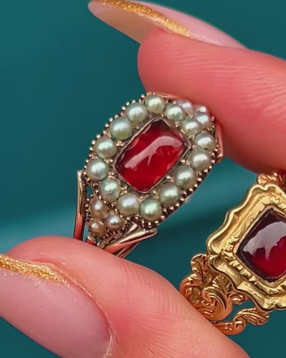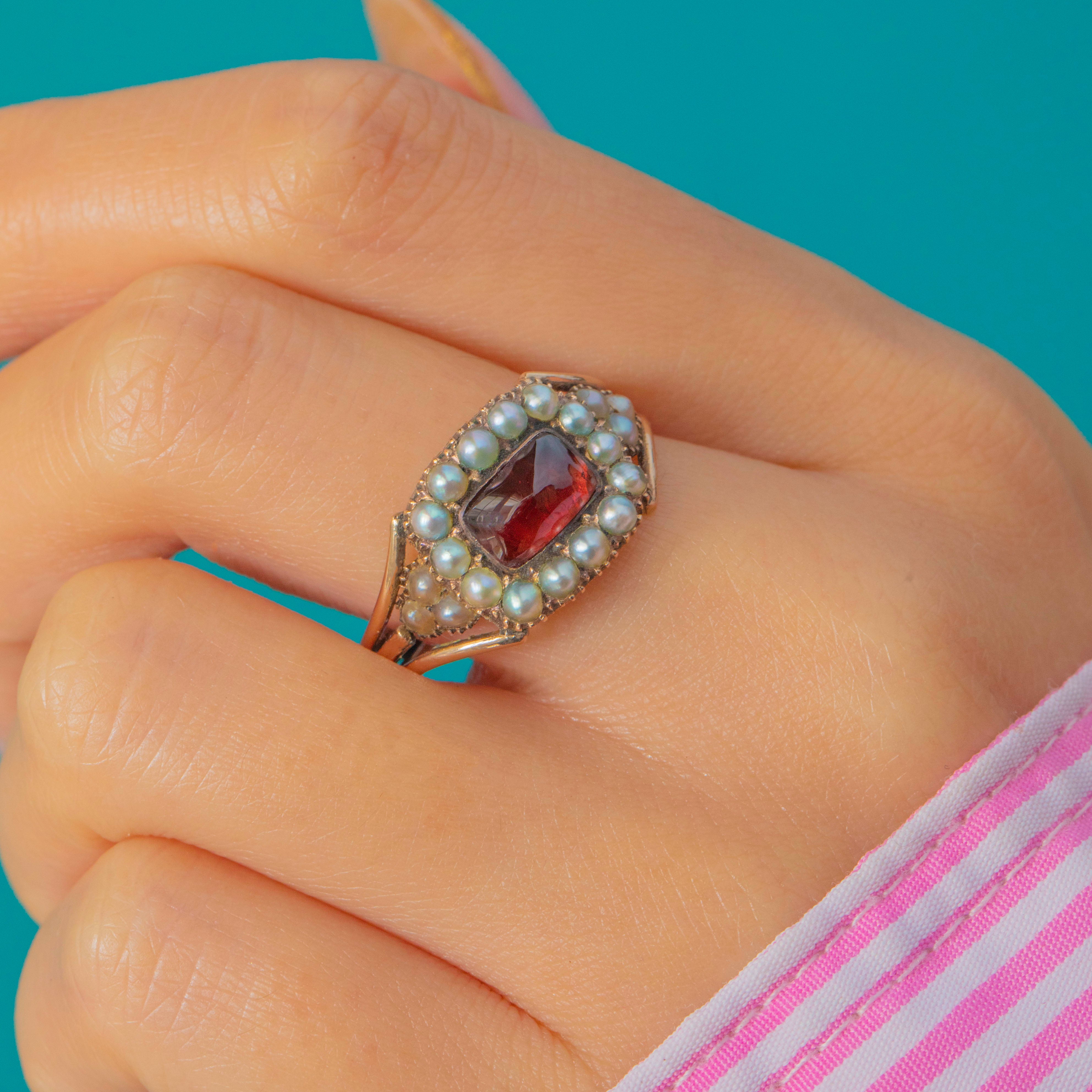 EXCELLENT: Circa 1820, this authentic antique Georgian ring is in outstanding condition for its age. The Garnet is free from chips or scratches and displays a rich, even colour. The Pearls retain their natural lustre with no damage or wear visible. A beautifully preserved antique ring of exceptional quality and charm.