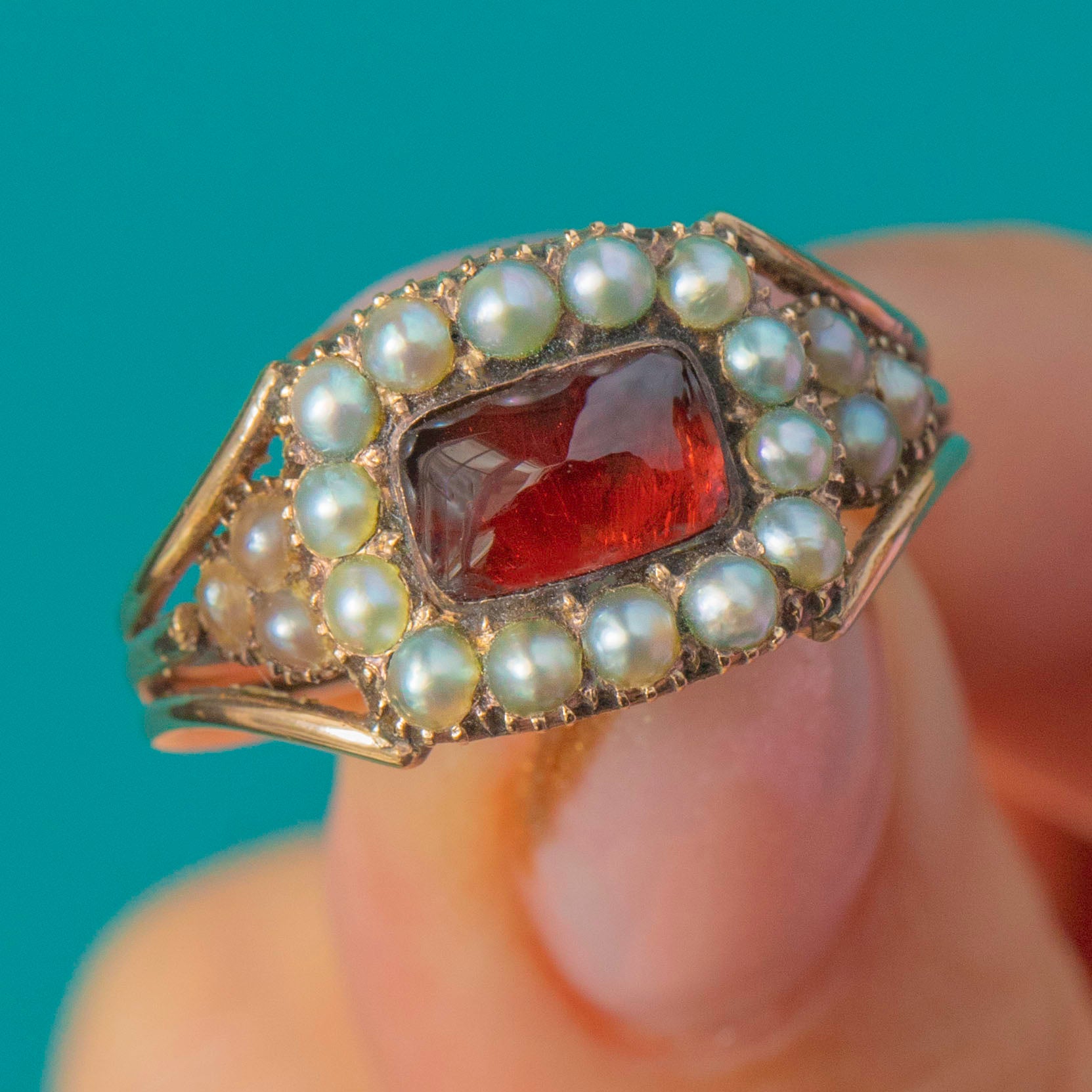 This exquisite Georgian ring showcases a glowing deep-red sugarloaf Garnet framed by a delicate halo of creamy natural Pearls.