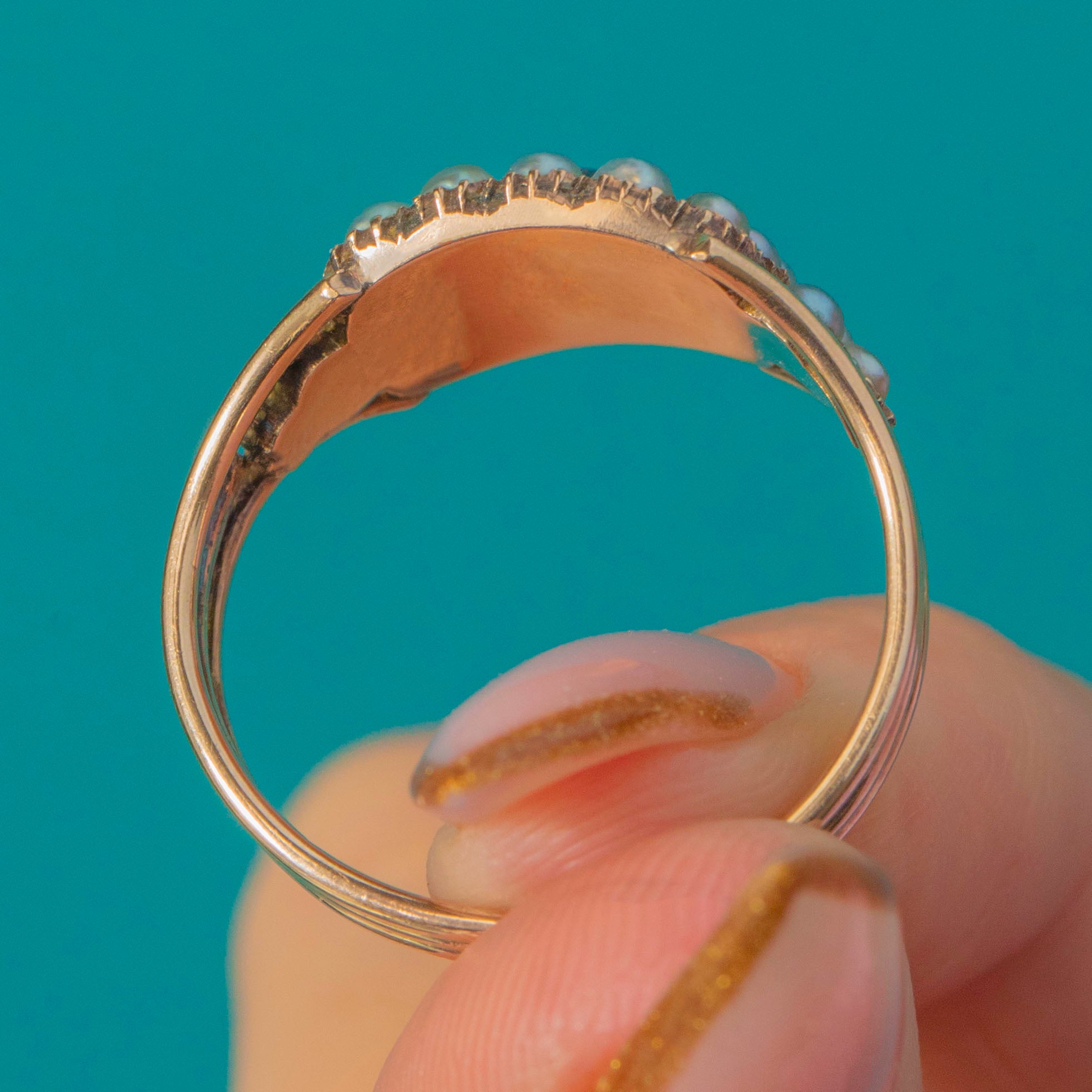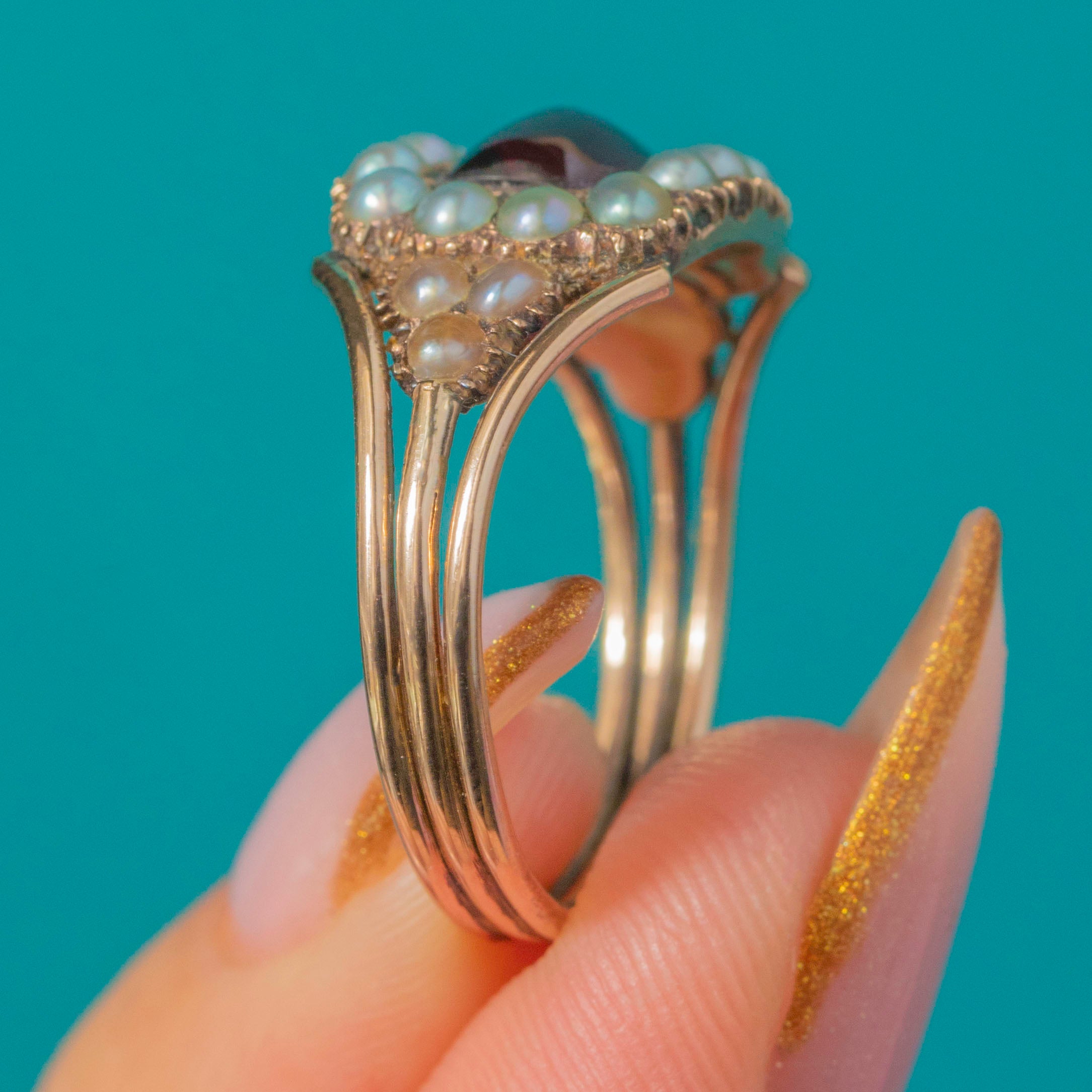The Garnet’s smooth, domed cut radiates warmth and depth, beautifully complemented by the soft lustre of the Pearls in a rich 9ct Gold setting. A fine example of early 19th-century design with typically elegant split-prong shoulders, this ring embodies the undeniable romance and craftsmanship of the Georgian era.