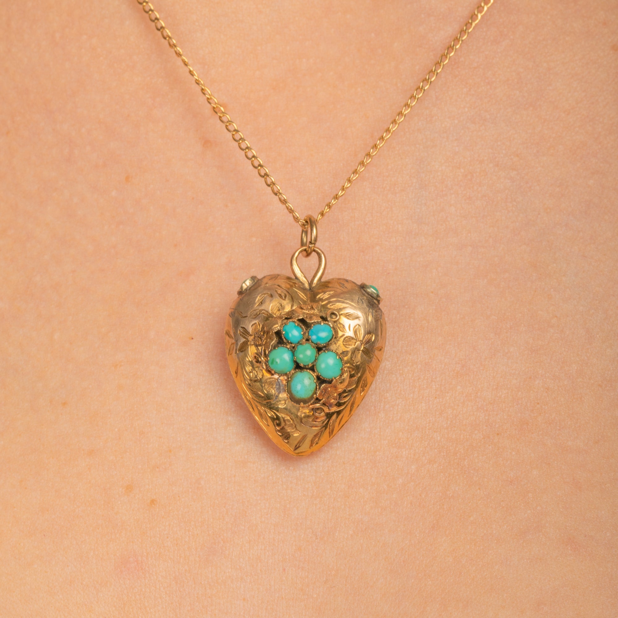 VERY GOOD. This Georgian 9ct Gold Turquoise engraved heart pendant is in very good condition. The Gold has a lovely buttery hue throughout and the engraved details have stood the test of time. There is some general age-related wear throughout, but when considering her grand age this is easily forgivable. With a secure set of gemstones and a fully functioning locket back, this antique heart pendant will make a fabulous addition to your collection!