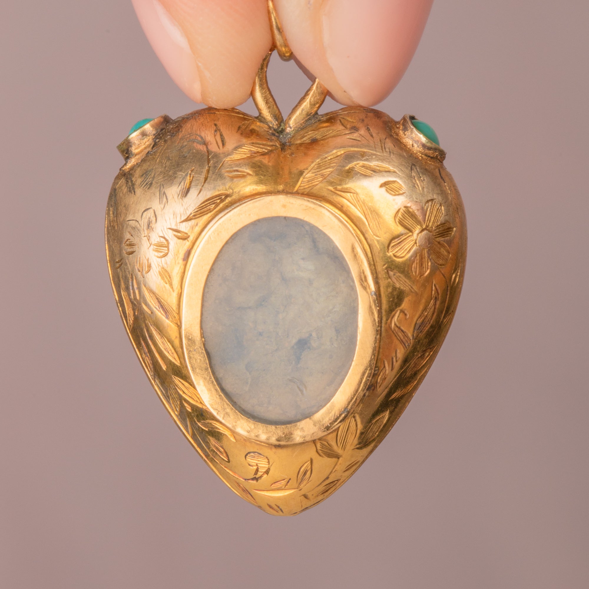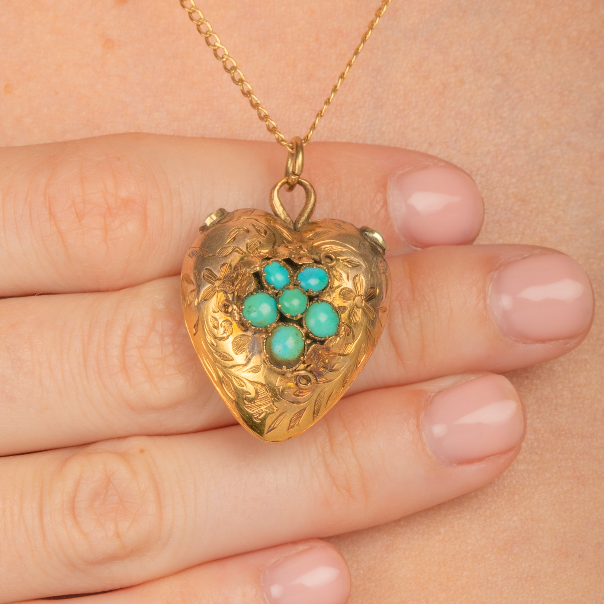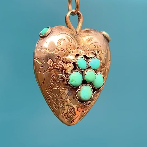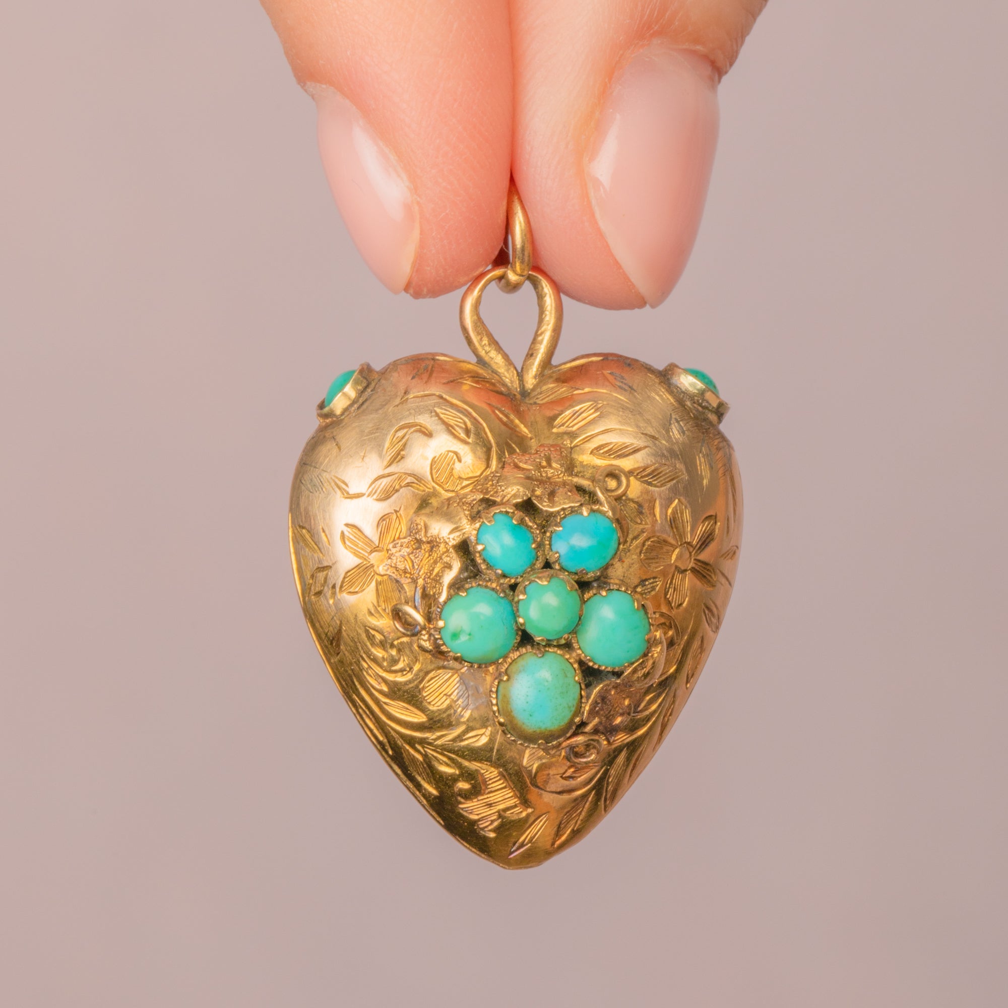 Georgian 9ct Gold Turquoise Engraved Heart Pendant, Locket Back