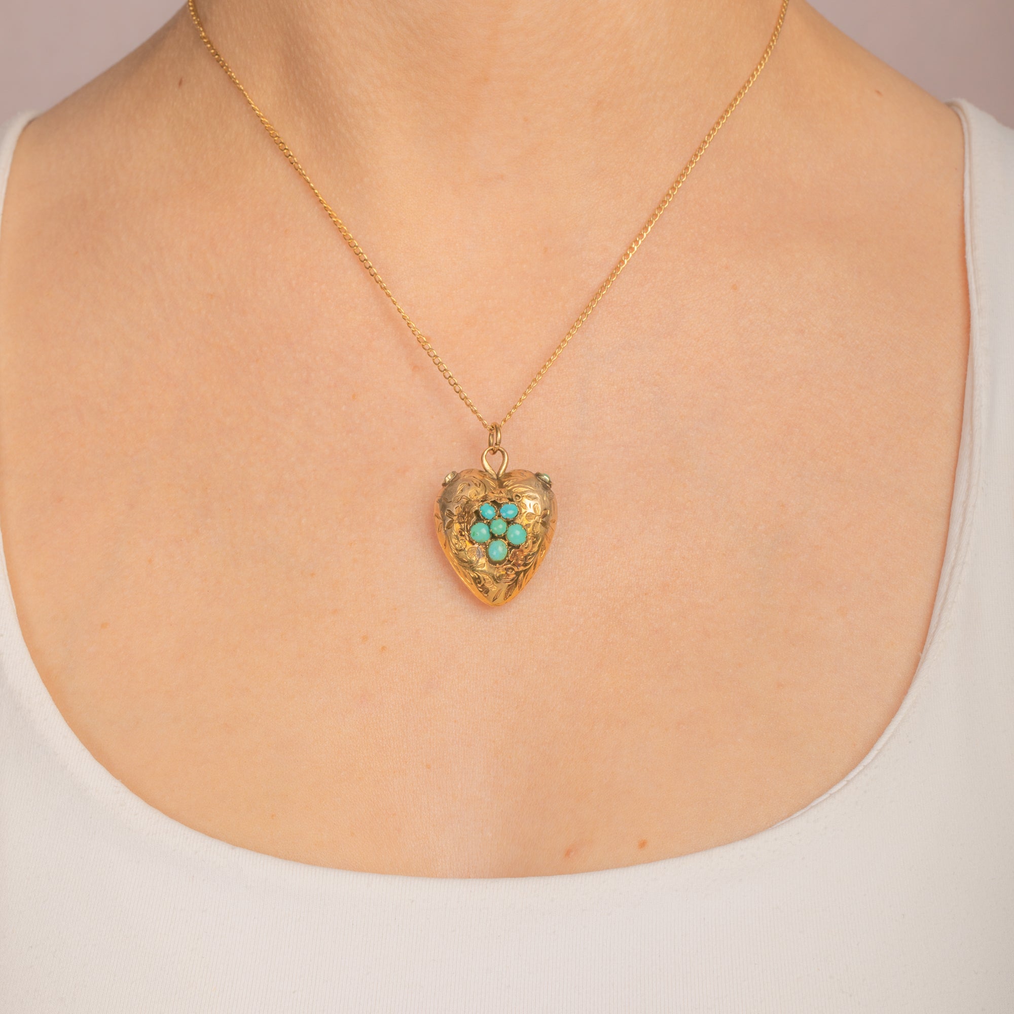 With vine leaves symbolic of fruitfulness, abundance and sensuality, this Georgian 9ct Gold Turquoise engraved heart pendant would make the perfect love token!