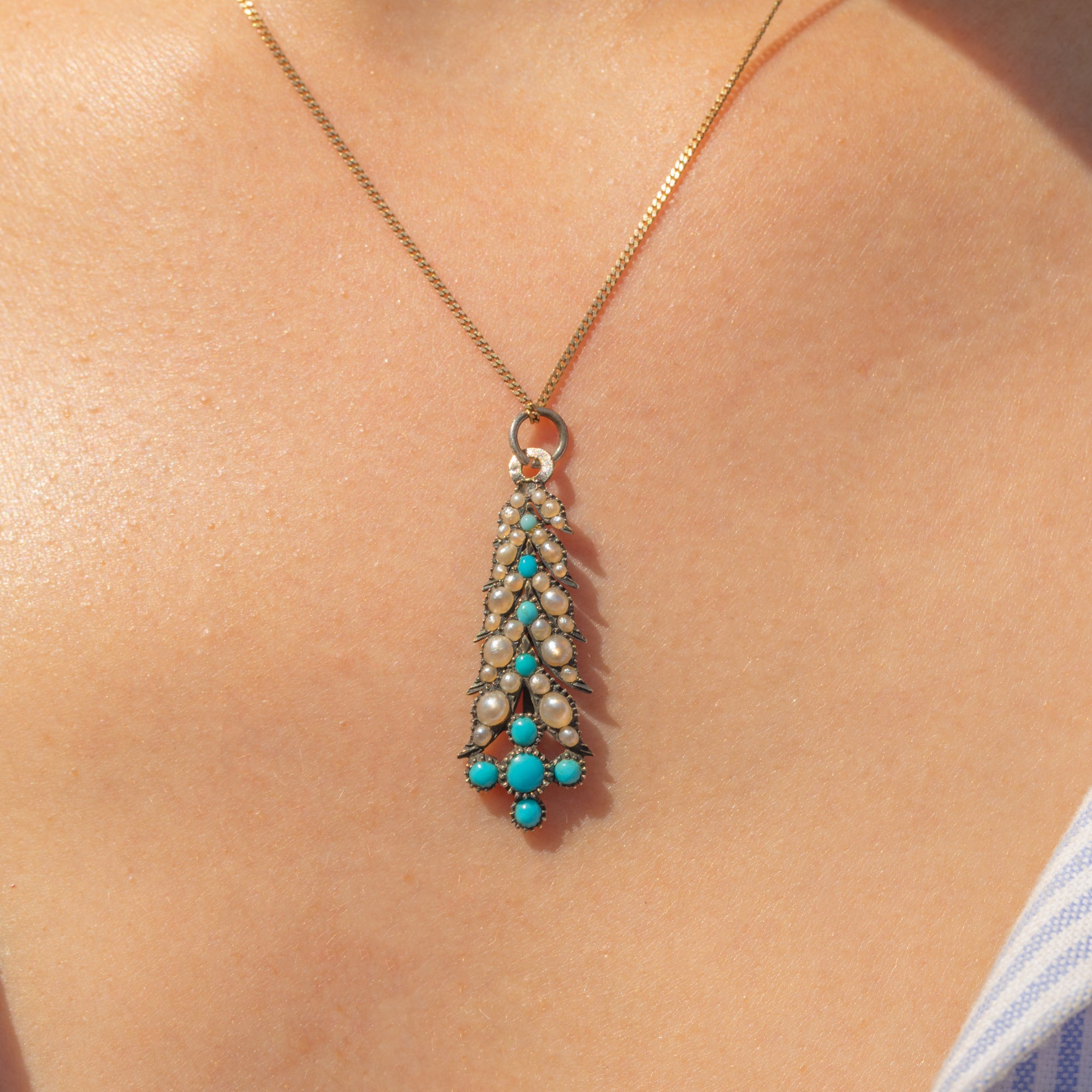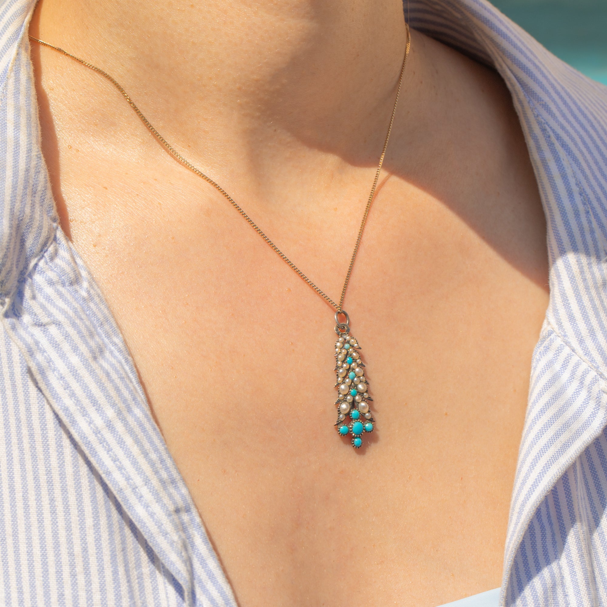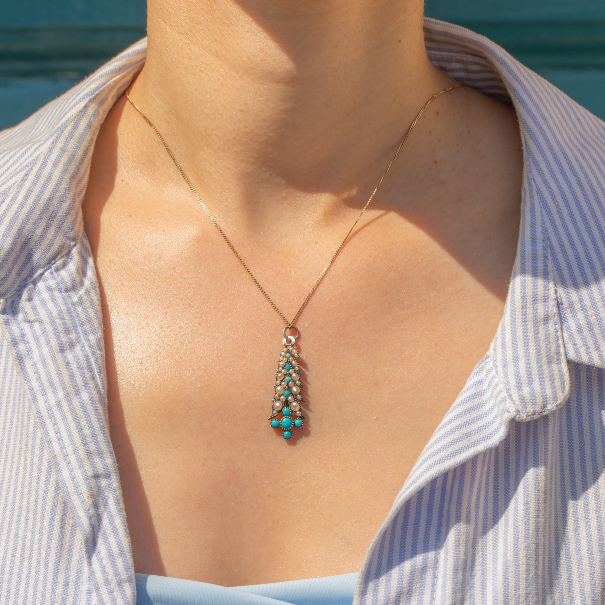 Add a pop of colour to your décolletage with this Turquoise and Pearl 9ct Gold drop pendant!