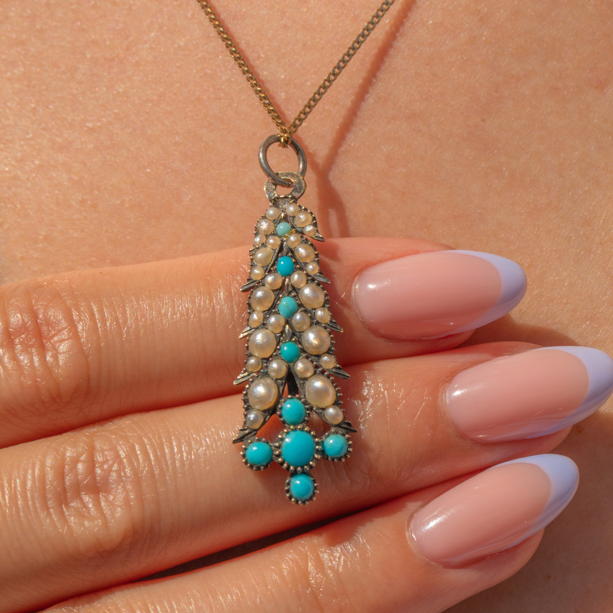 Crafted from a myriad of lustrous Pearls interspersed with vibrant Turquoise stones, this Georgian pendant is packed with antique charm! She is crafted wonderfully from 9ct Gold and has a nice, fluid movement. This antique pendant will look lovely suspended from a fine Gold chain!