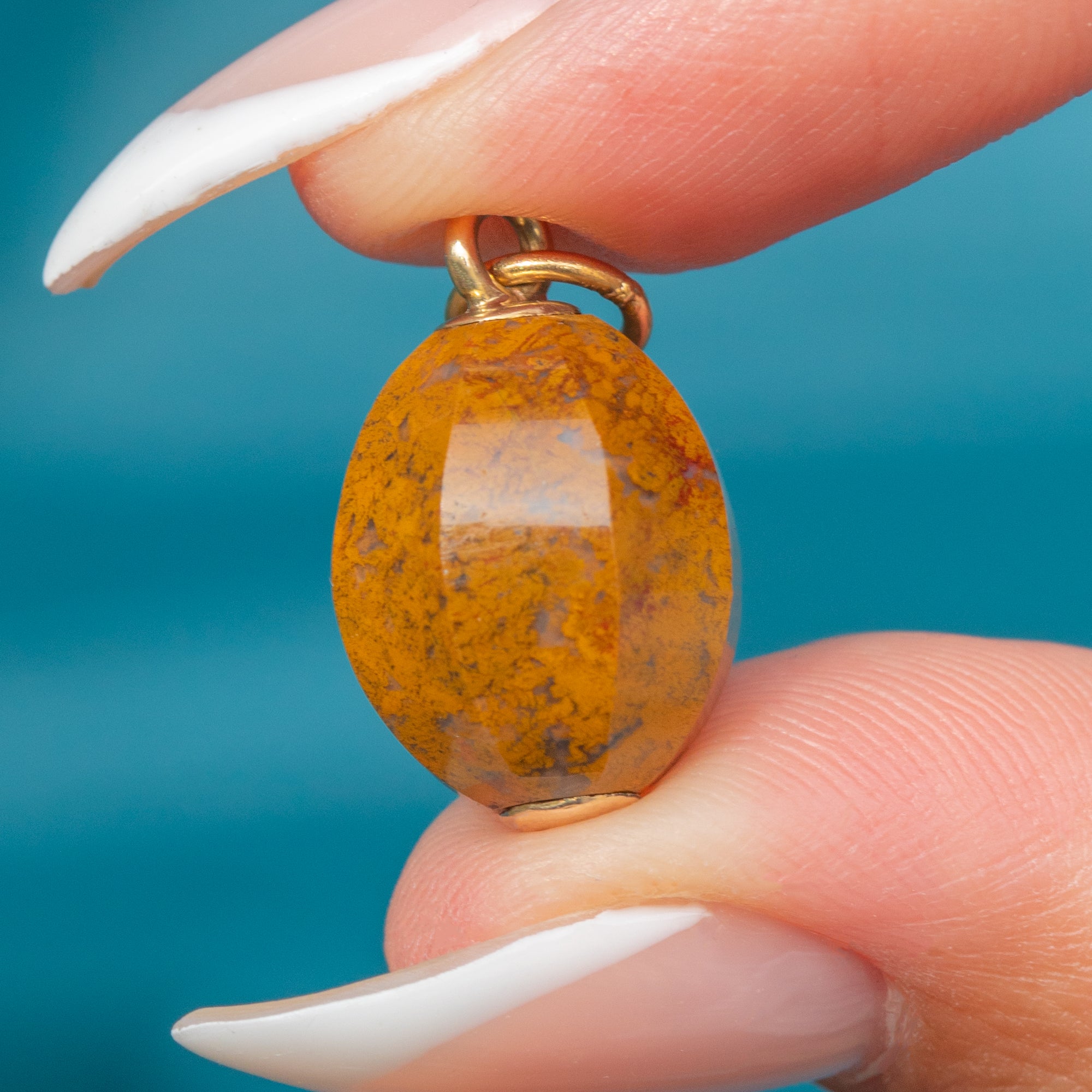 This Georgian pendant centres on a handsome Jasper bead in warm ochre tones, peppered with natural flecks and clouds that give it wonderful depth. The bead has a softly faceted, barrel-oval profile that catches the light beautifully and brings a tactile, antique charm.