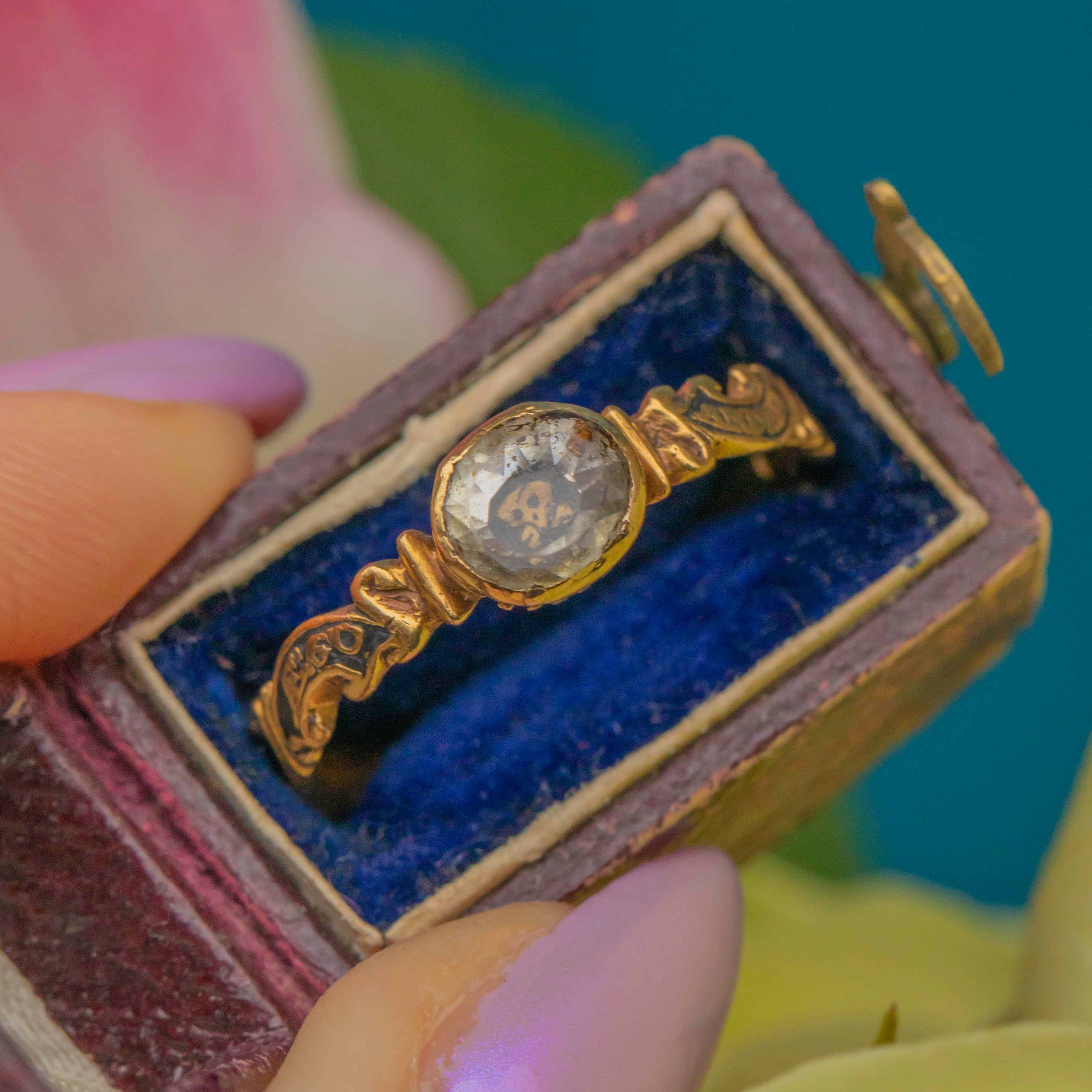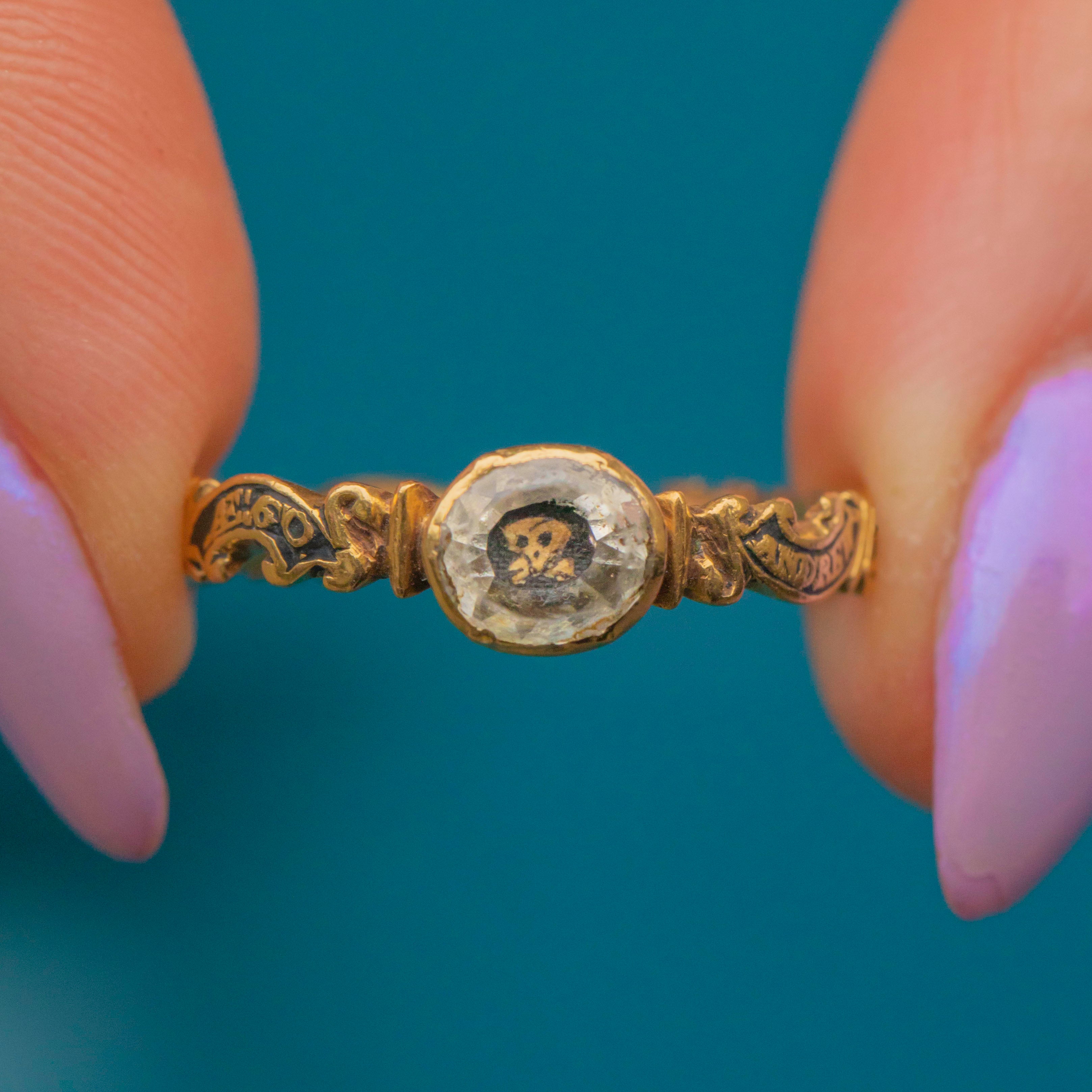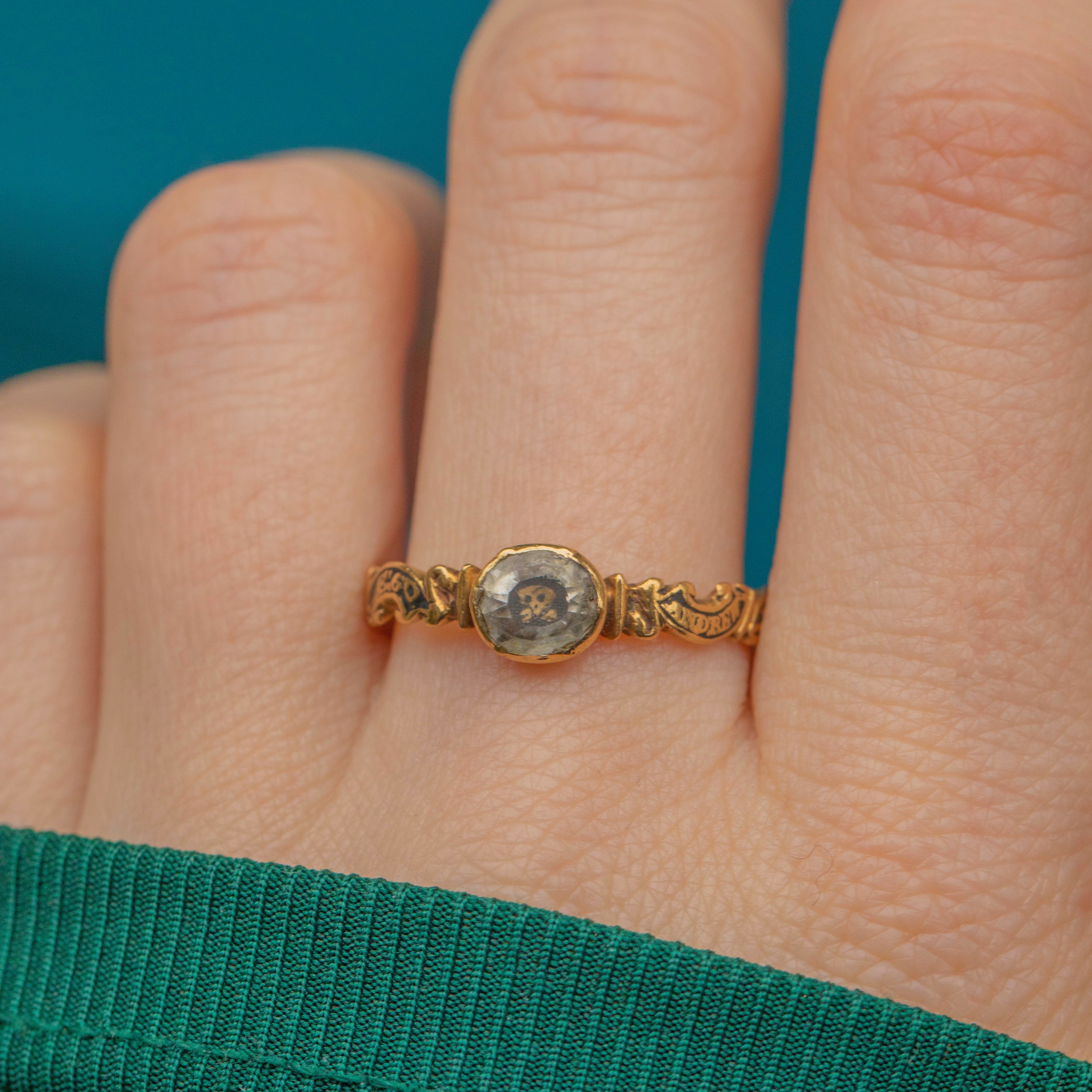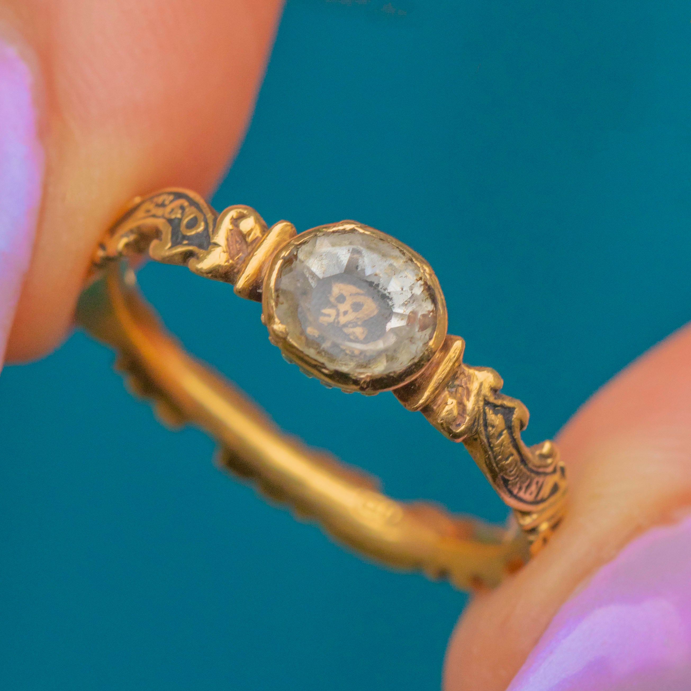 This exact ring features on page 156 of the well-known book 'Georgian Jewellery' by the late Ginny Redington Dawes and Olivia Collings. The central Rock Crystal features a skull and cross bones that will certainly intrigue appreciators of memento mori jewellery!