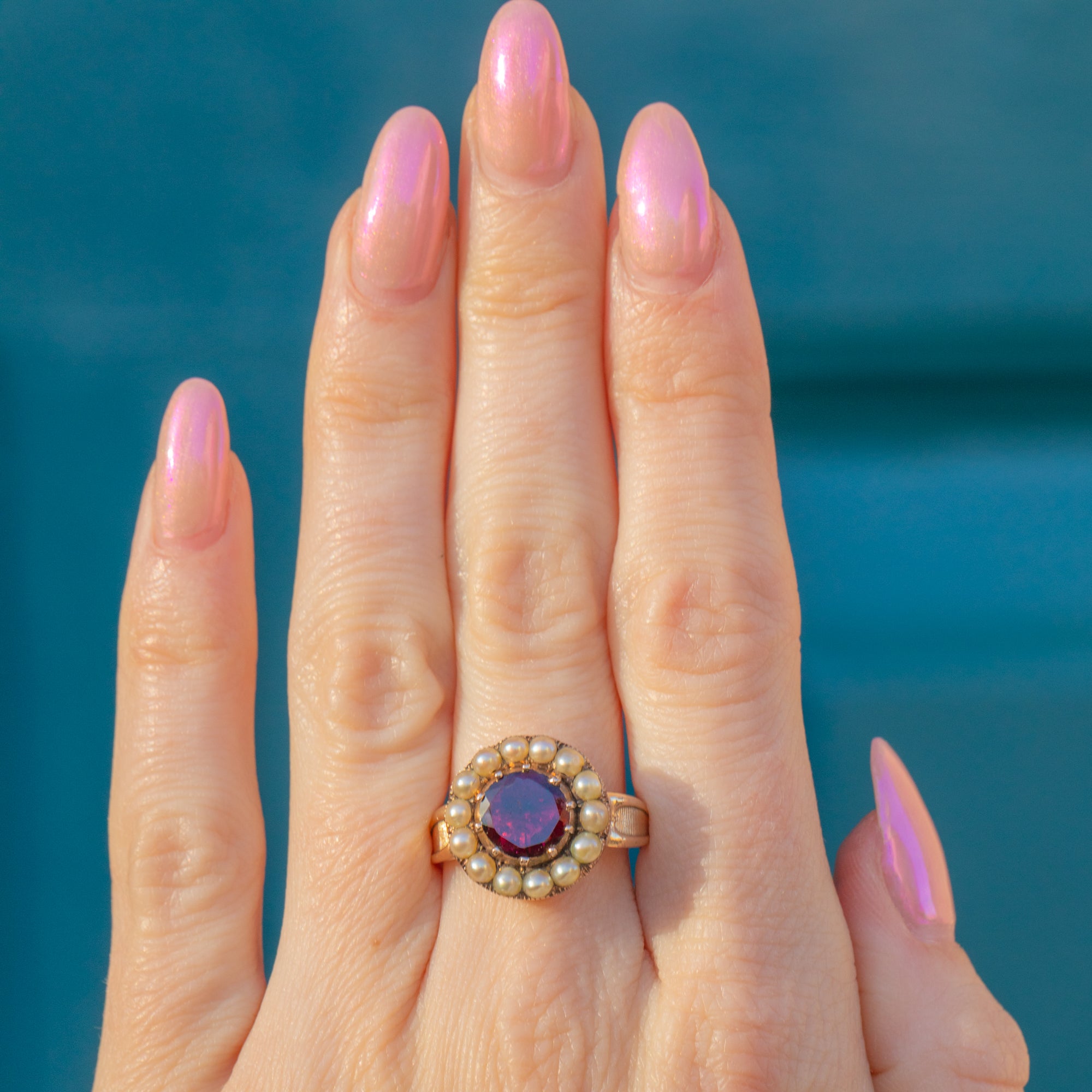 Boasting a fabulous merlot-hued 0.60ct flat-cut Garnet haloed by bright and luminous Pearls displayed in 9ct Gold with a rosy 15ct Gold band, this Georgian ring is an undeniably chic and feminine piece.