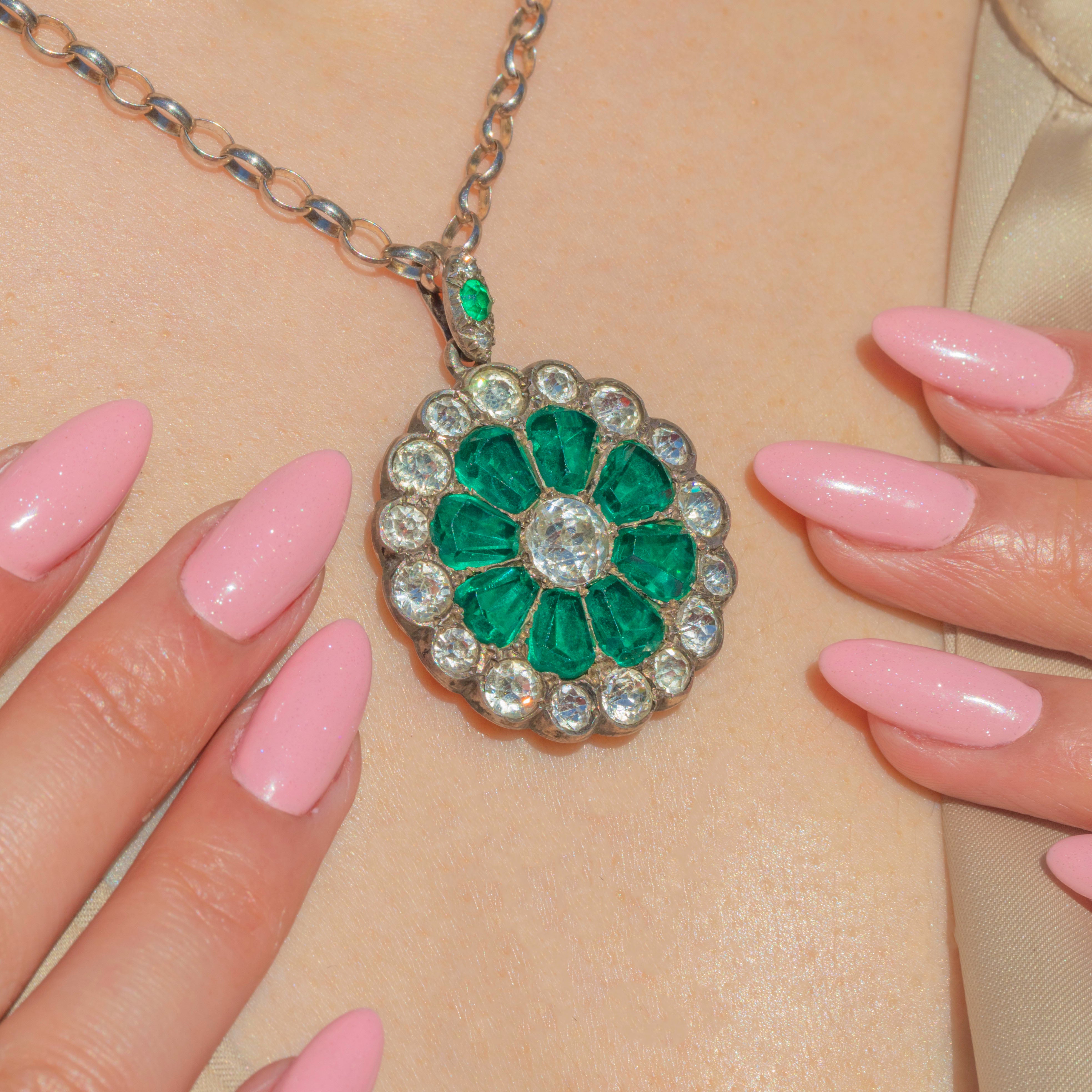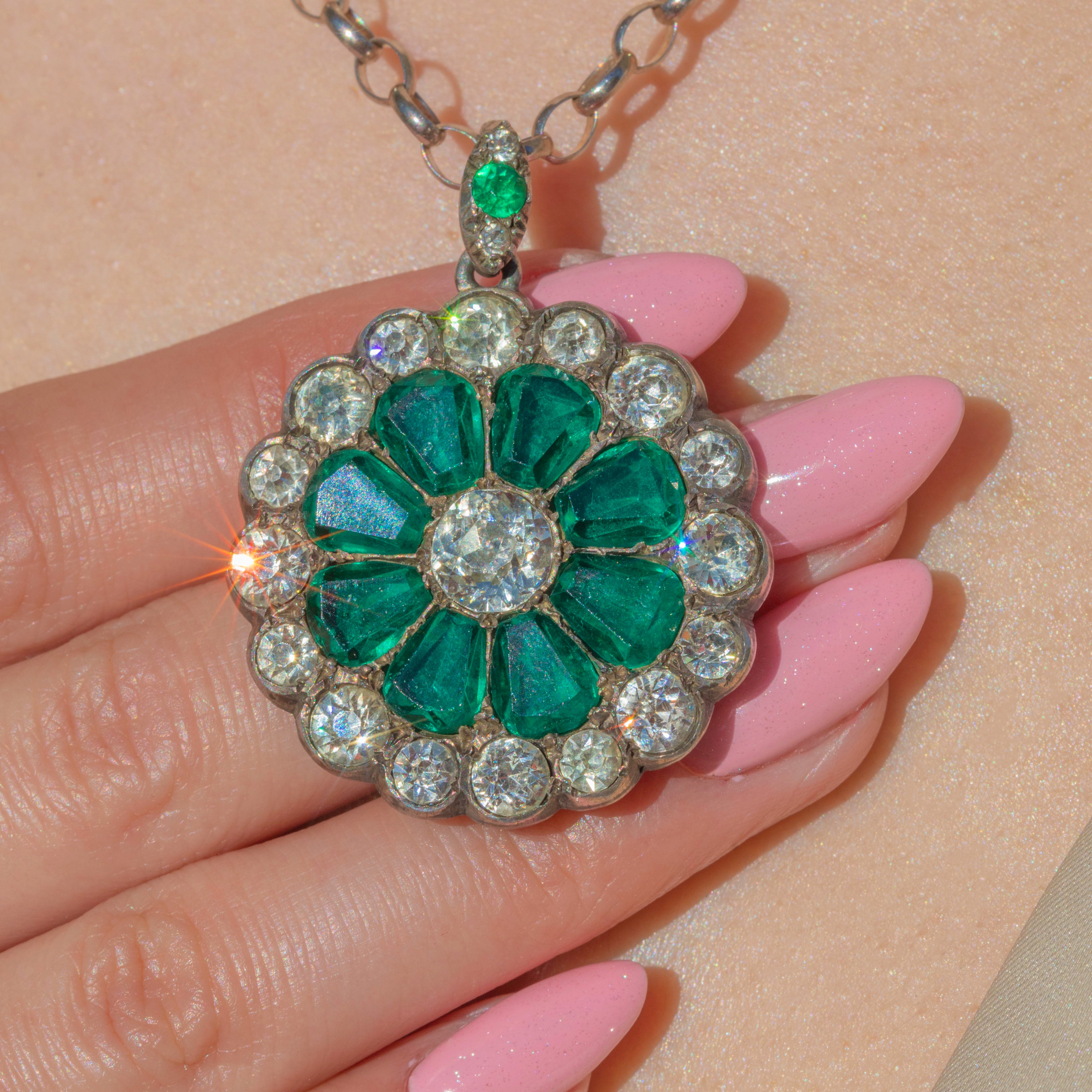 Comprised of vibrant white and green Paste set in Sterling Silver and arranged into a glorious floral design, this Georgian pendant dazzles from every angle and is bursting with antique charm!