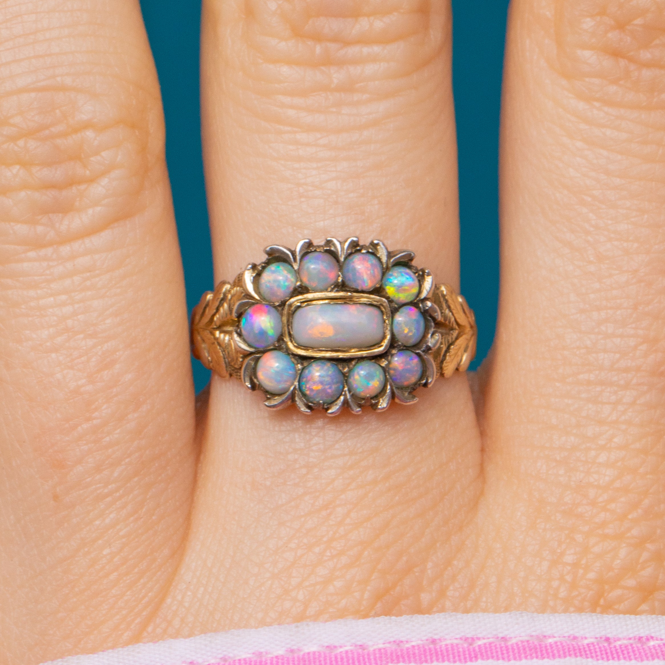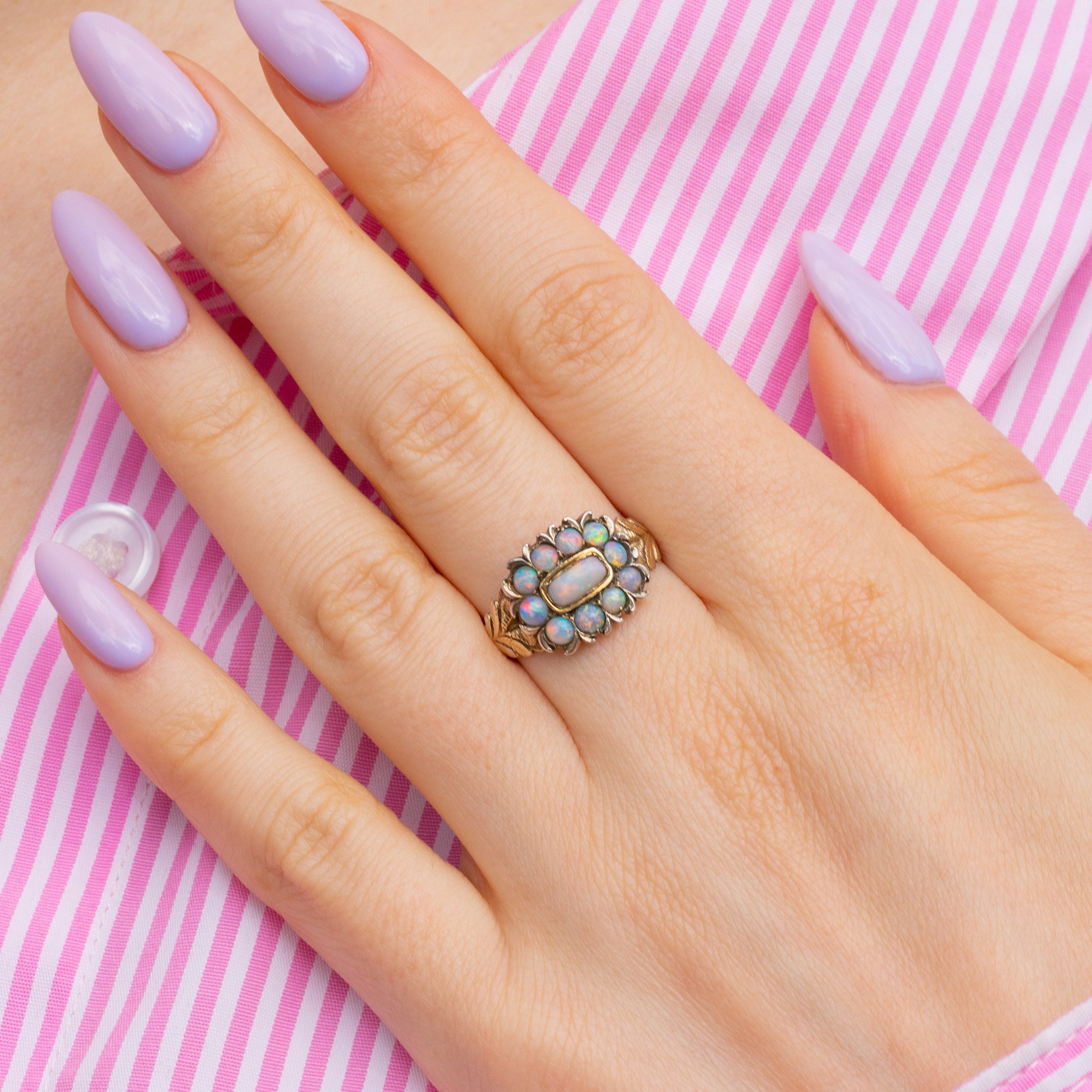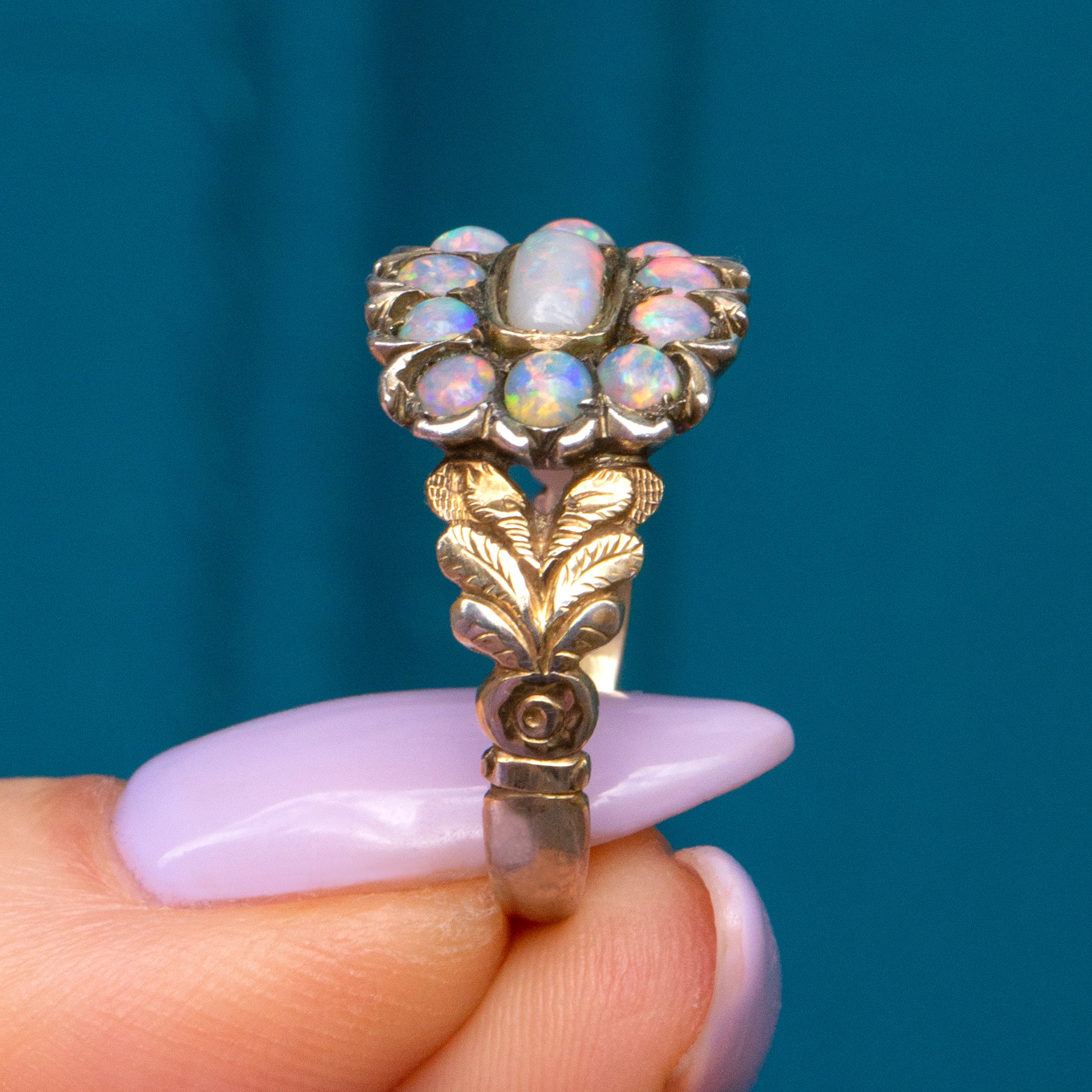 Bring otherworldliness from a bygone era into the present day with this Georgian Opal flower cluster ring! Vivid Opals form her floral cluster, each one akin to a galactic orb with a myriad of iridescent colours shimmering across their cabochon surfaces.
