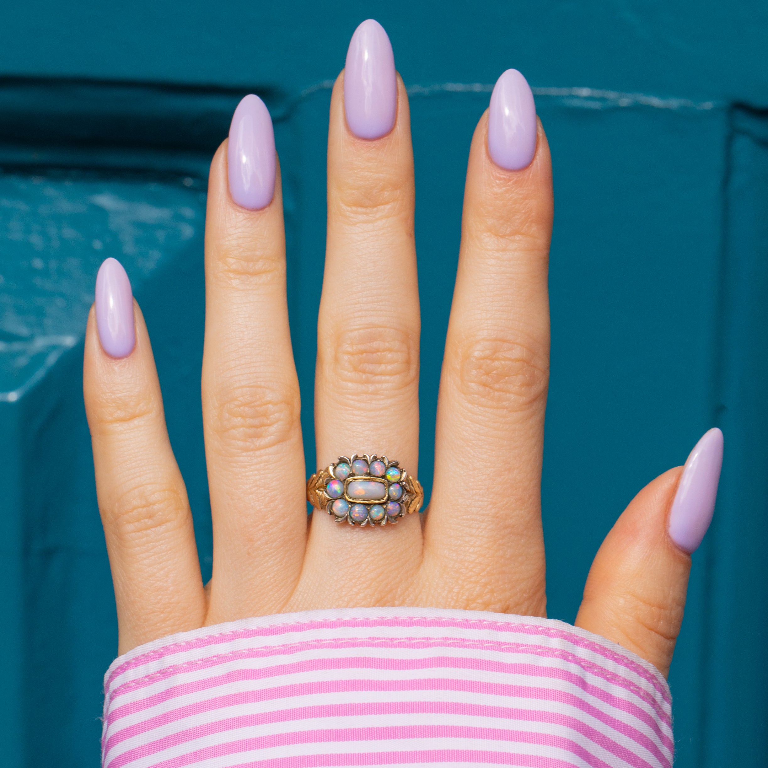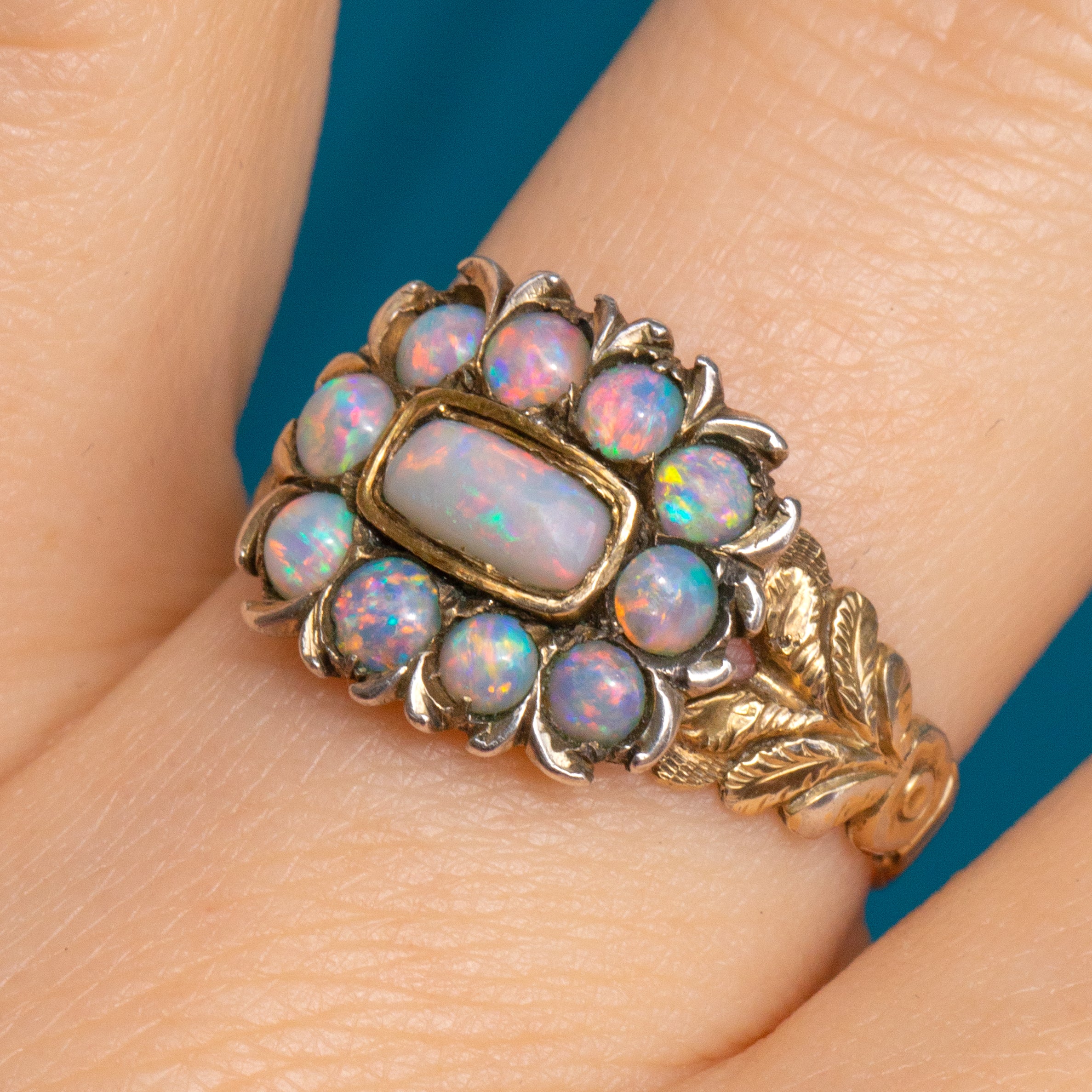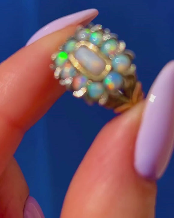 Bring otherworldliness from a bygone era into the present day with this Georgian Opal flower cluster ring! Vivid Opals form her floral cluster, each one akin to a galactic orb with a myriad of iridescent colours shimmering across their cabochon surfaces.
