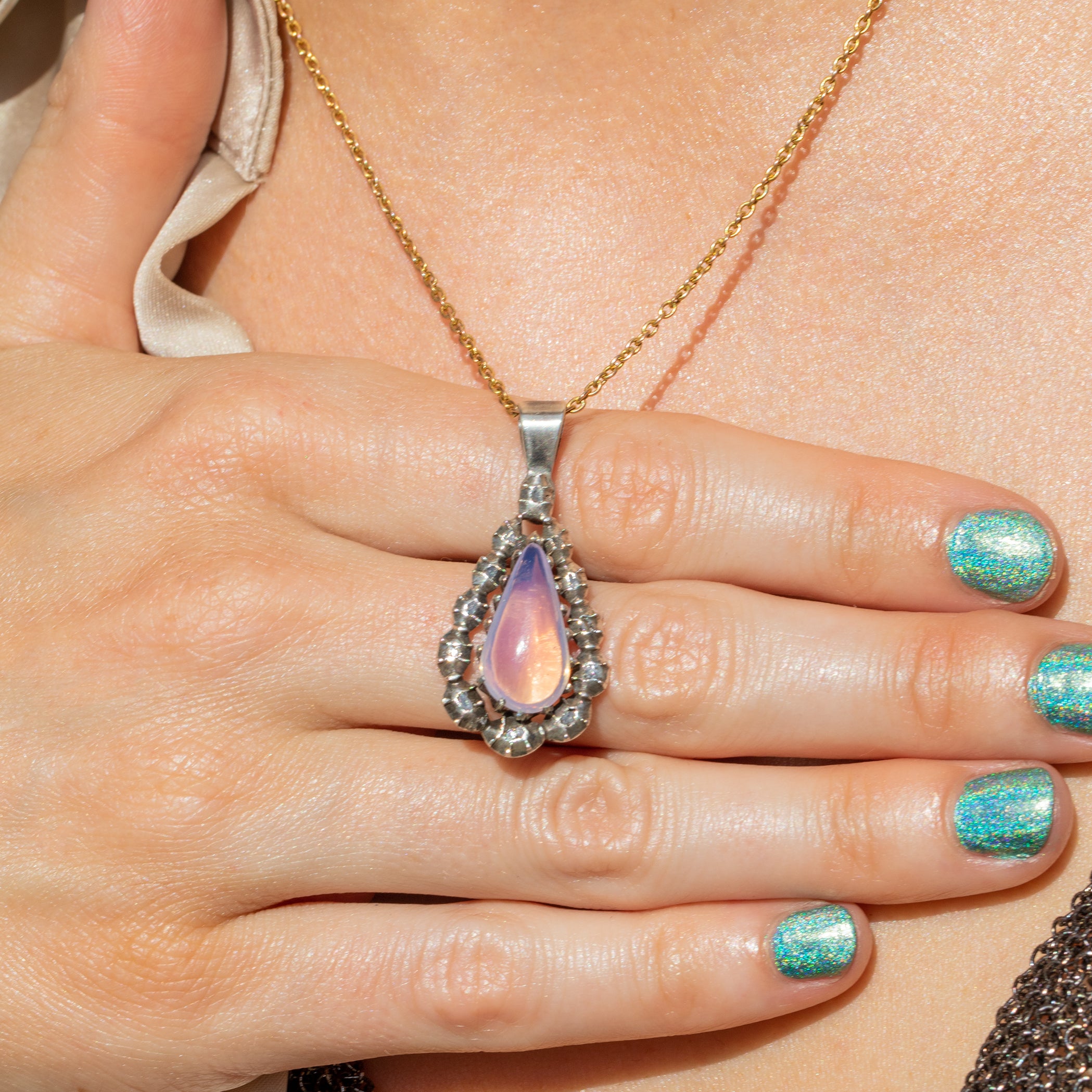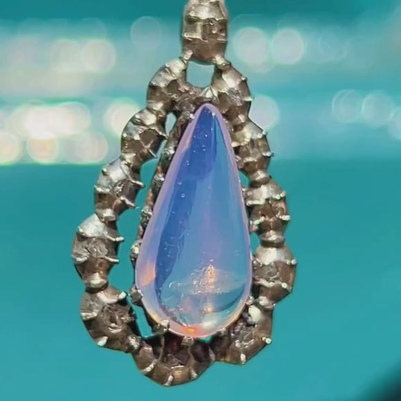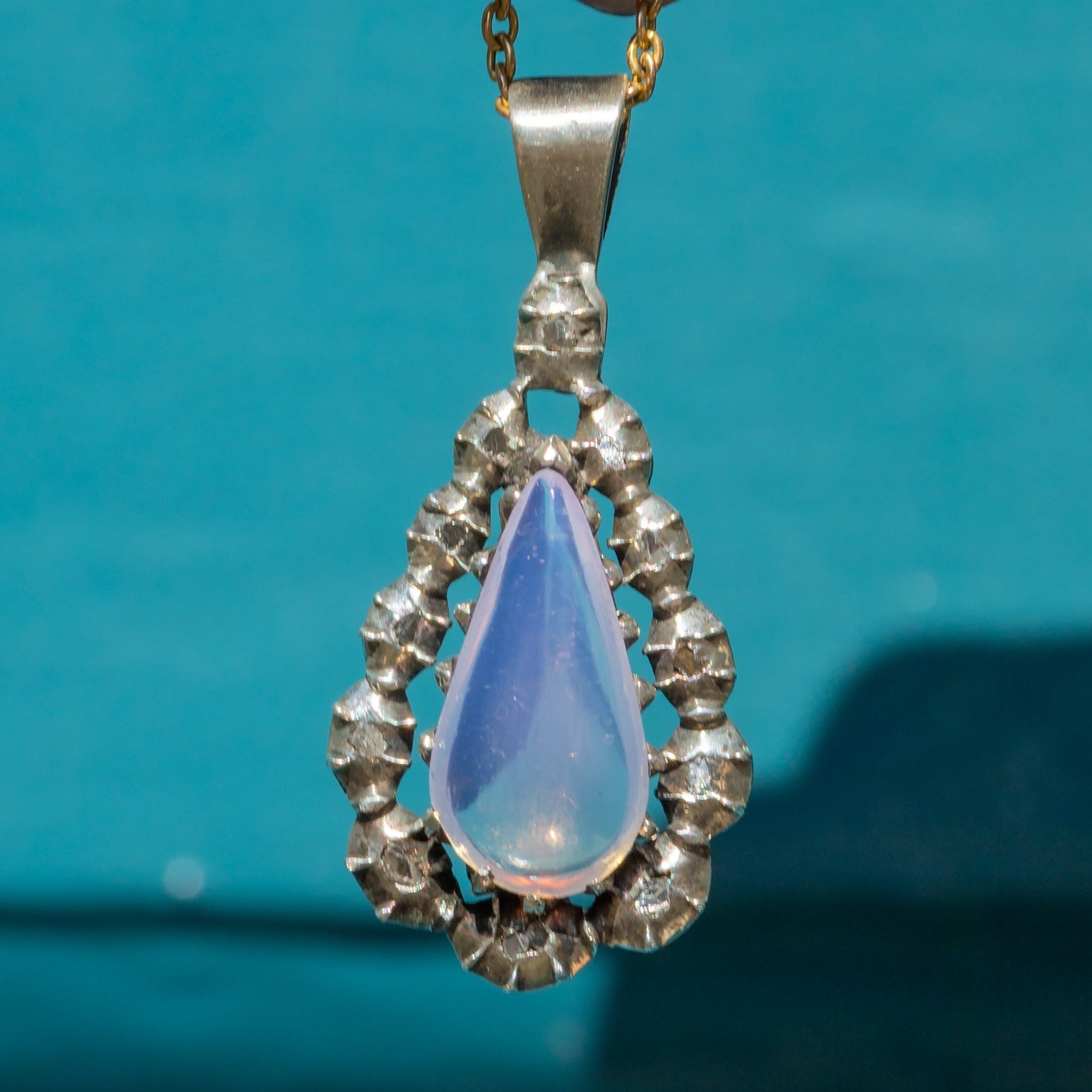 This Georgian Opaline and Diamond pear drop pendant would make a heavenly addition to your antique jewellery collection! Centred by an Opaline exuding ethereal milky hues surrounded by a halo of Diamonds encased in pie crust settings, this Georgian pendant will enchant anyone who lays eyes on her.