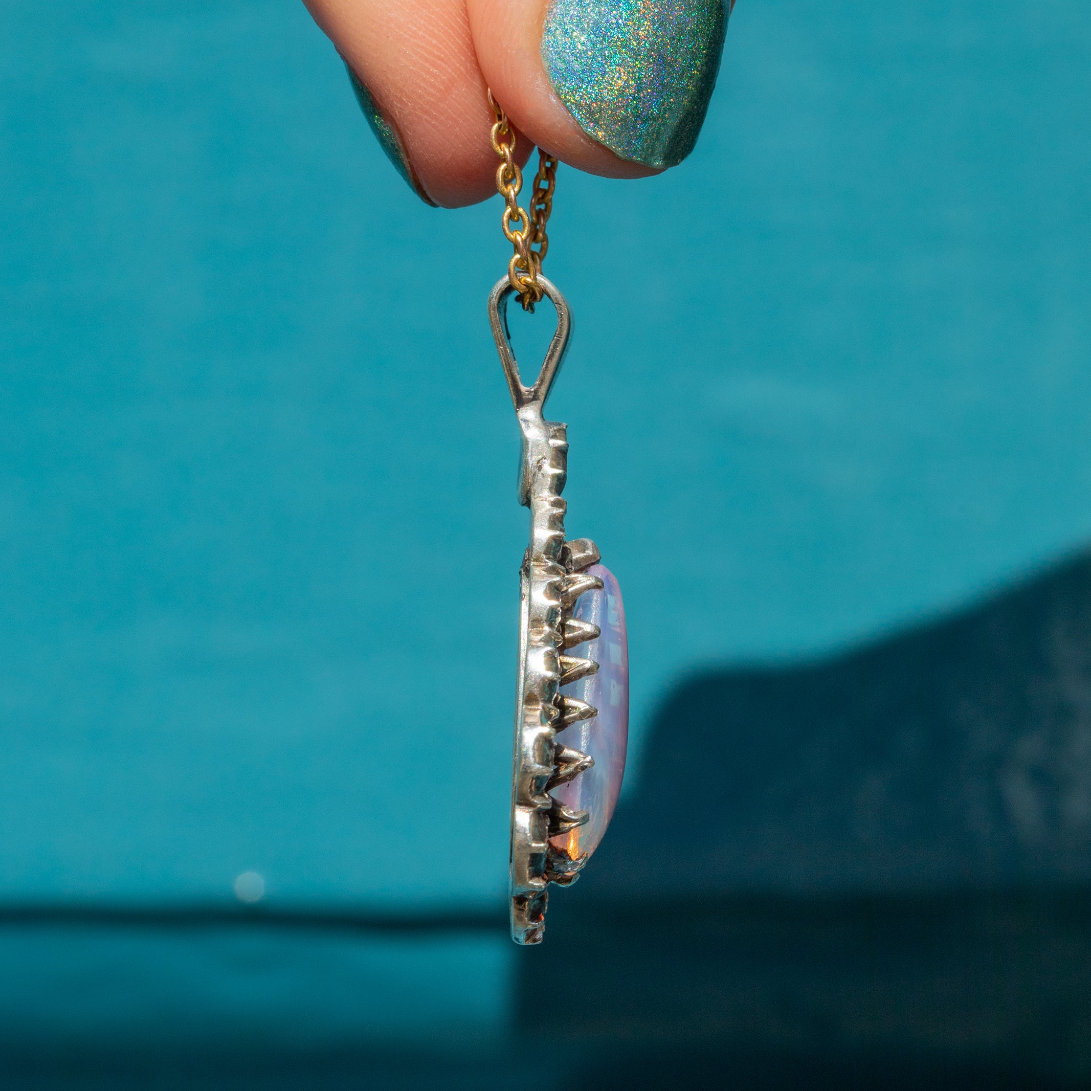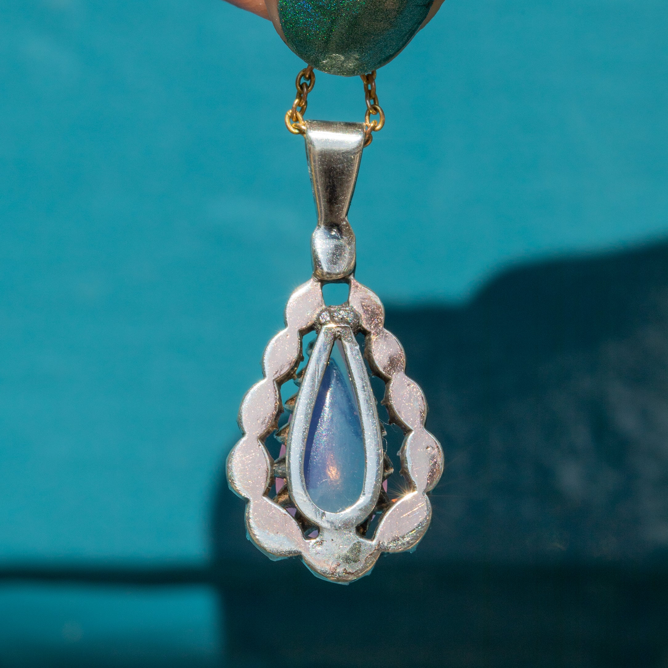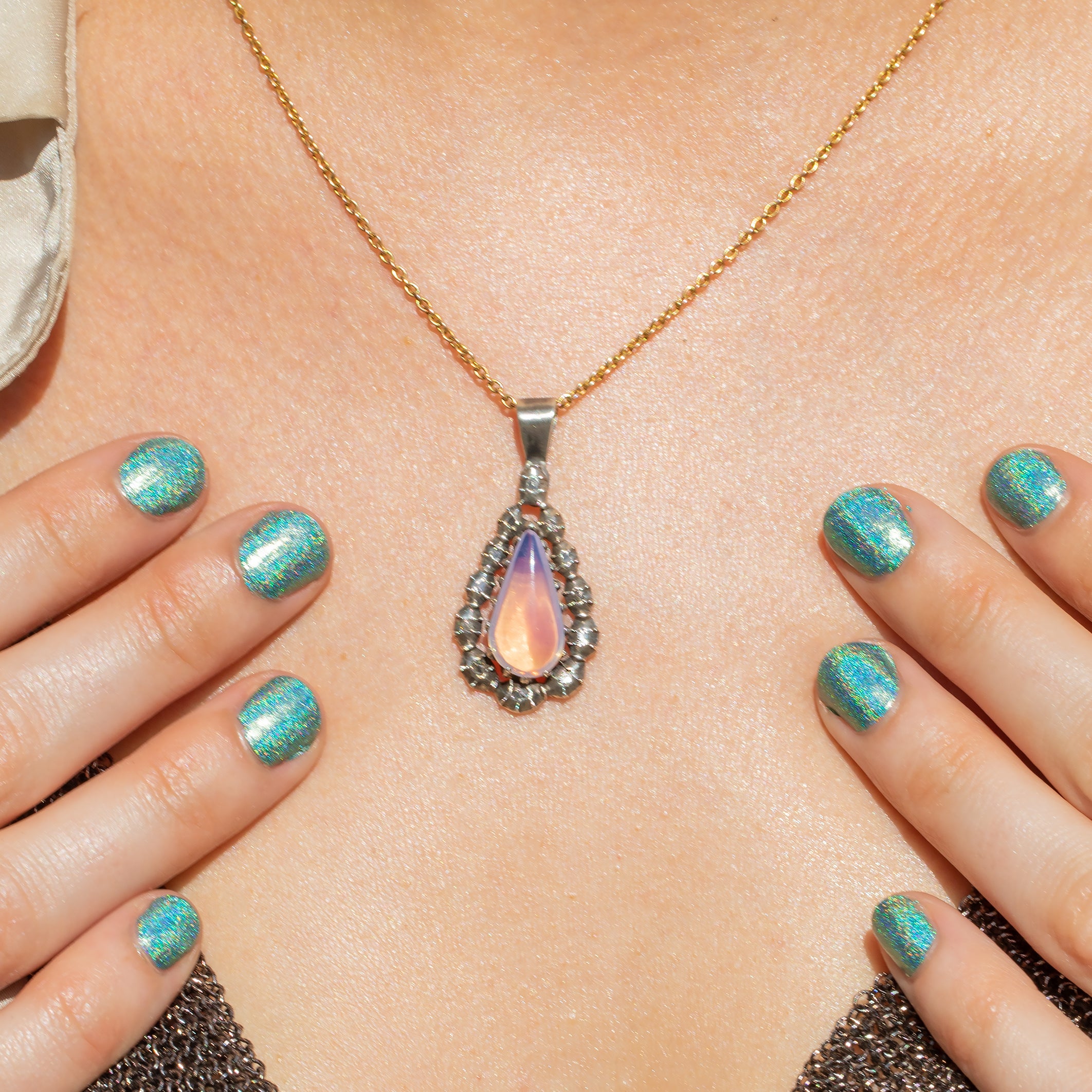 This Georgian Opaline and Diamond pear drop pendant would make a heavenly addition to your antique jewellery collection! Centred by an Opaline exuding ethereal milky hues surrounded by a halo of Diamonds encased in pie crust settings, this Georgian pendant will enchant anyone who lays eyes on her.