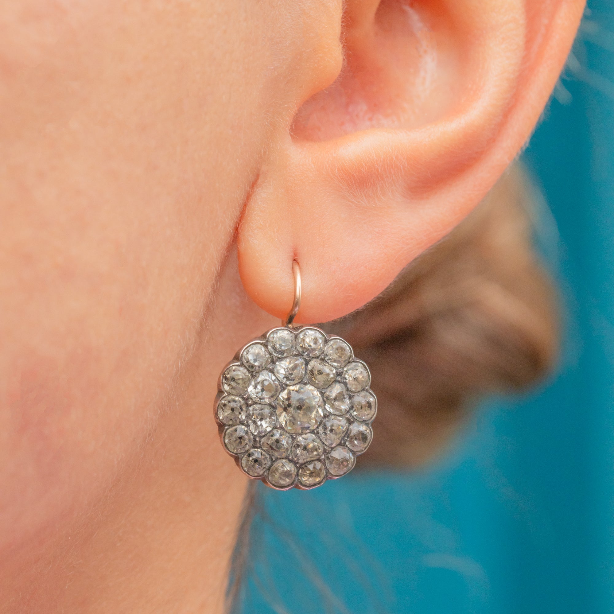 These exquisite Georgian Paste earrings shimmer with old-world brilliance. Each earring features a double halo of hand-cut Black Dot Paste stones set in Silver, catching the light with that soft, candlelit sparkle so distinctive of the Georgian era. Their impressive size and uniform stones make them particularly special — a rare surviving pair in such excellent condition.