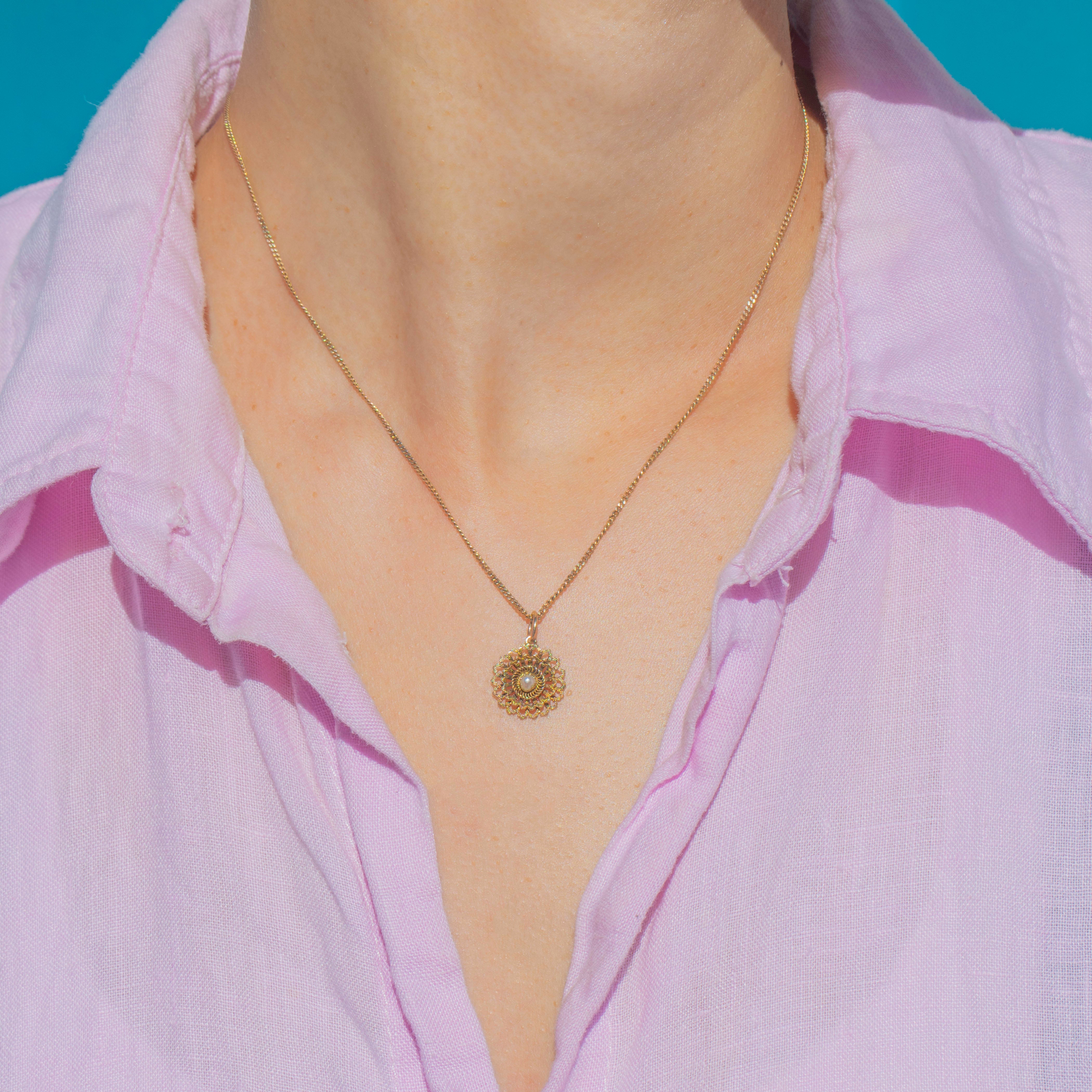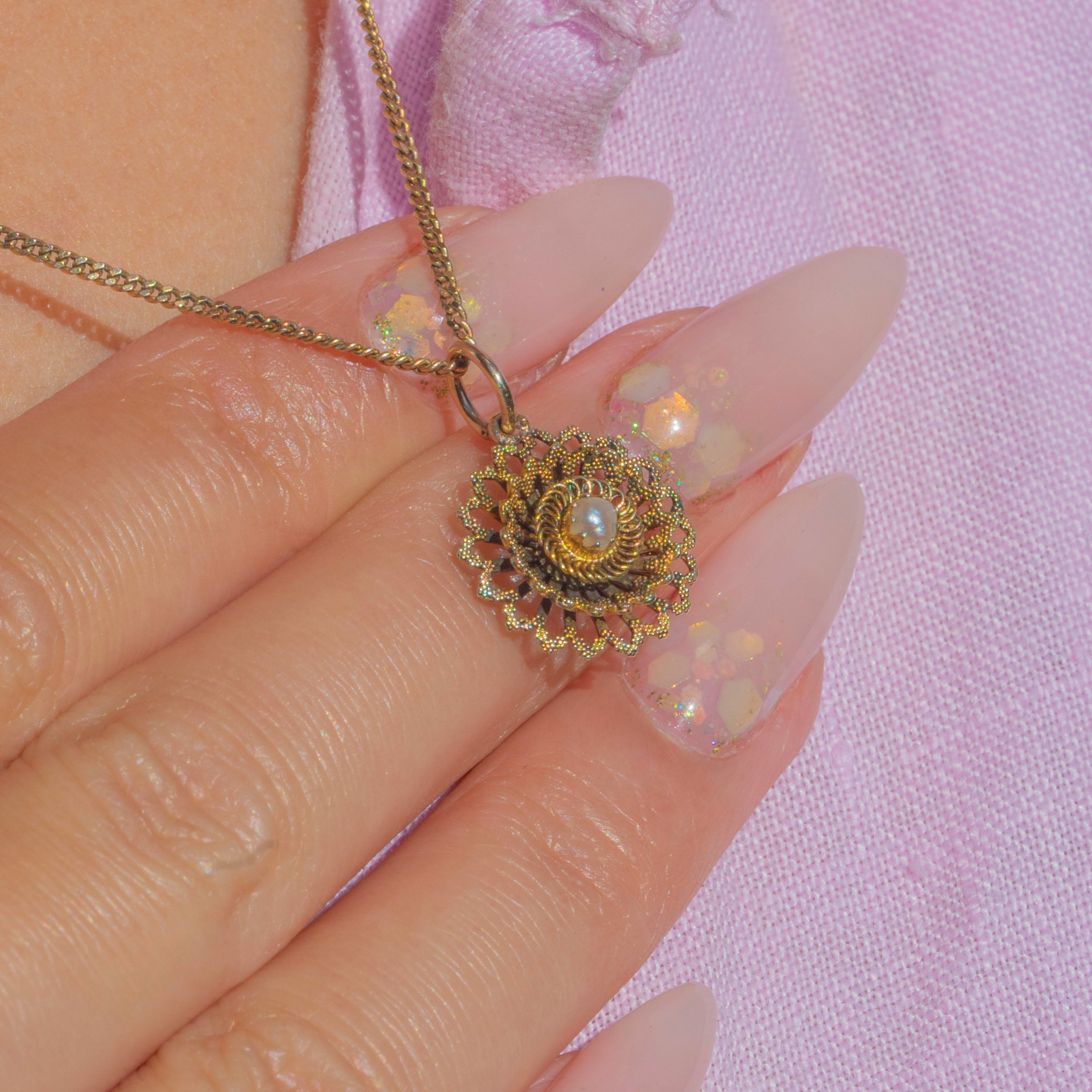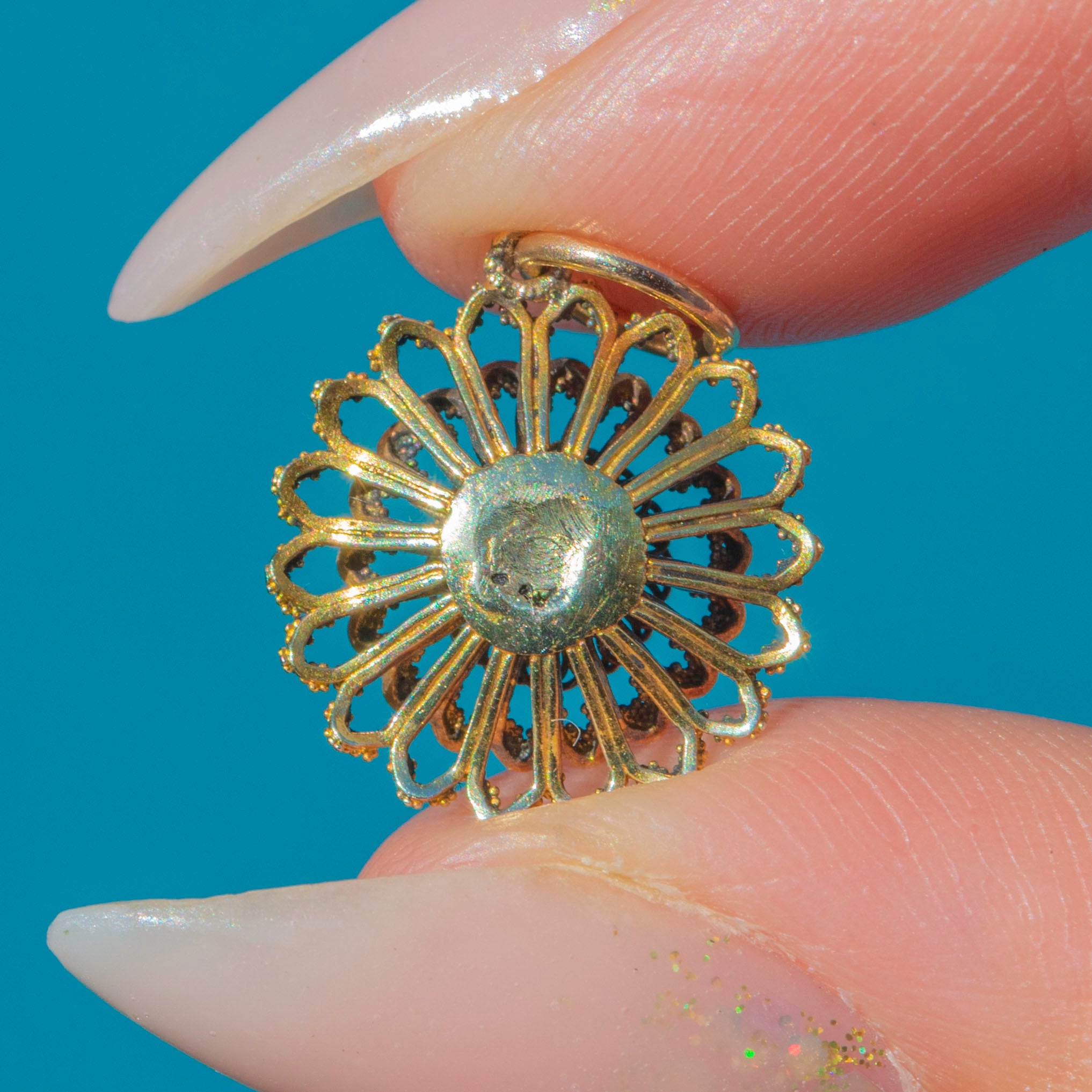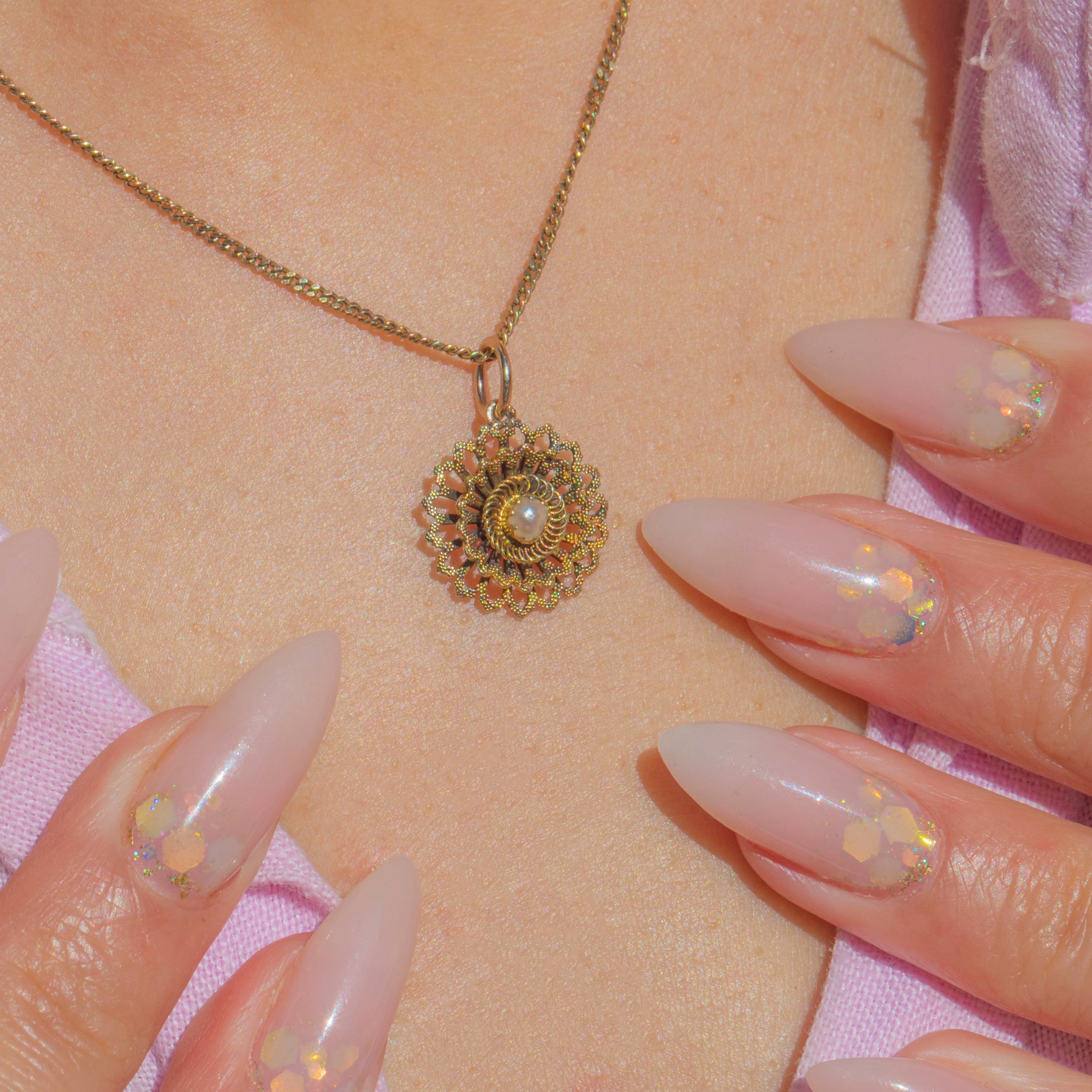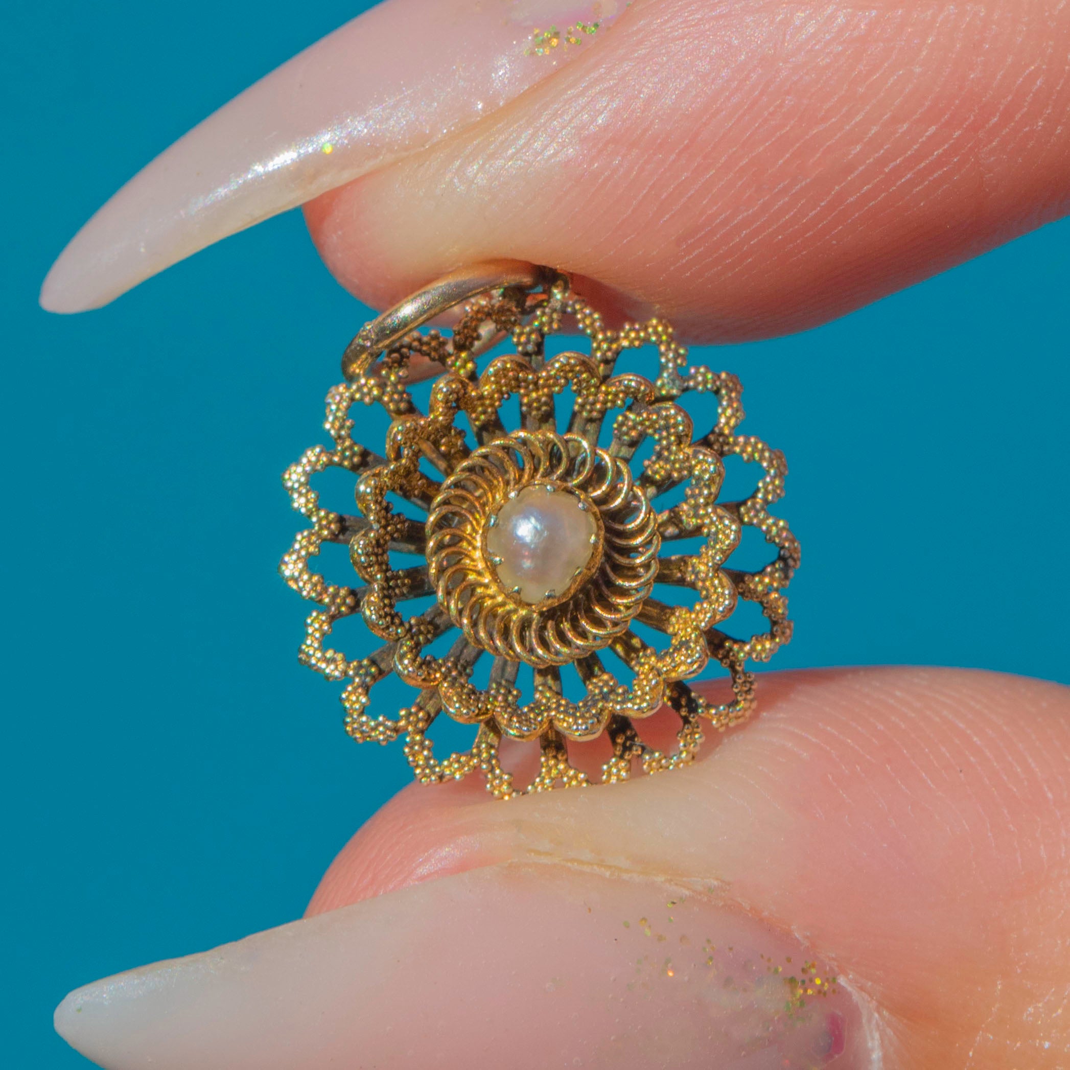 This exquisite Georgian flower charm is crafted from Pinchbeck, a highly prized antique alloy developed in the 18th century to resemble Gold. At the centre of the detailed openwork petals sits a glowing Natural Pearl, perfectly framed by delicate cannetille wirework.