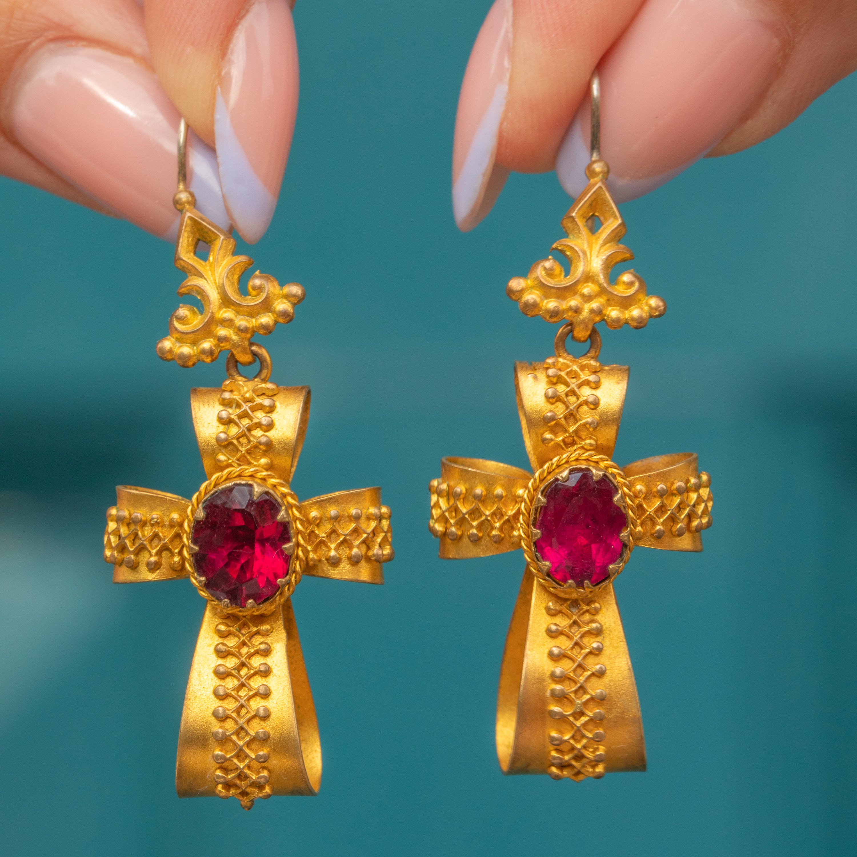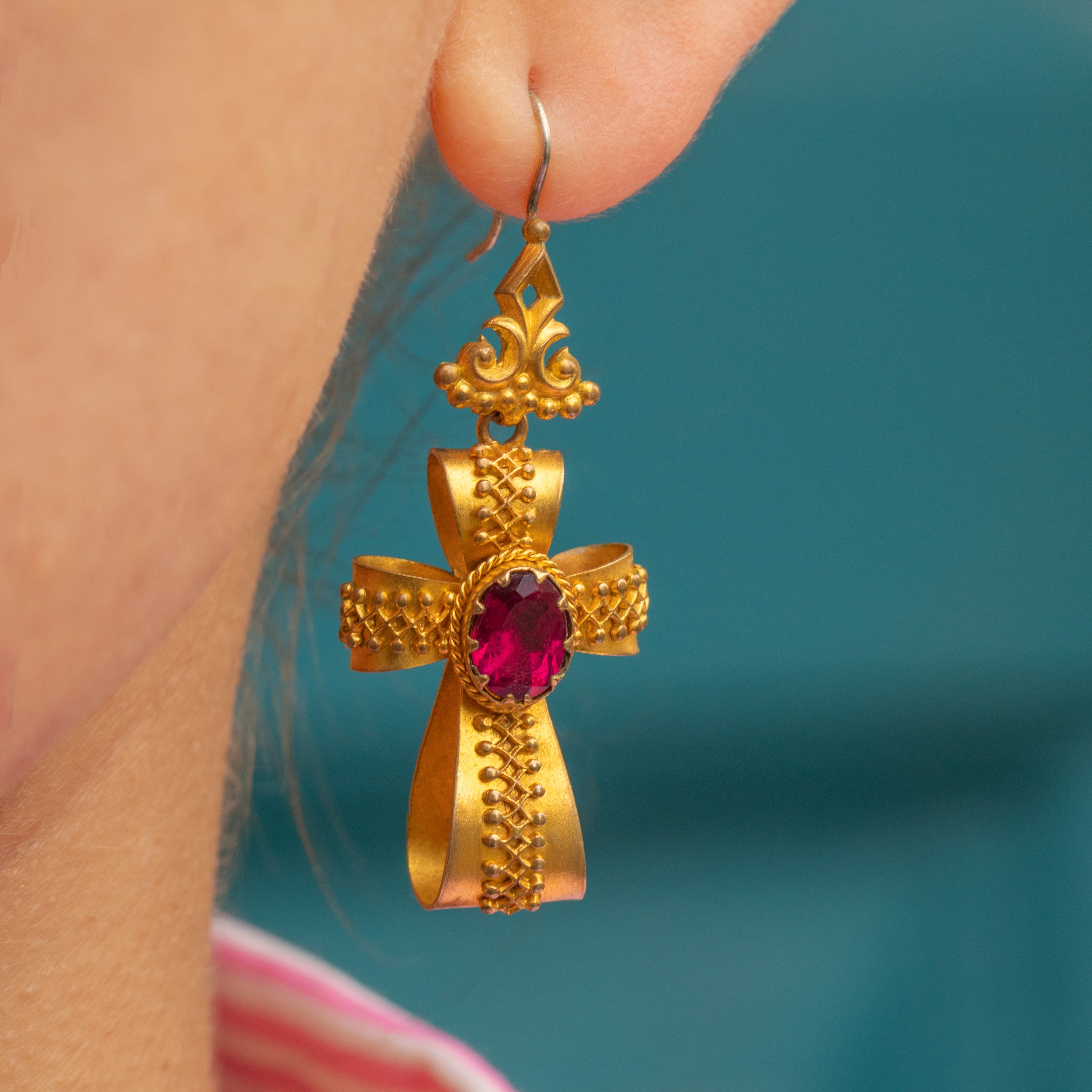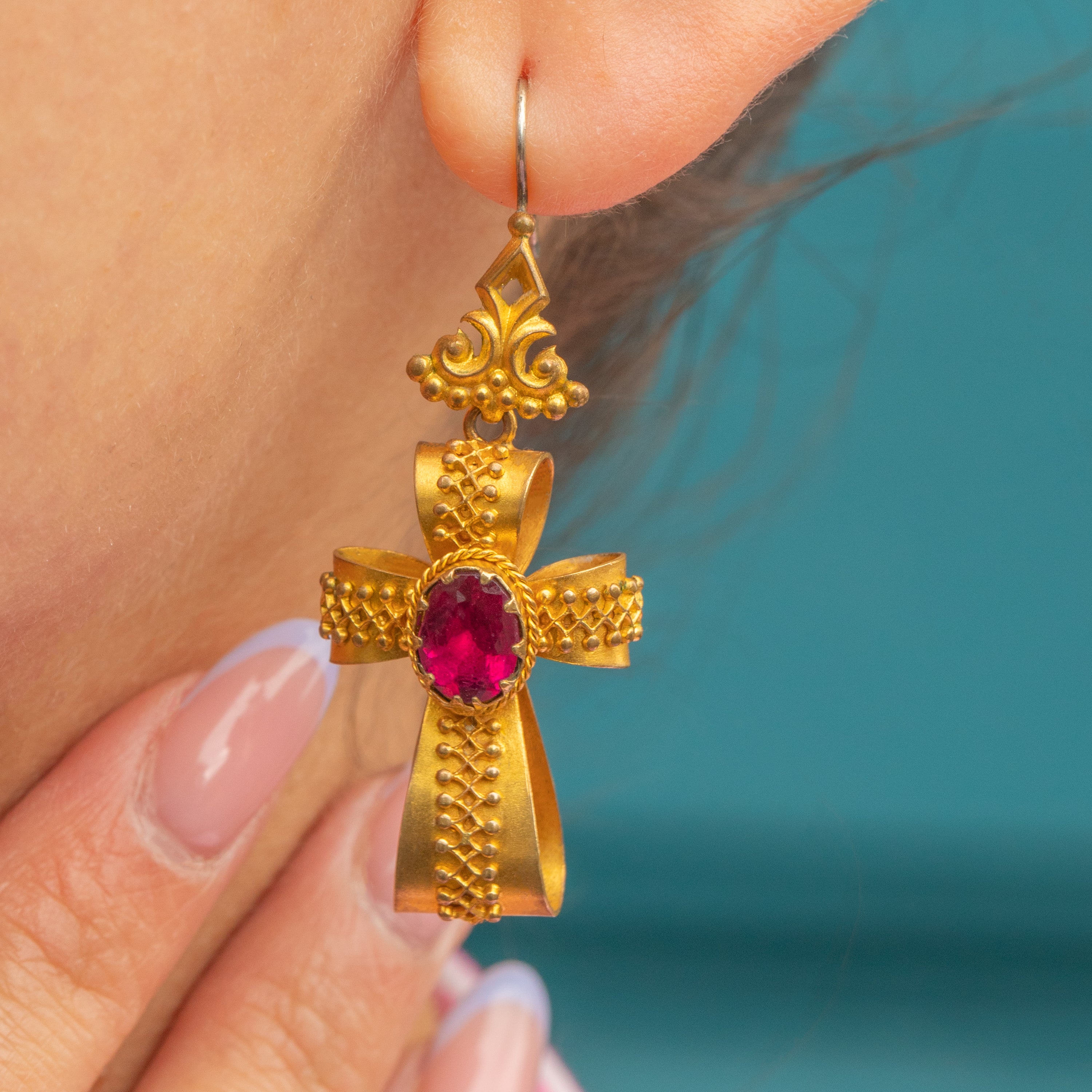Crafted from buttery warm pinchbeck, these large cross earrings each feature a vibrant red paste stone in their centre, radiating deep fuchsia hues as they catch the light. They are complemented beautifully by the golden hues of the pinchbeck, providing these Georgian earrings with a magnificent splendour.