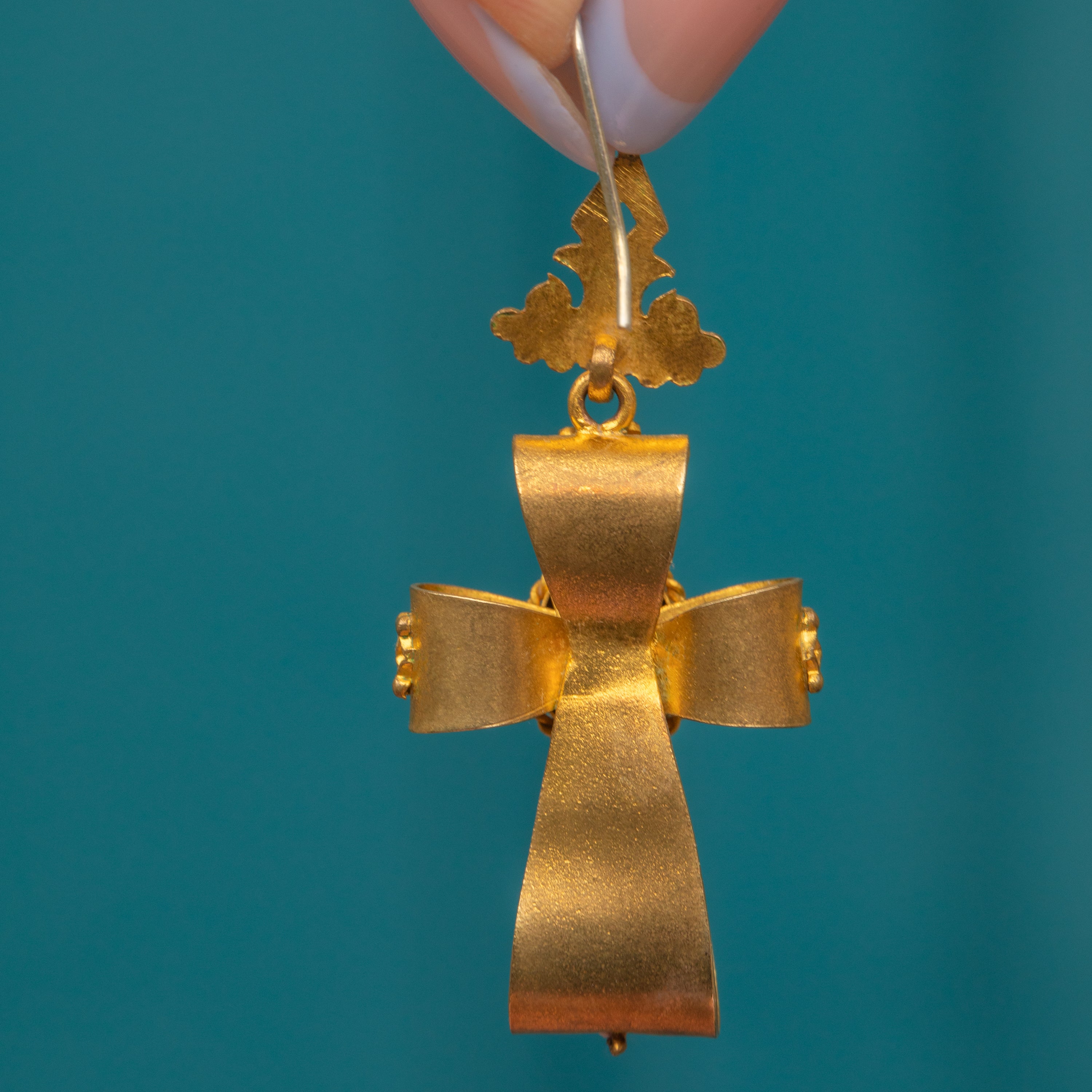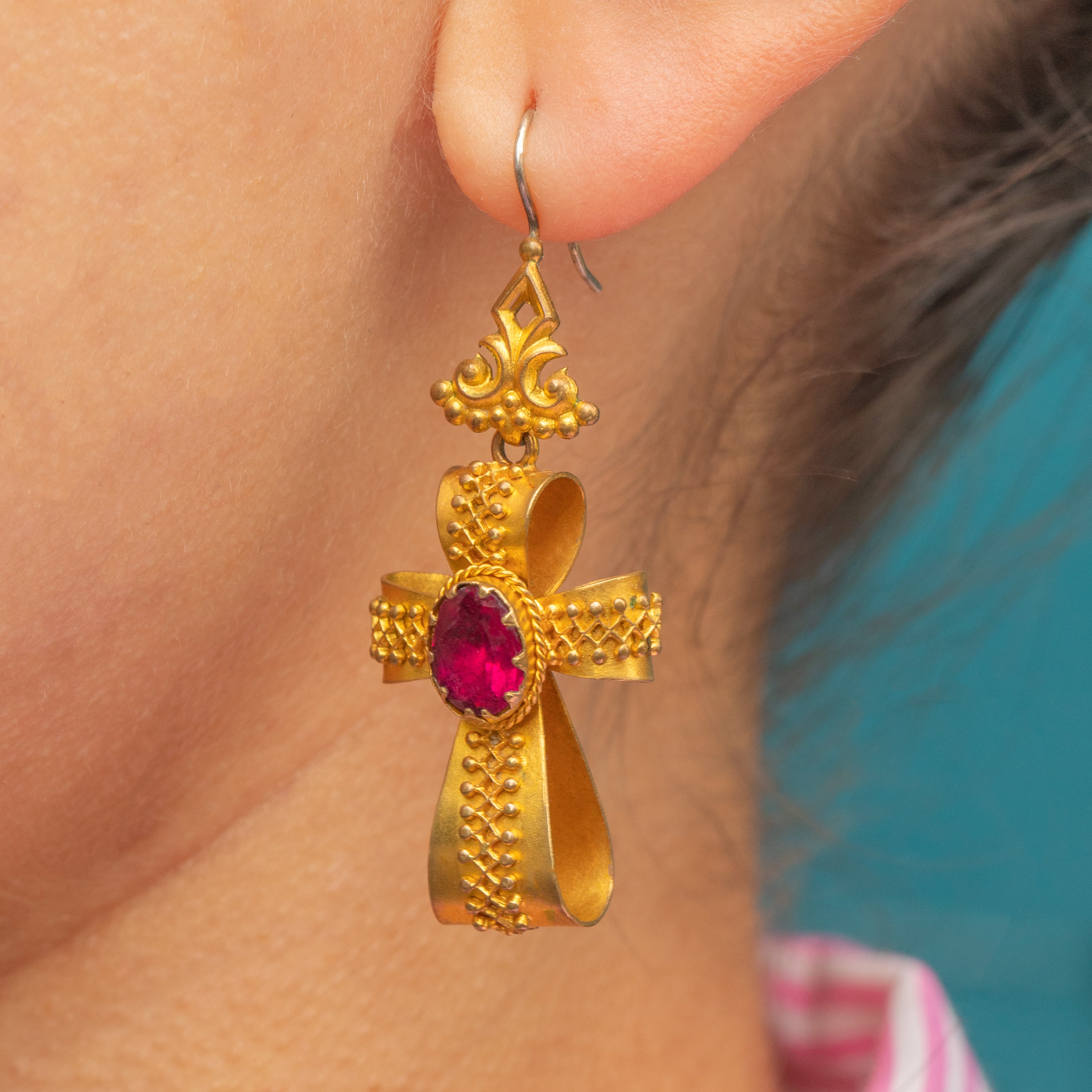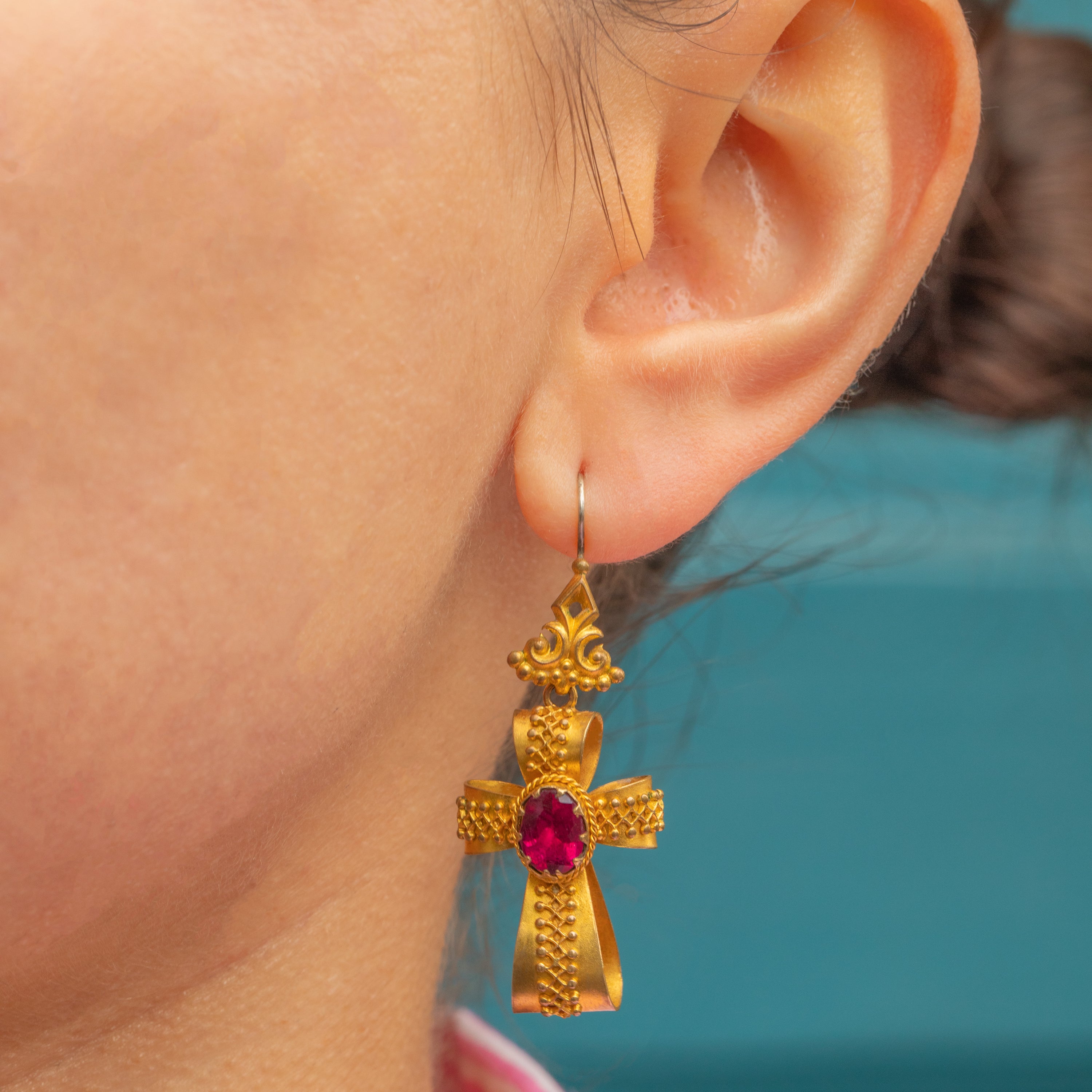 Crafted from buttery warm pinchbeck, these large cross earrings each feature a vibrant red paste stone in their centre, radiating deep fuchsia hues as they catch the light. They are complemented beautifully by the golden hues of the pinchbeck, providing these Georgian earrings with a magnificent splendour.