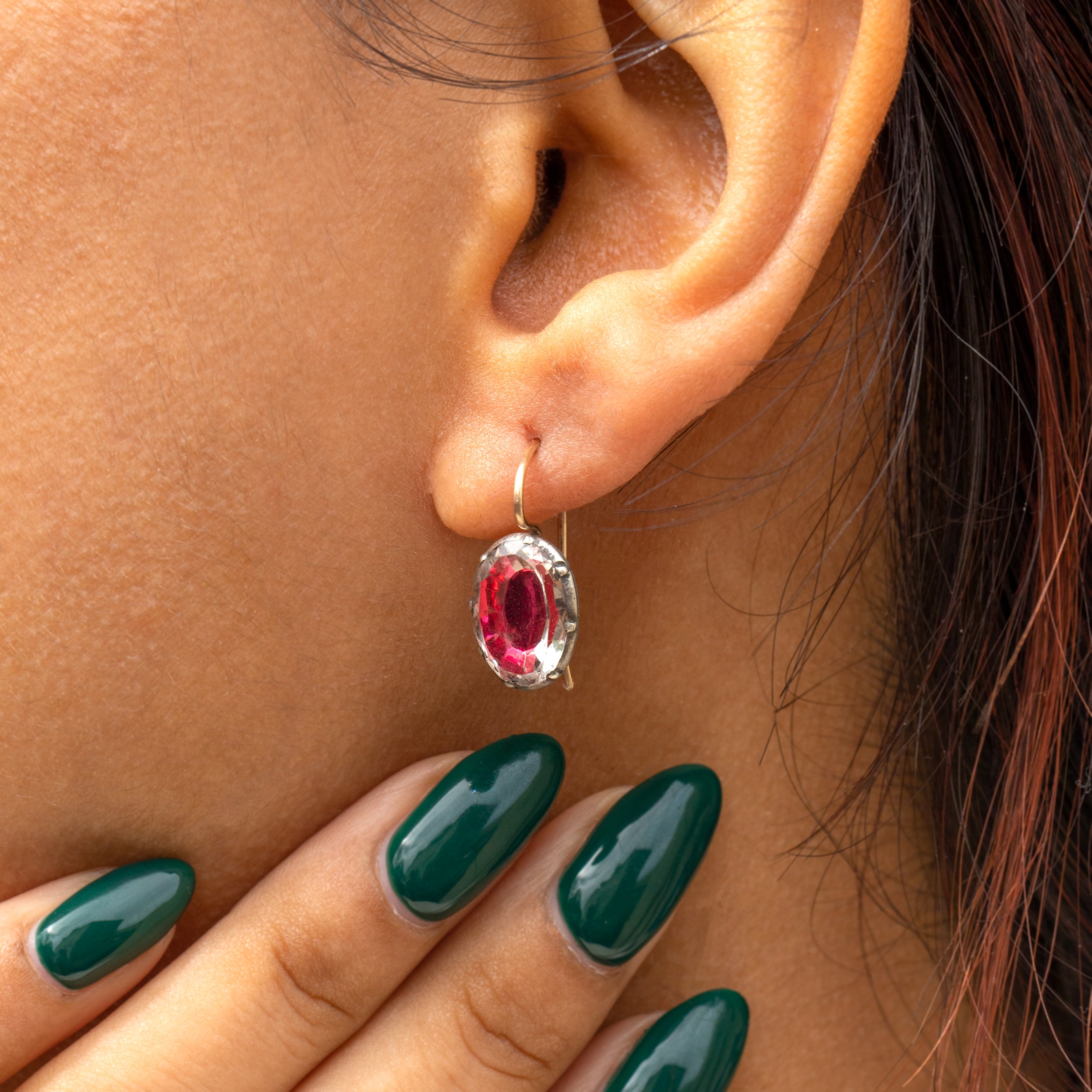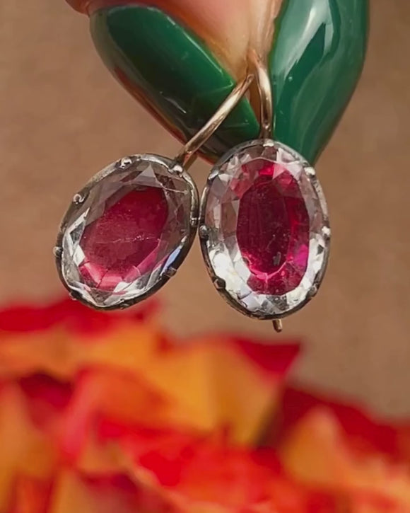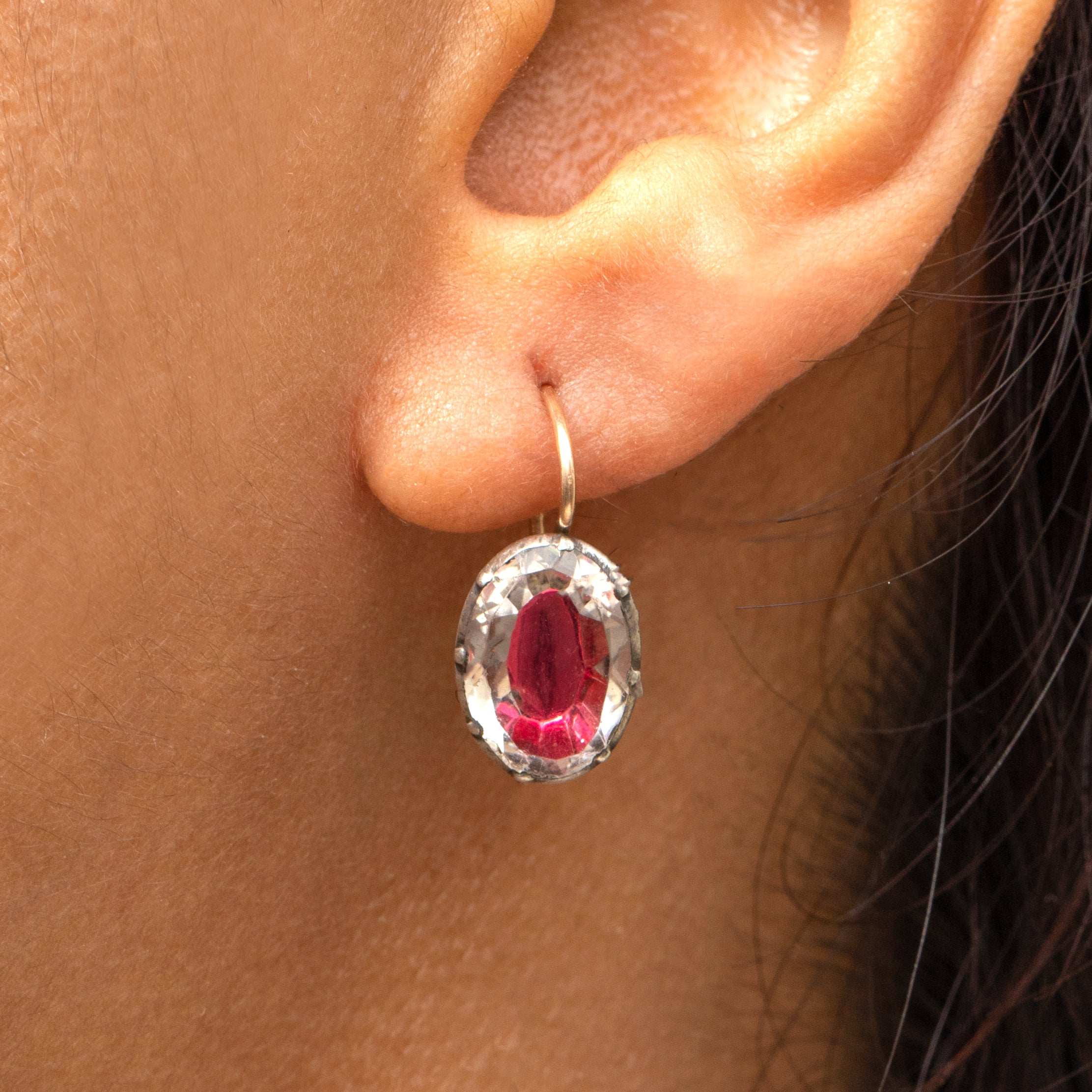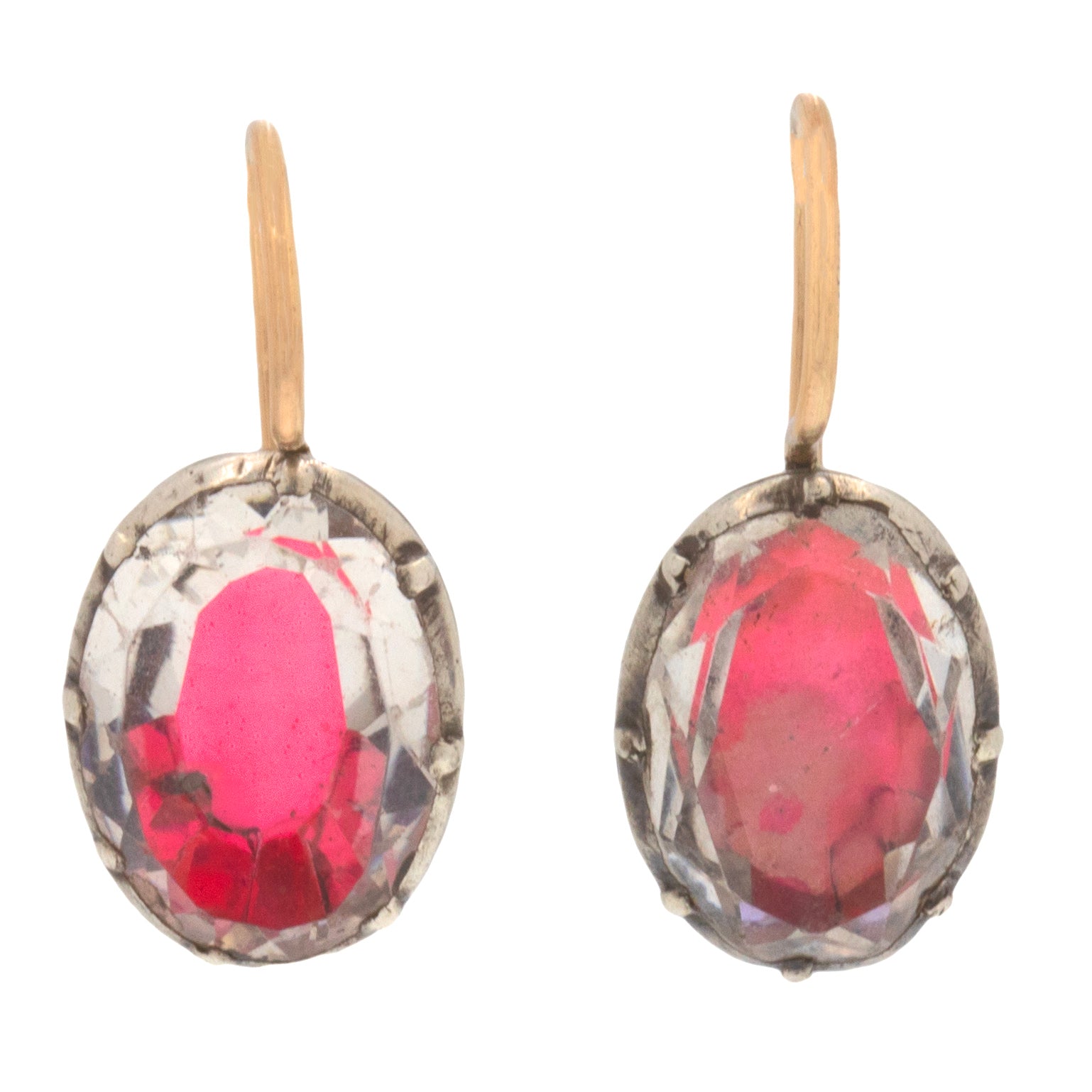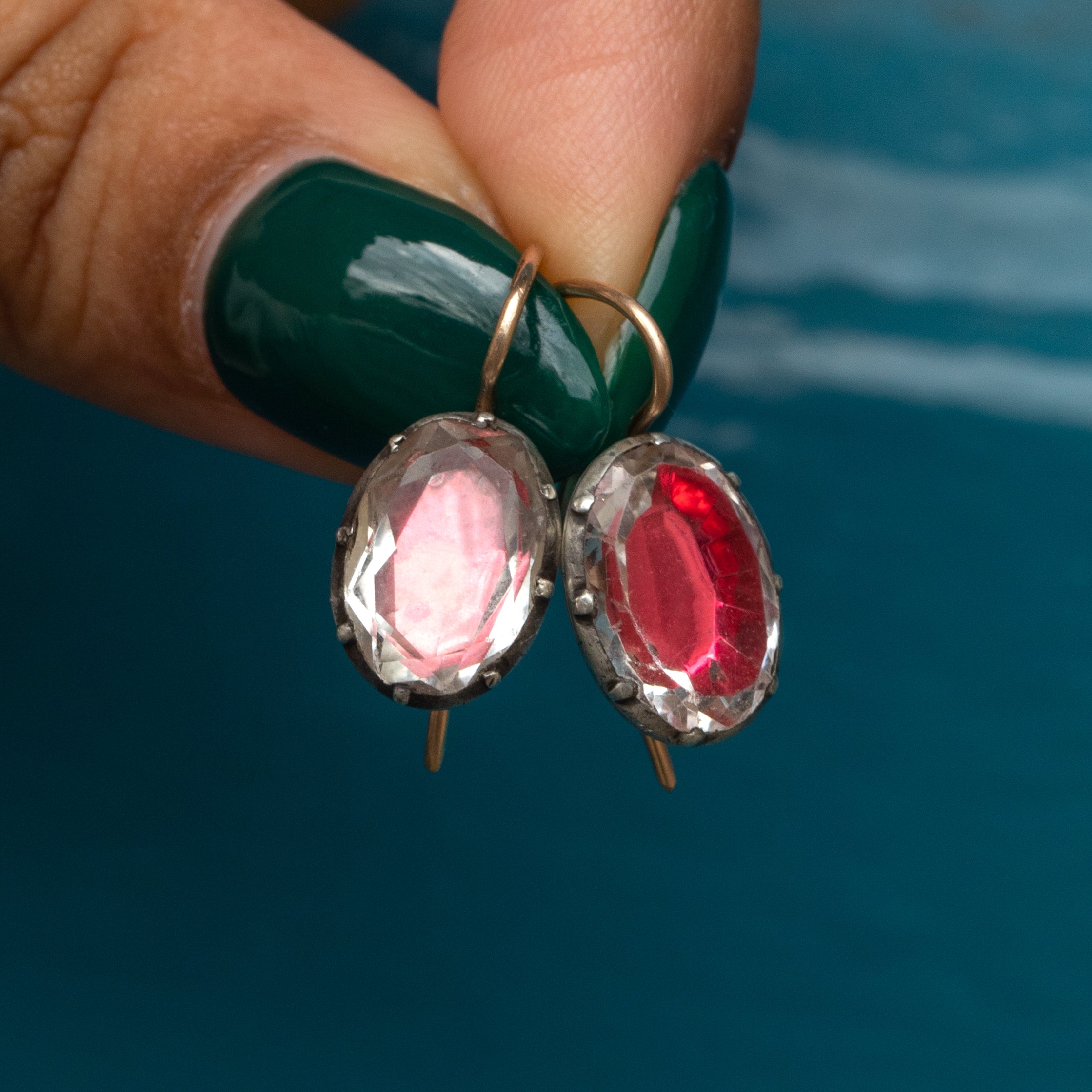 ジョージアン ピンク フォイルド ペースト オーバル ボタン イヤリング、9ct ゴールド フック