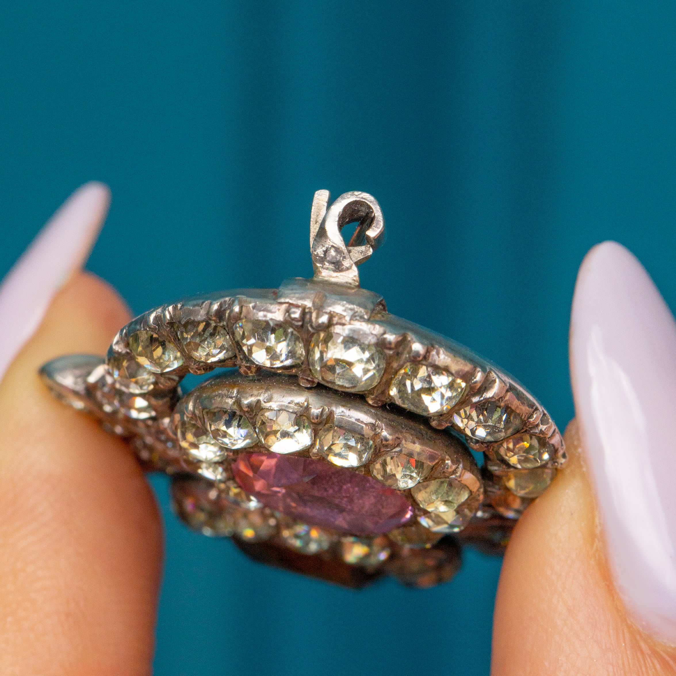 VERY GOOD. This Georgian Queen Anne pink Paste pendant is in very good condition. Ready to wear straight from the box, this beauty has soft domed backs with stunning Paste that are all securely set. This treasure does have some subtle wear on the back but once affixed to your jacket lapel this cannot be seen!
