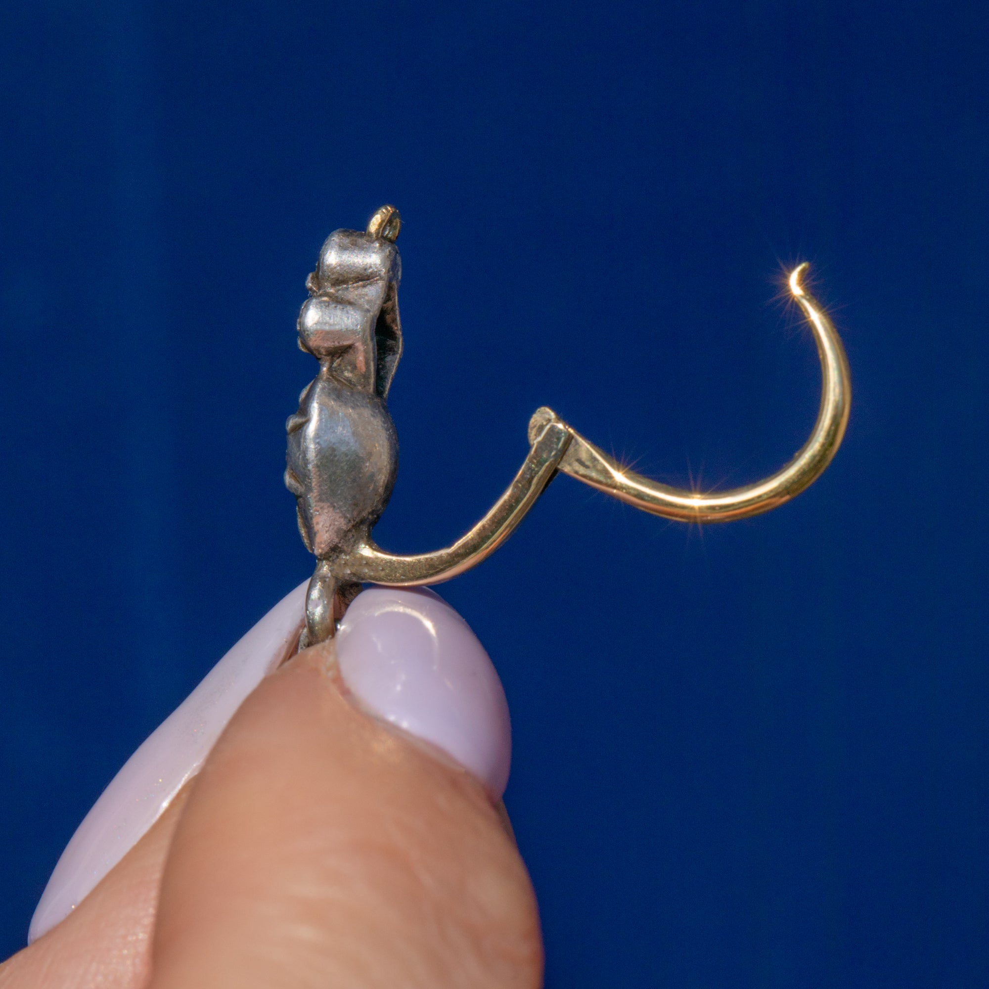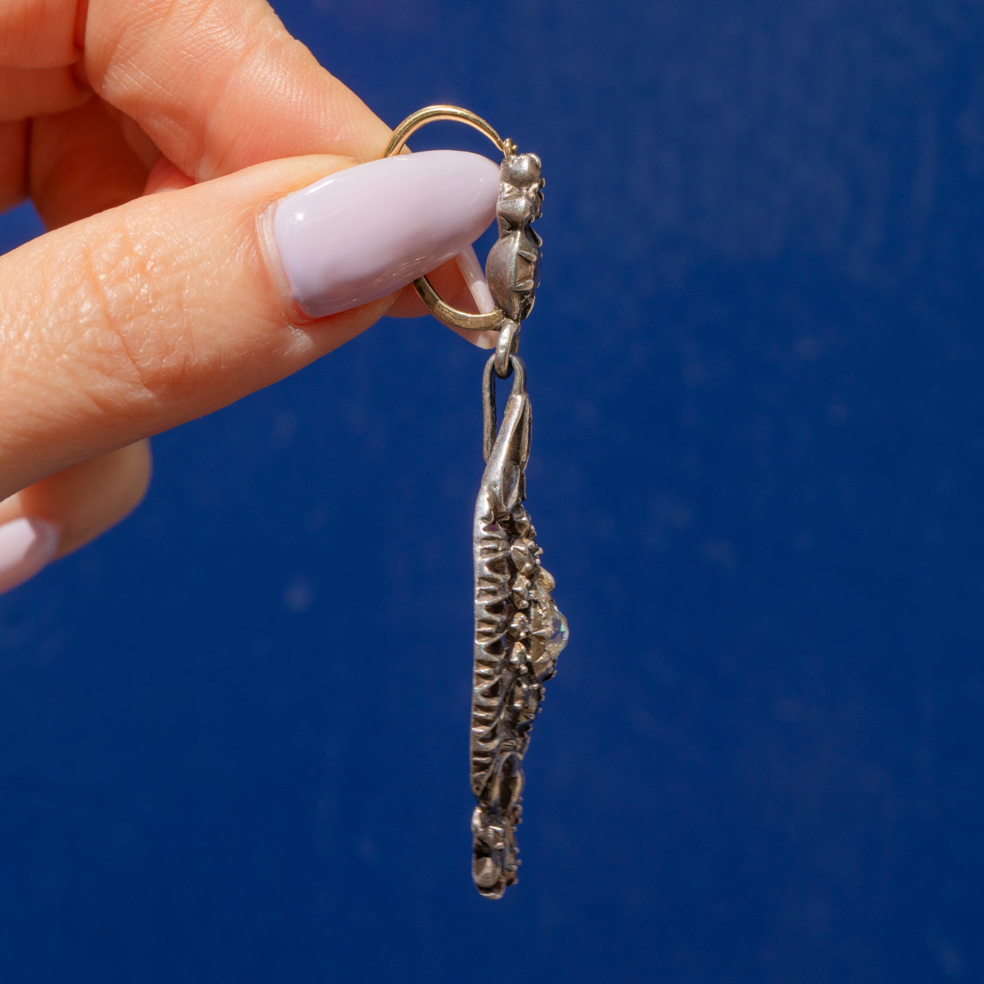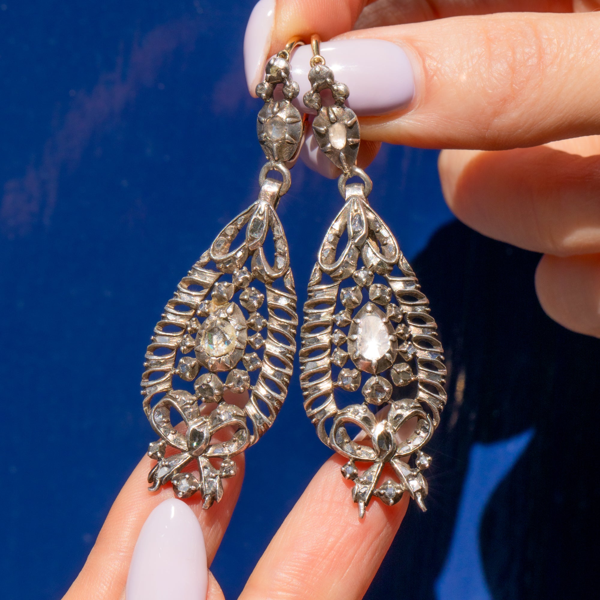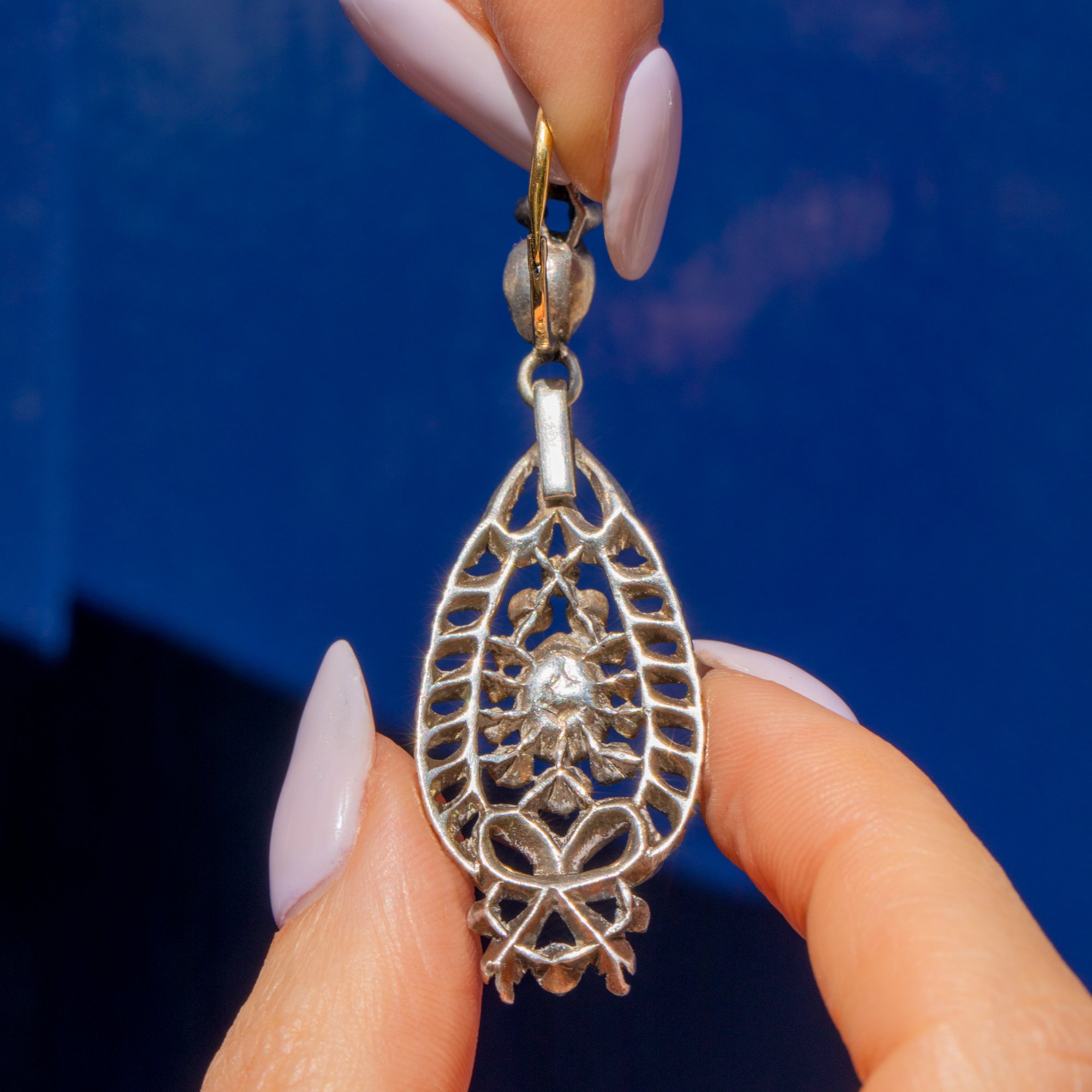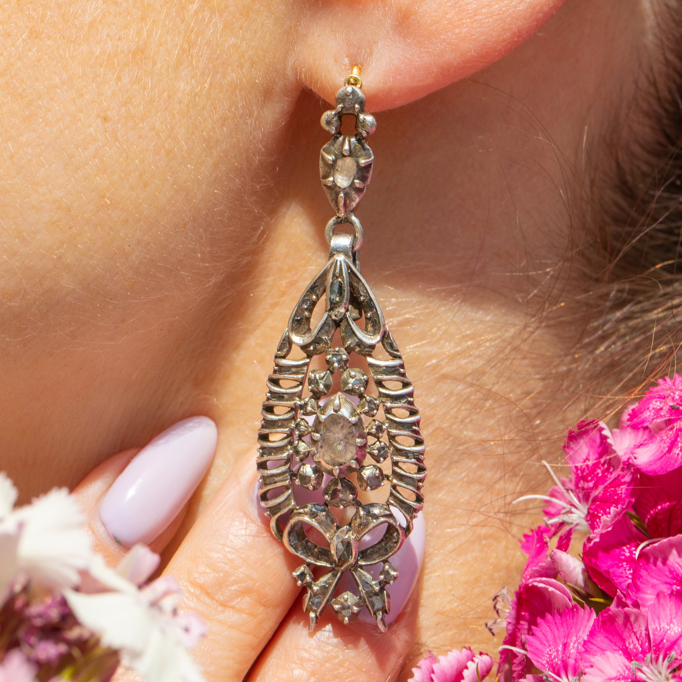 These earrings have more than one function as they can be worn in their full splendour making quite the statement, or you could remove the bottom sections and wear them as dainty antique delights! The earrings have been hand-crafted from Sterling Silver and come complete with solid 18ct Gold lever backs. Sprinkled with peppery antique rose-cut Diamonds that sparkle impeccably, these stand-out antique earrings will make a romantic choice for your collection!