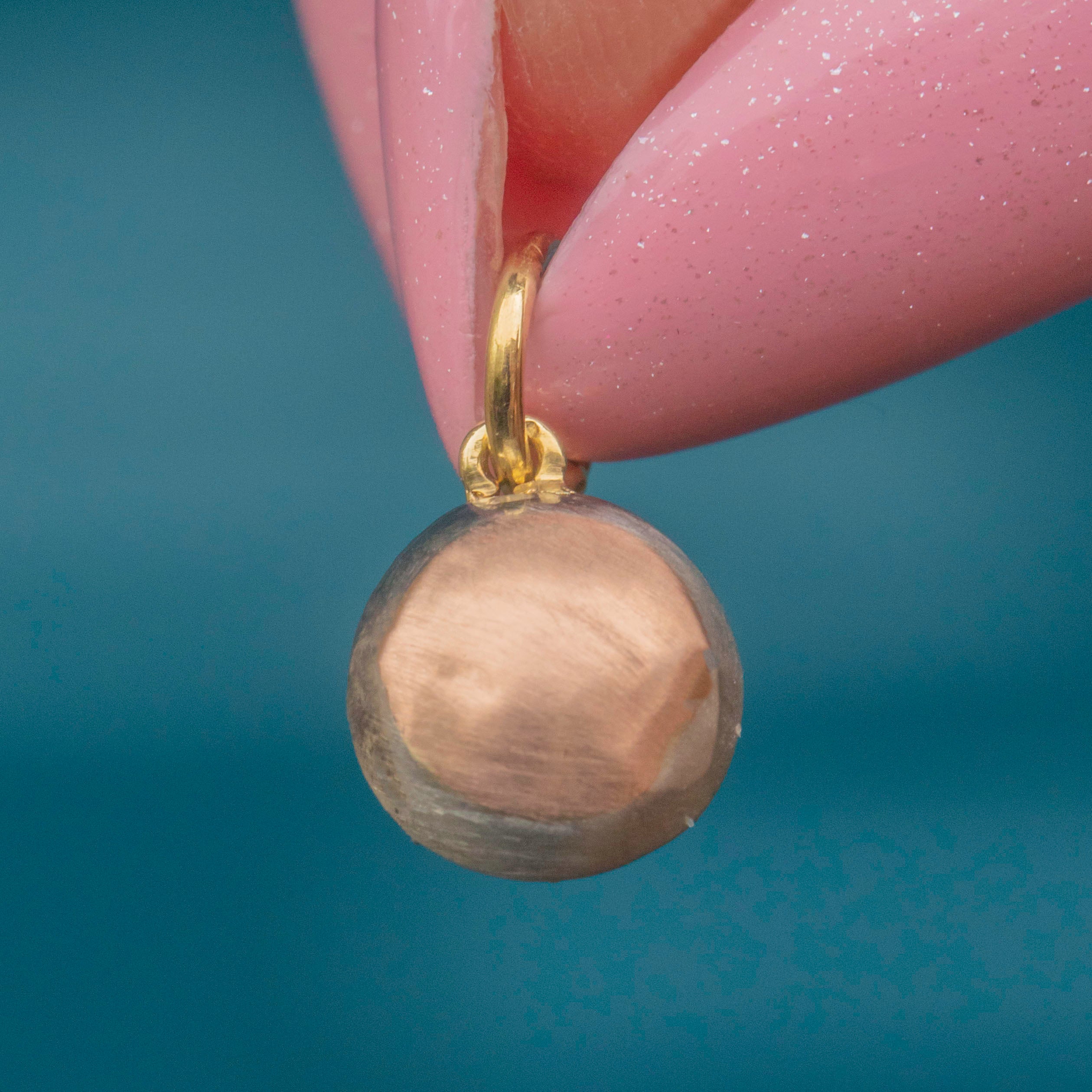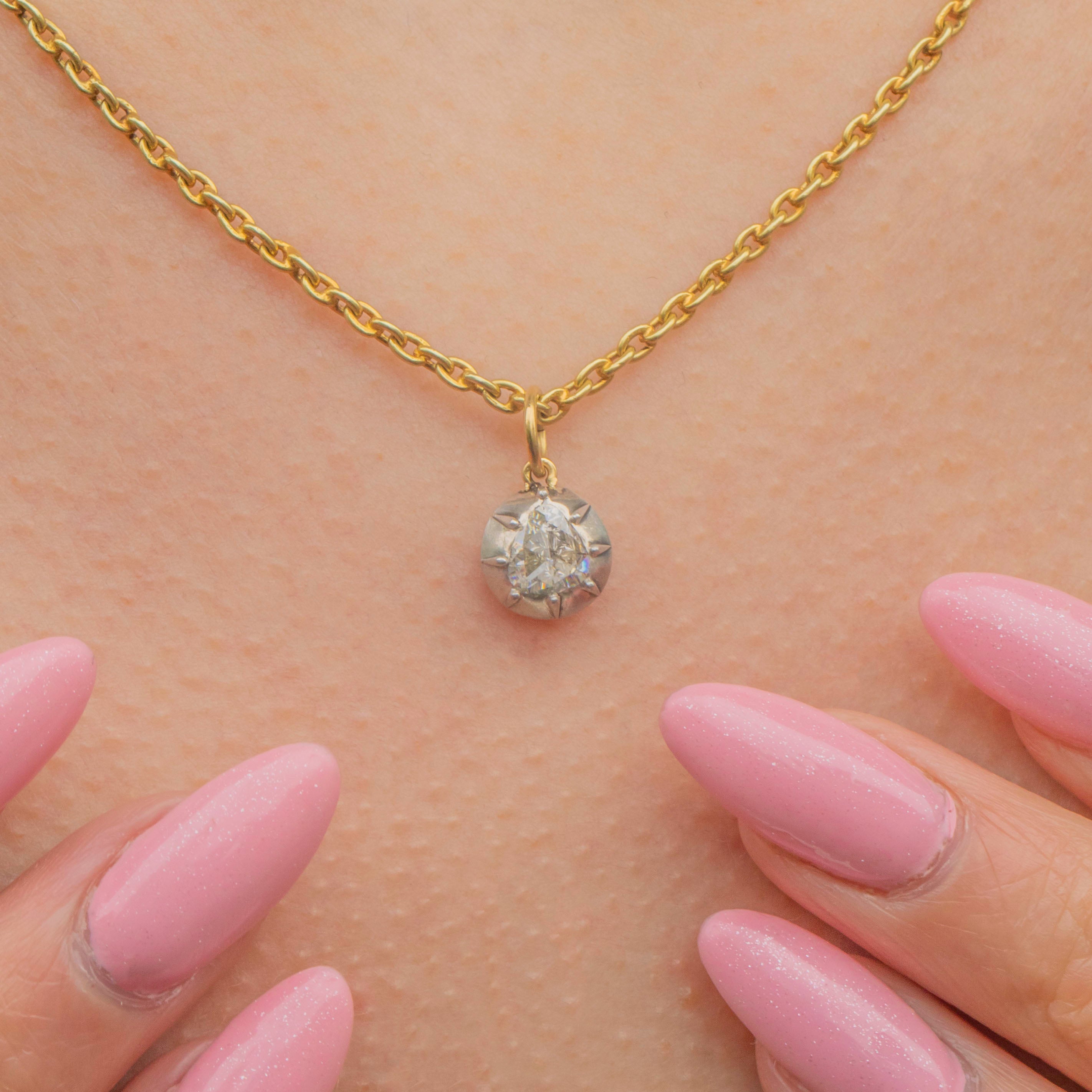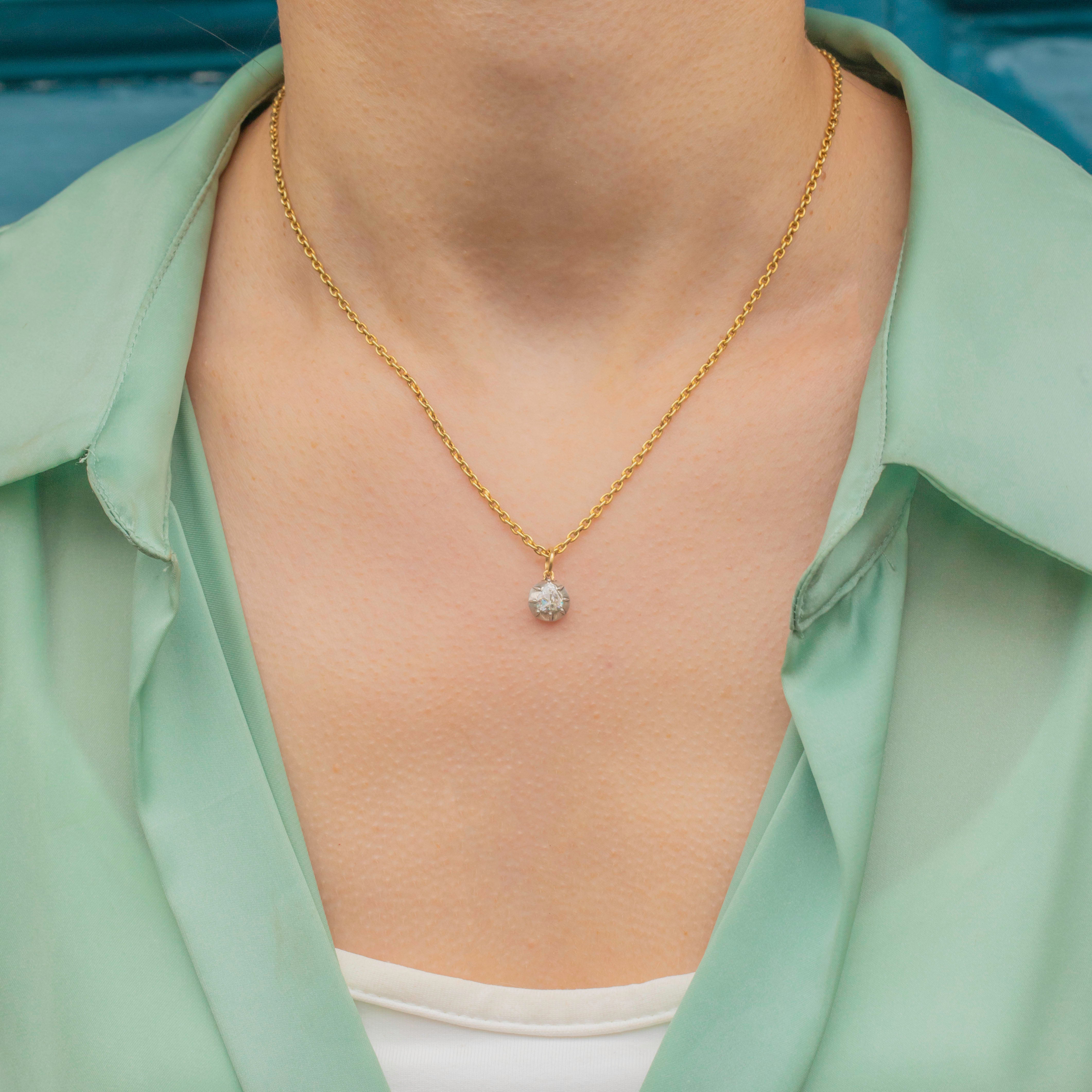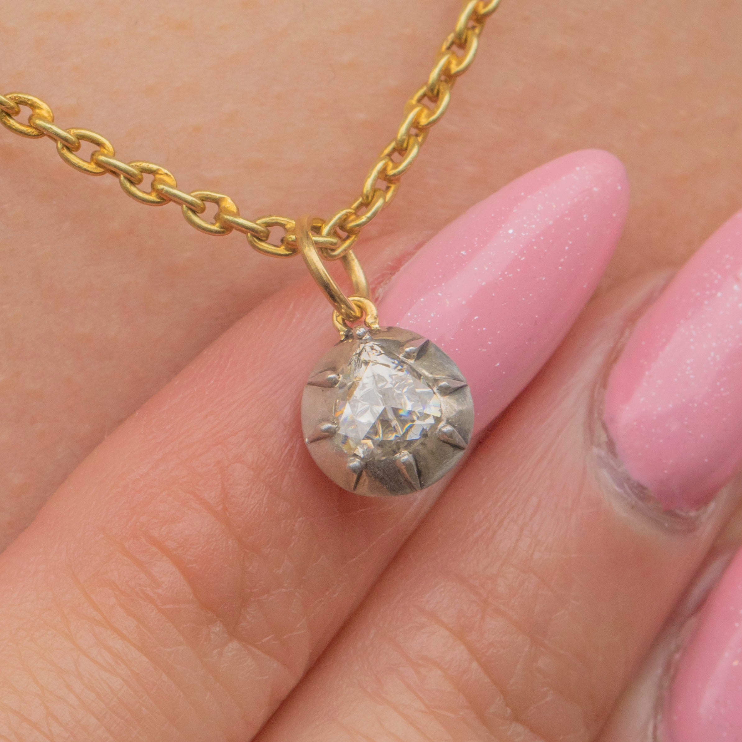 VERY GOOD: This Georgian rose-cut Diamond pendant is in very good condition. The Diamond is secure in its collet setting, sparkling beautifully with no chips or abrasions. There are some marks on the back of the pendant from where this piece has been converted from something bigger, but the back of the charm is smooth and comfortable to wear.