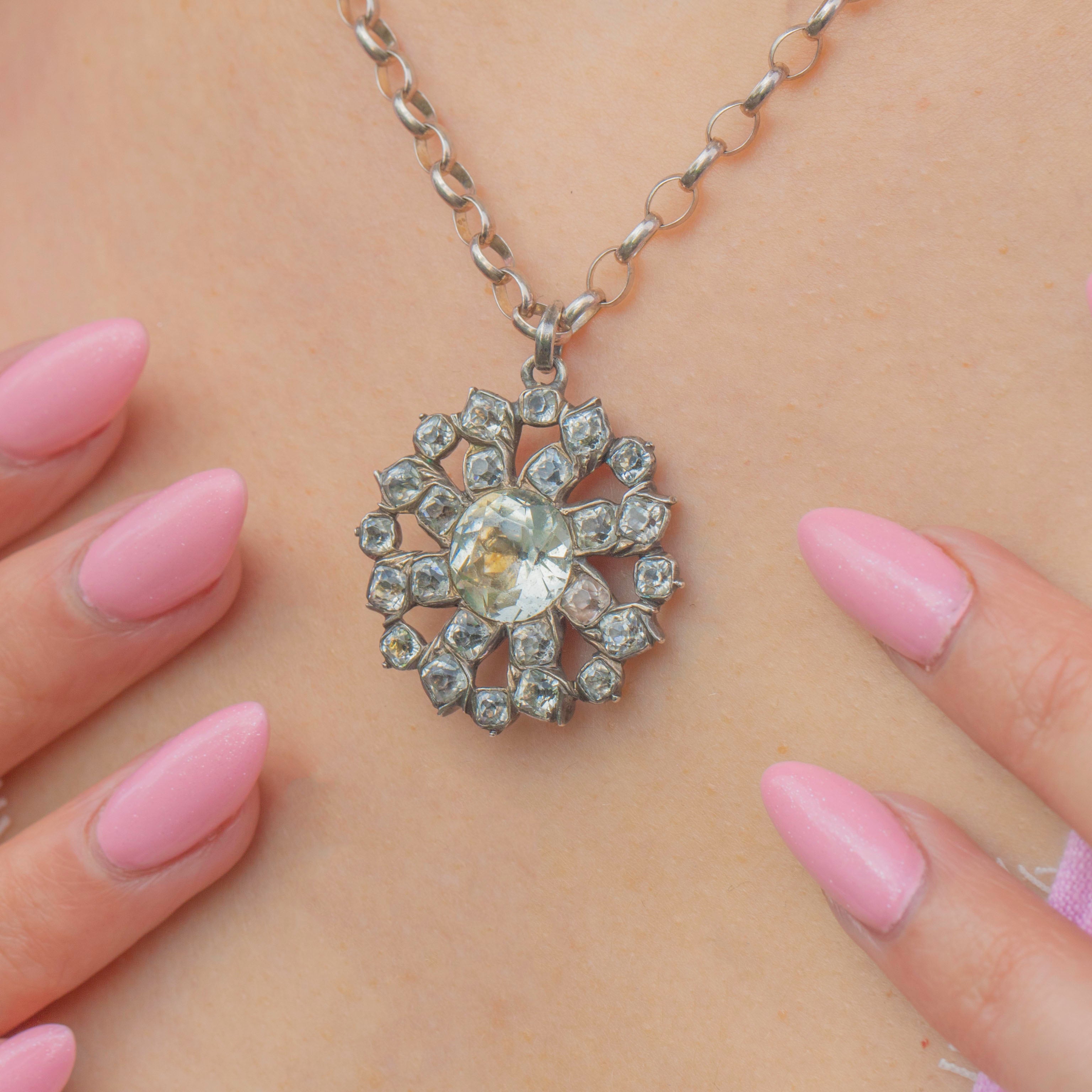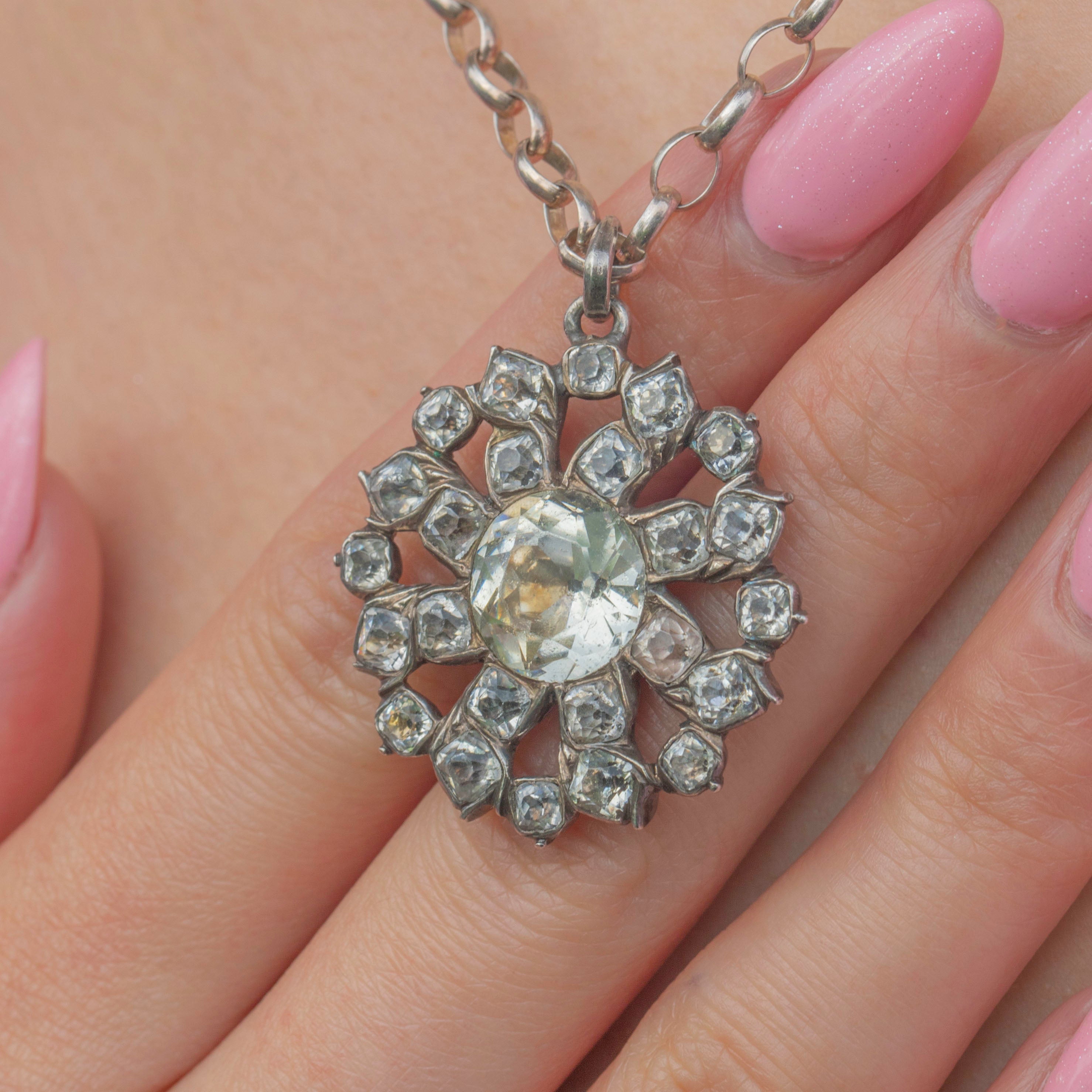 Add a glimmering accent to your décolletage with this striking Georgian Silver Black Dot Paste cluster pendant! Arranged into a unique celestial design, this Georgian pendant is inlaid with a generous selection of Diamond Paste, their brilliance enhanced by the moody patina accrued within their Silver settings.