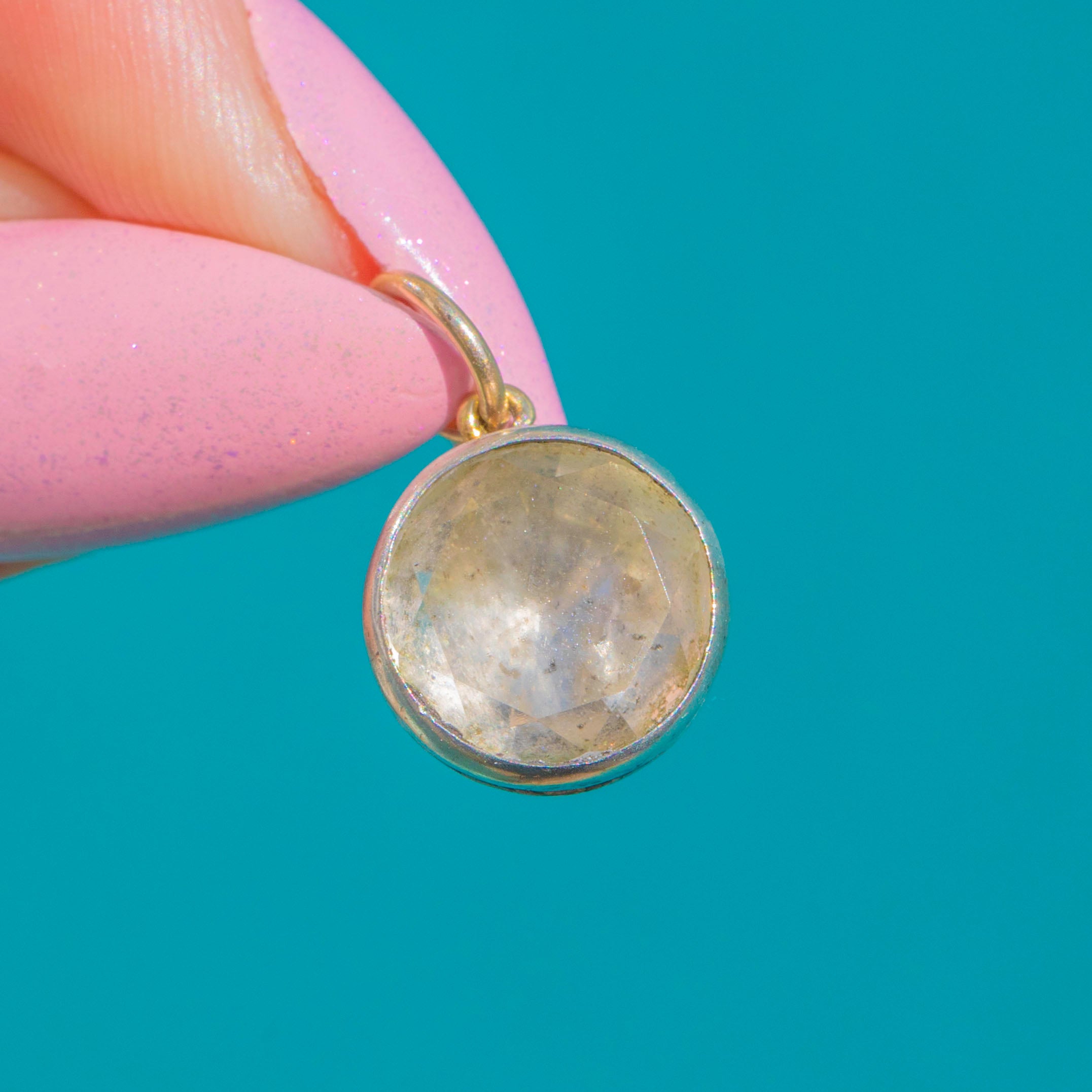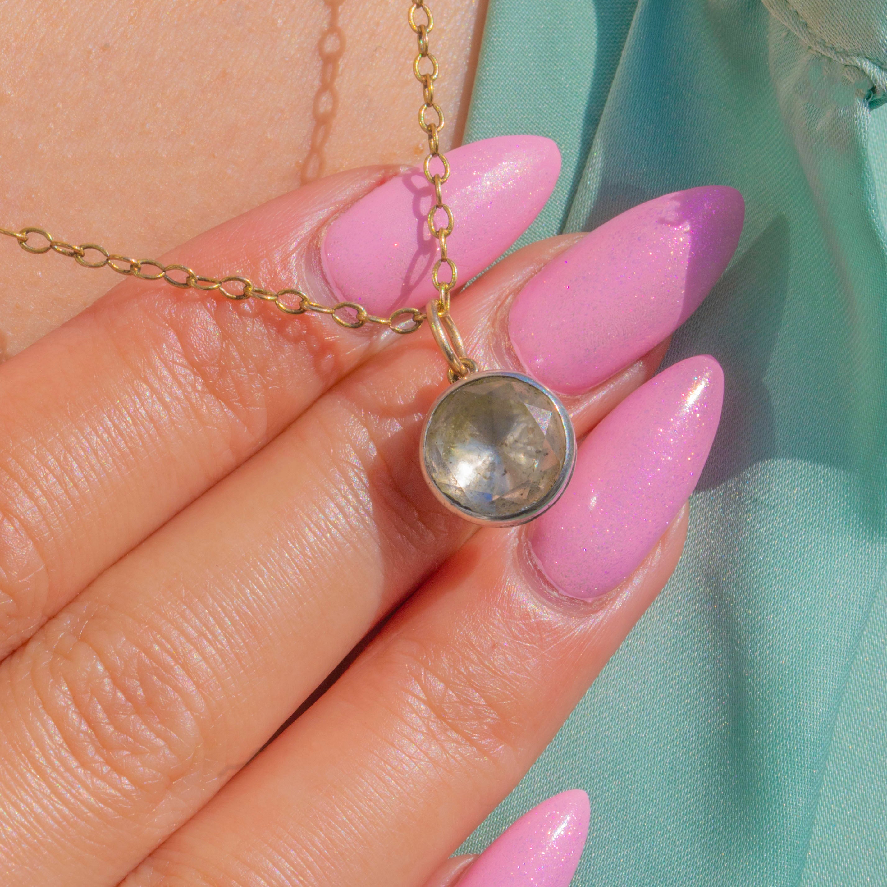 憧れのGeorgianの魅力が輝く、こちらの小ぶりなフォイルドクォーツペンダントは、明るくシルバーのような光沢を放ちます。ラウンドカットのクォーツは、輝きを引き立てるクローズドバックのシルバーベゼルにセットされ、端正な9ctゴールドのジャンプリングが洗練されたツートーンのアクセントを添えています。ミニマルでエレガントなデザインは、時代を超えて愛されるソリテール。日常使いにも最適な逸品です。