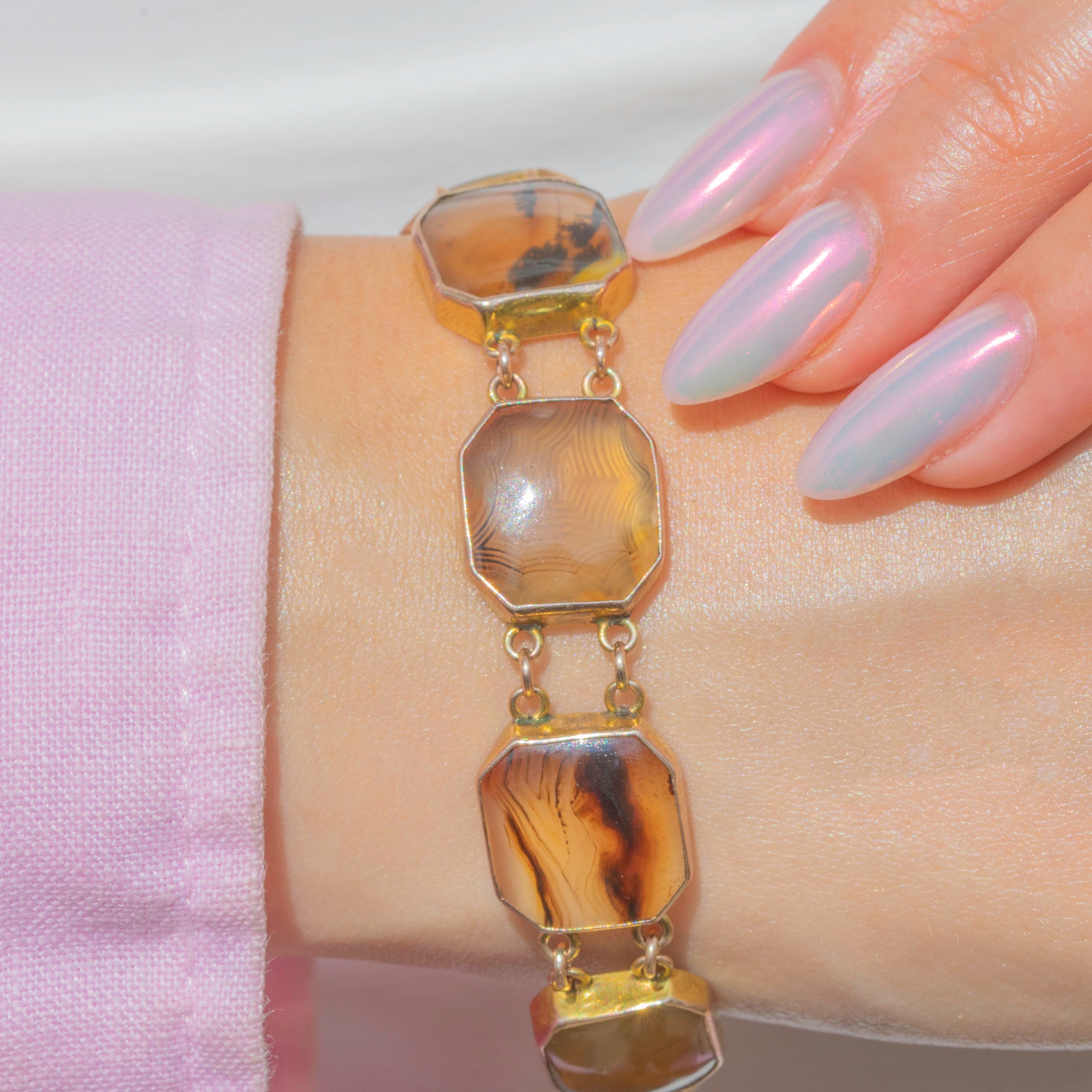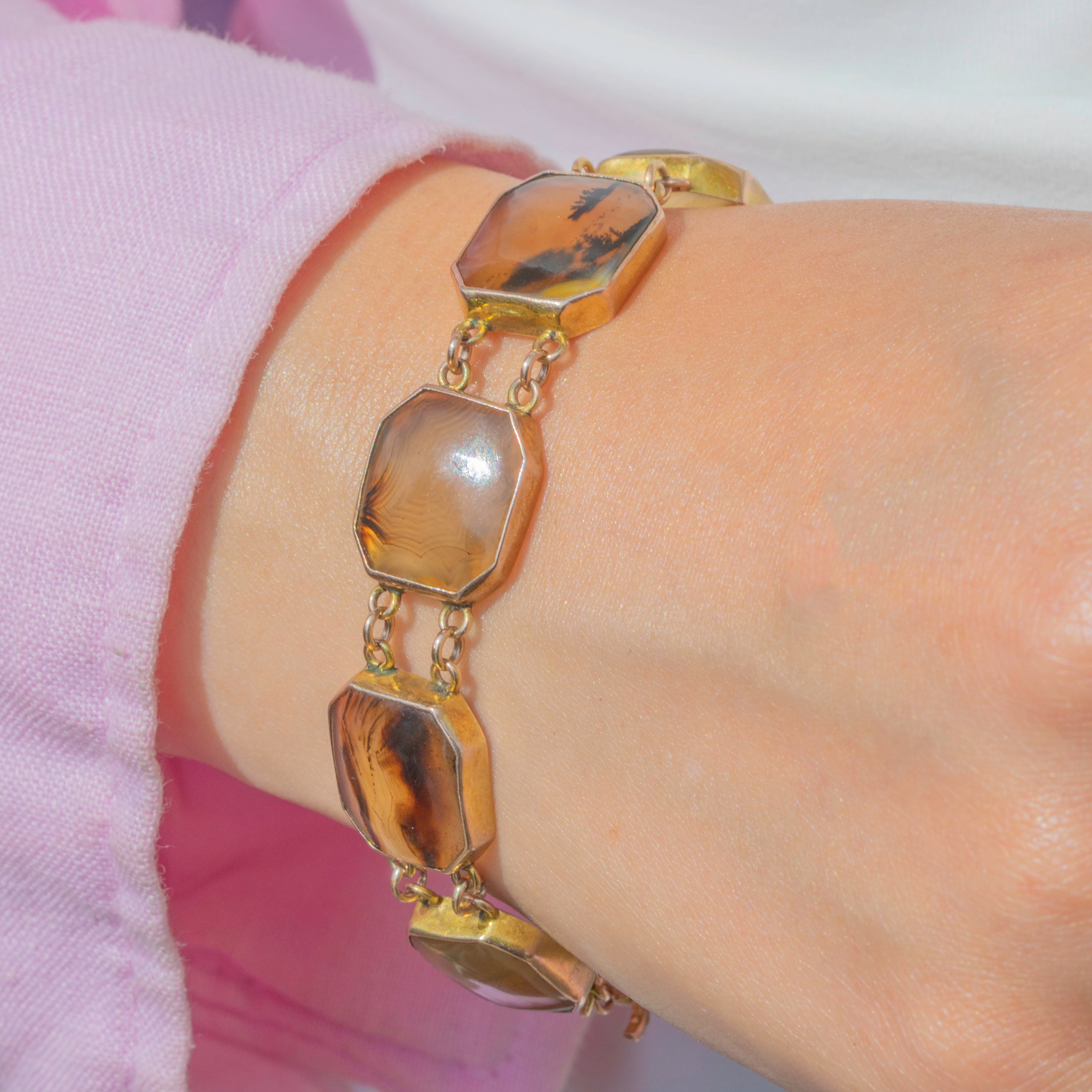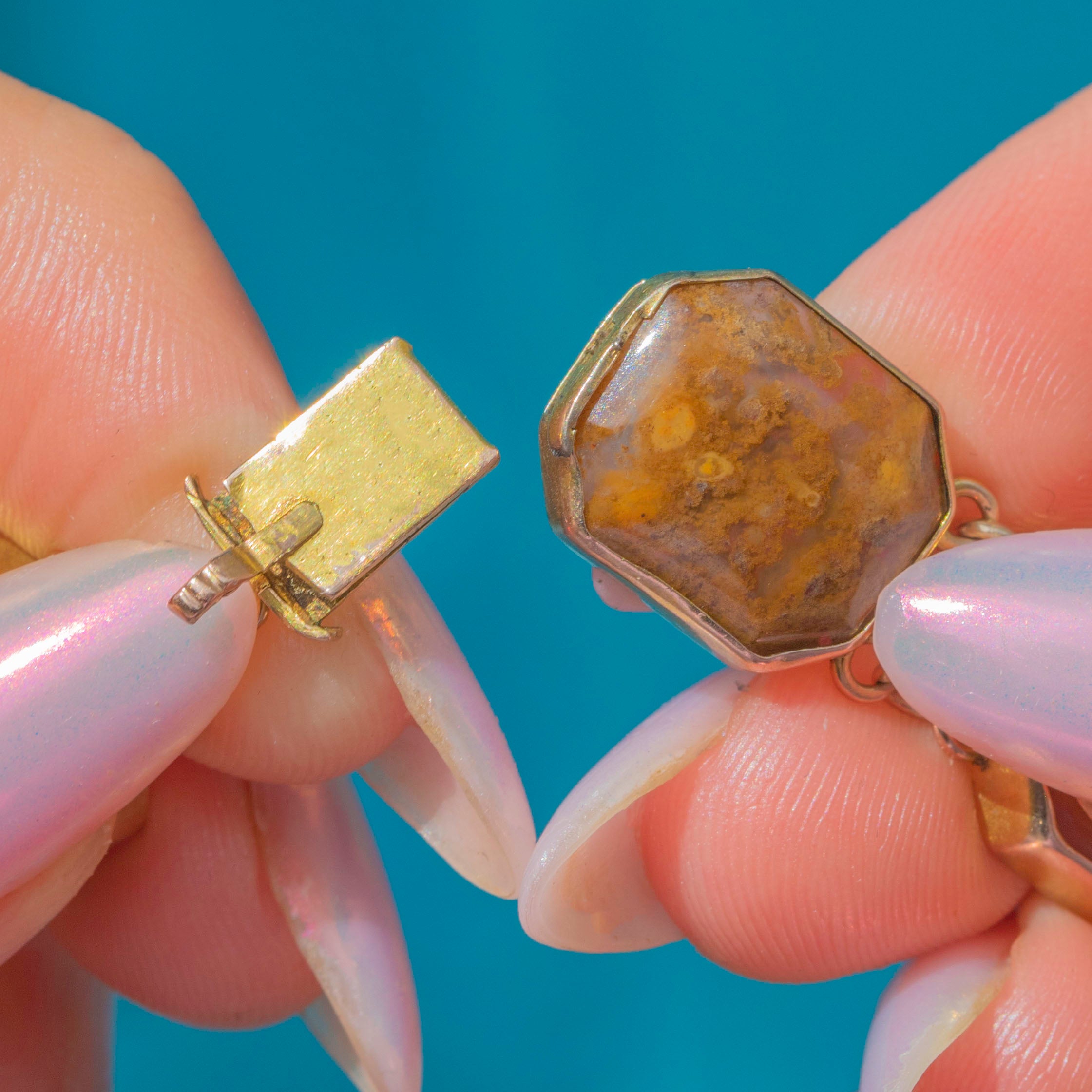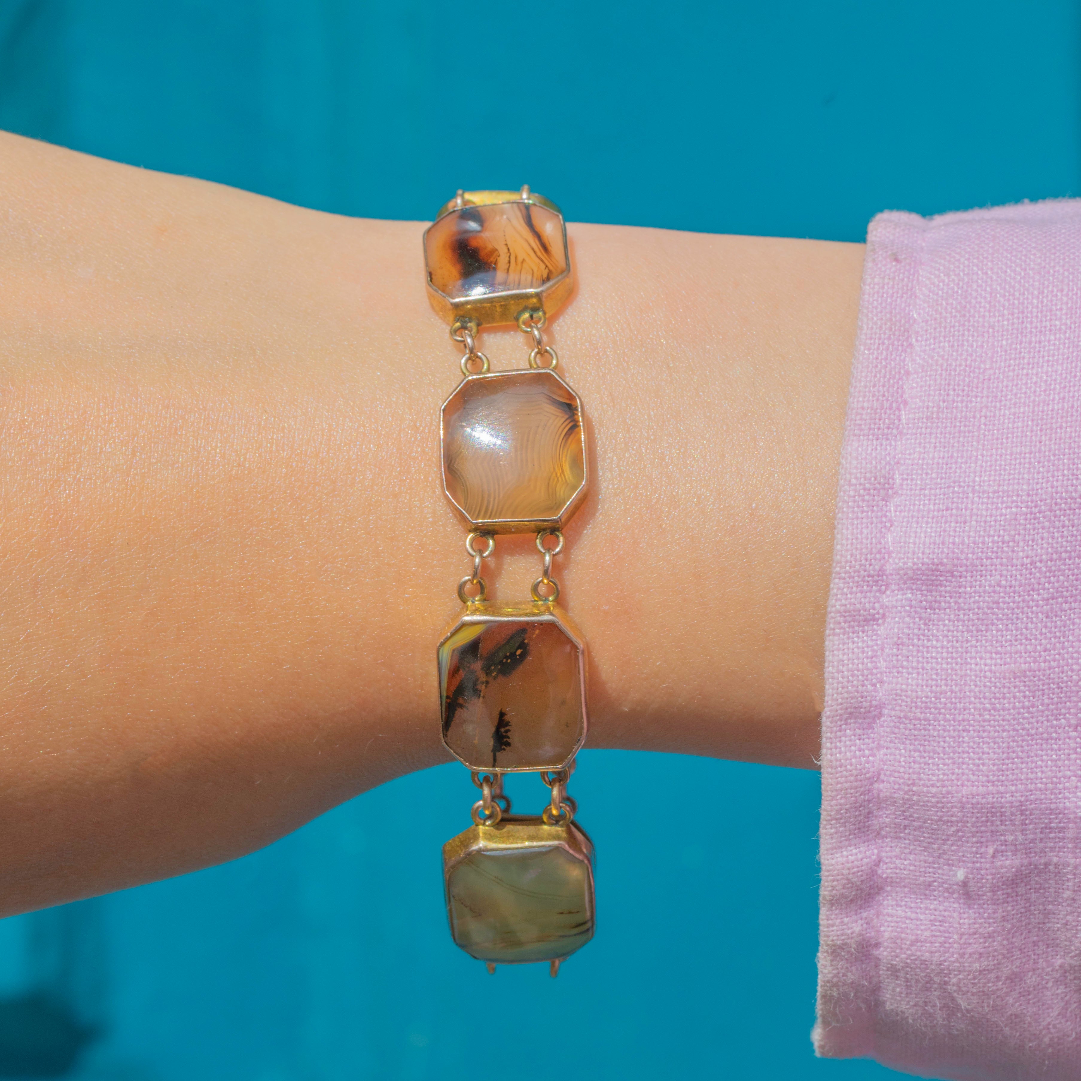 An exquisite Georgian panel bracelet composed of sculptural octagonal Dendritic Agate cabochons framed in warm 9ct Gold. Each stone reveals evocative “landscape” inclusions and delicate banding, with natural hues that move from honeyed amber to rich brown—every panel a miniature tableau of nature’s artistry.