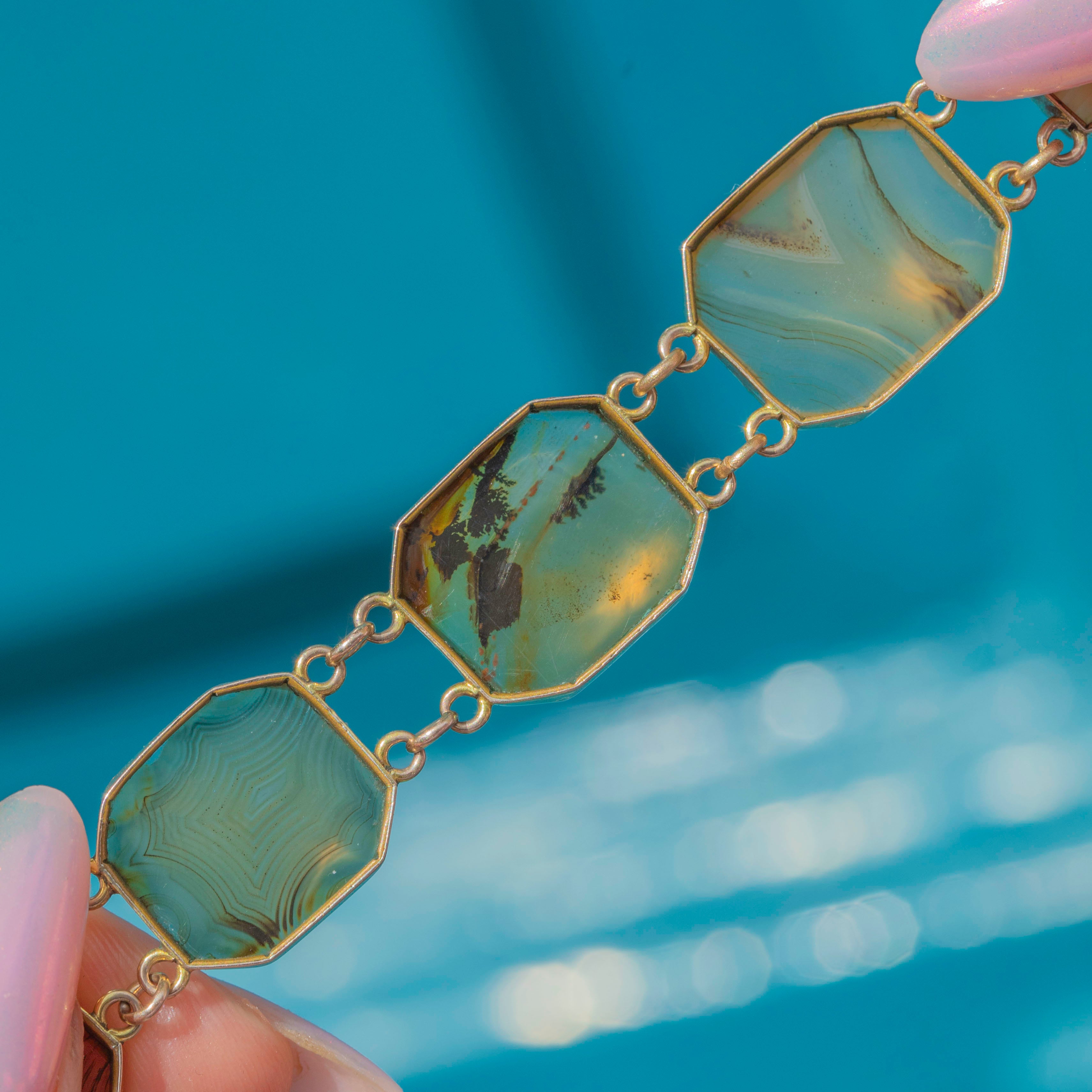 EXCELLENT: The Dendritic Agates are smoothly polished and free from chips, with only the most minor surface wear visible under magnification. The 9ct Gold bezels are secure with a gentle, even patina; articulation is smooth and the box/tongue clasp fastens securely.